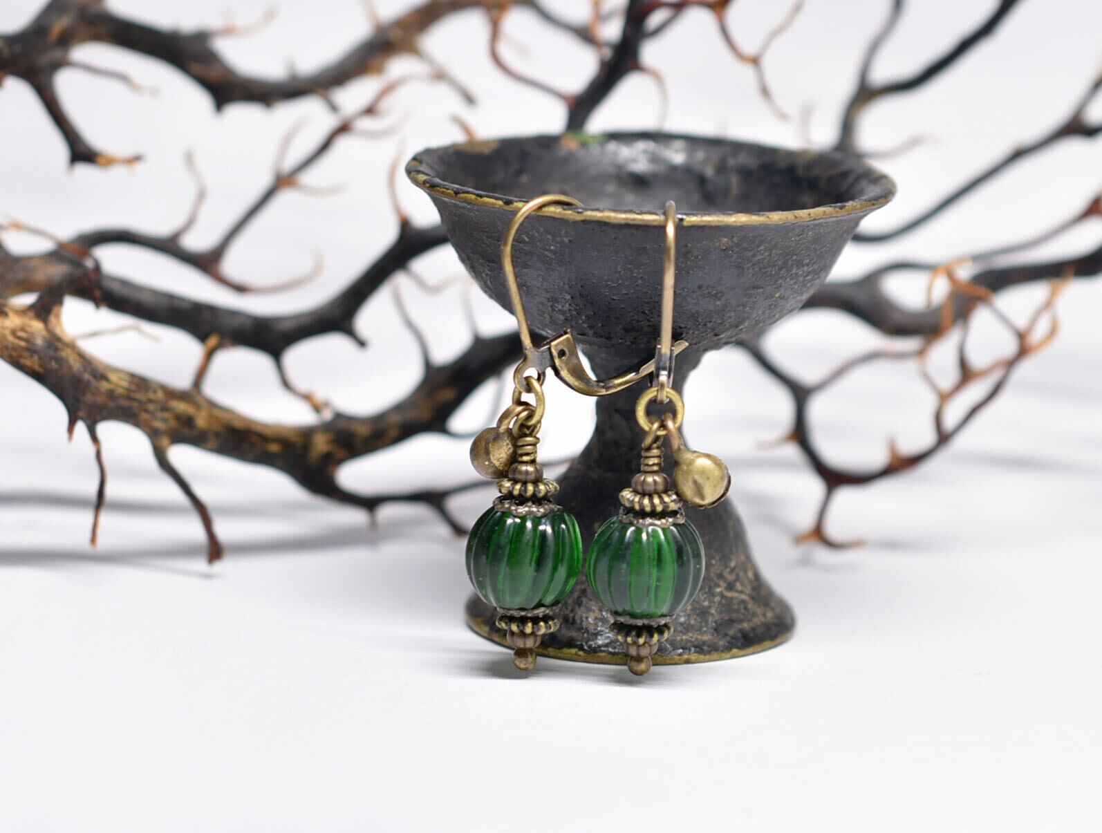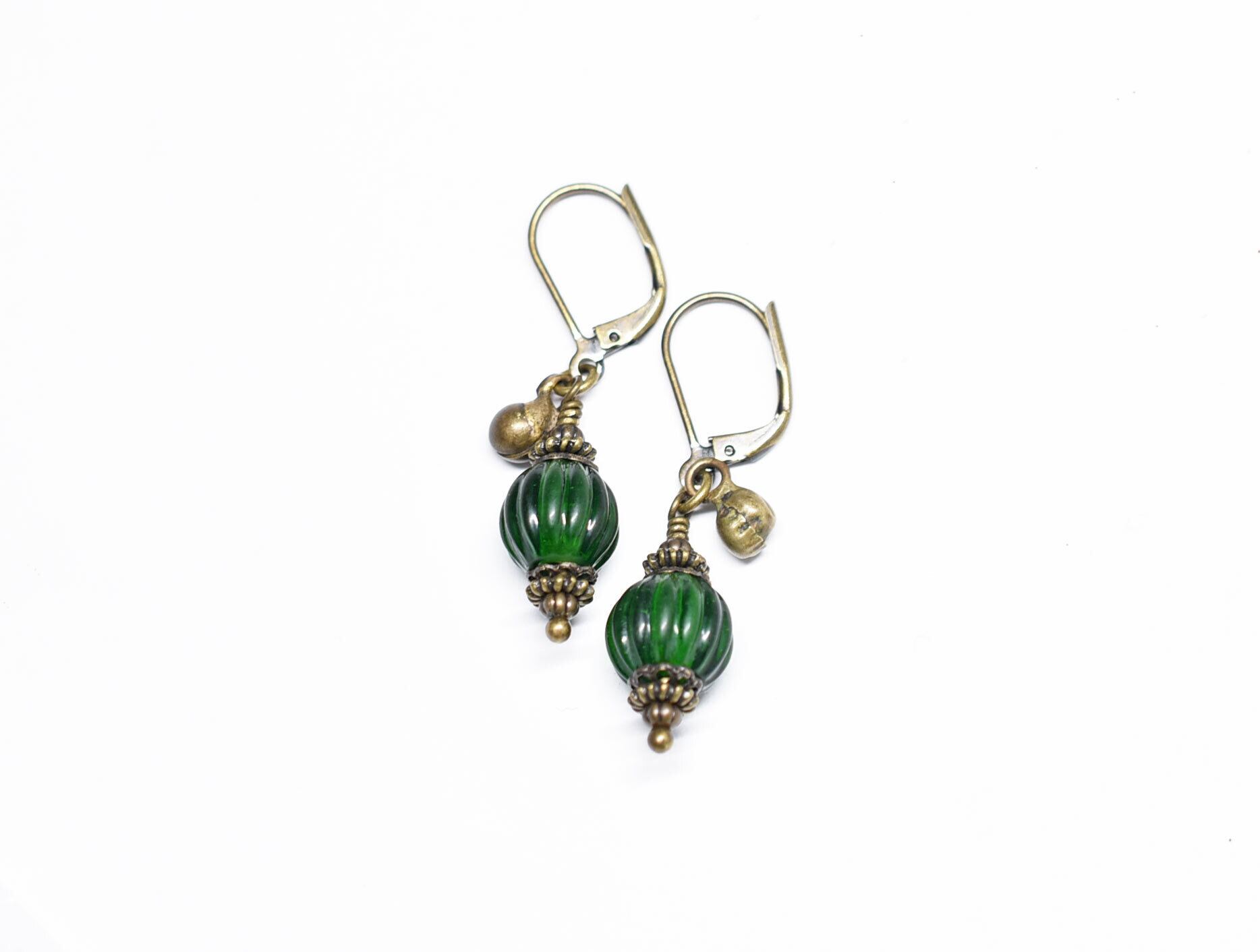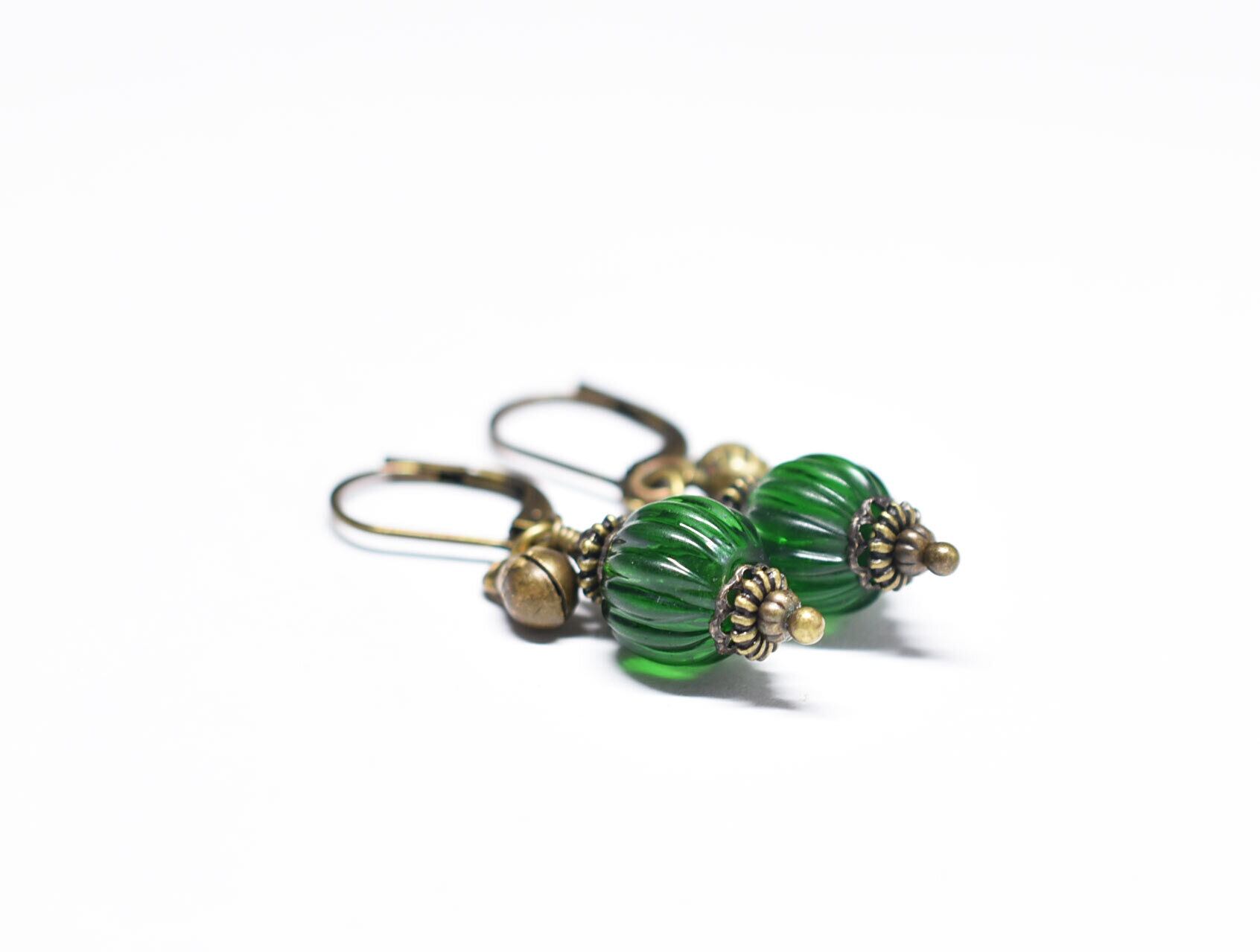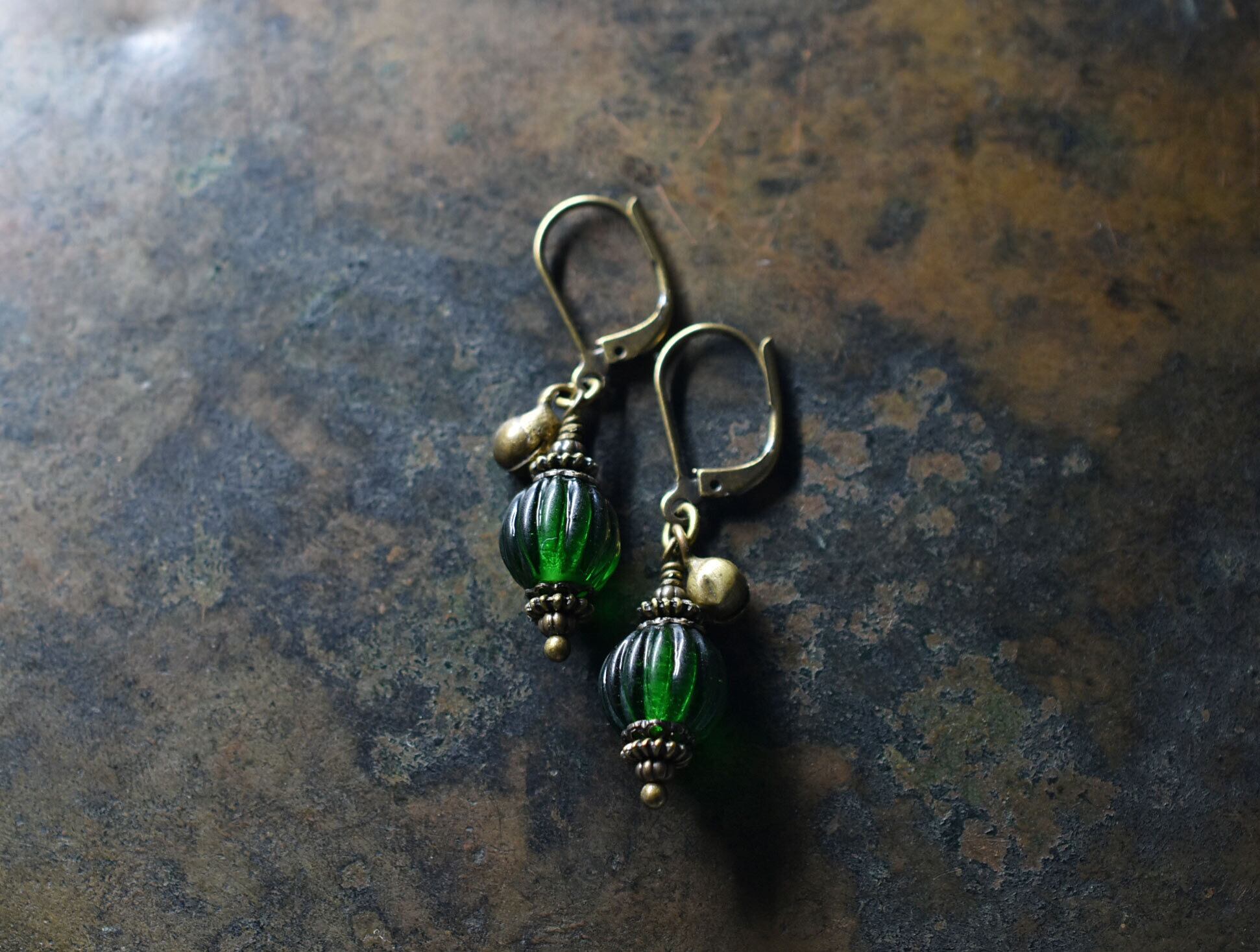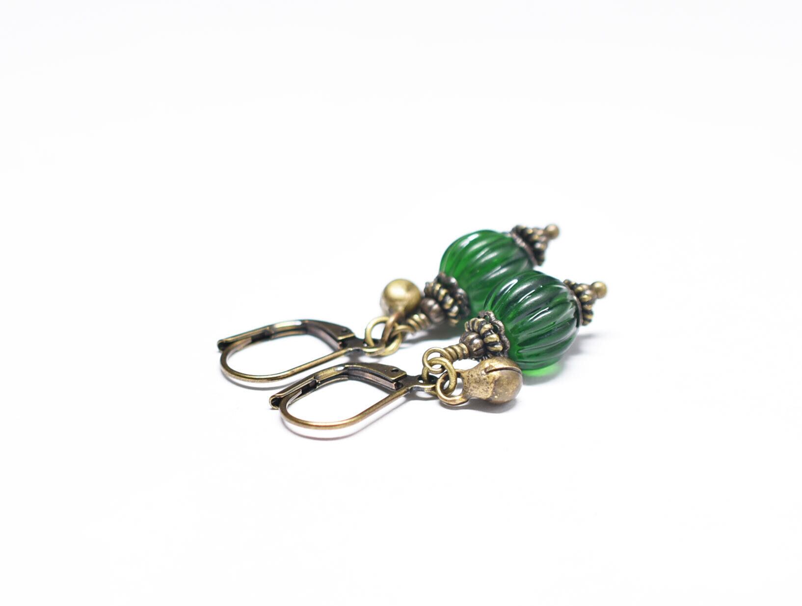 oldグリーン蜜柑玉と民族鈴を繋いだ小ぶりなピアスです。