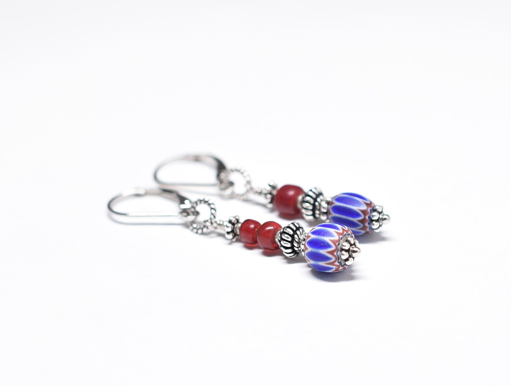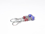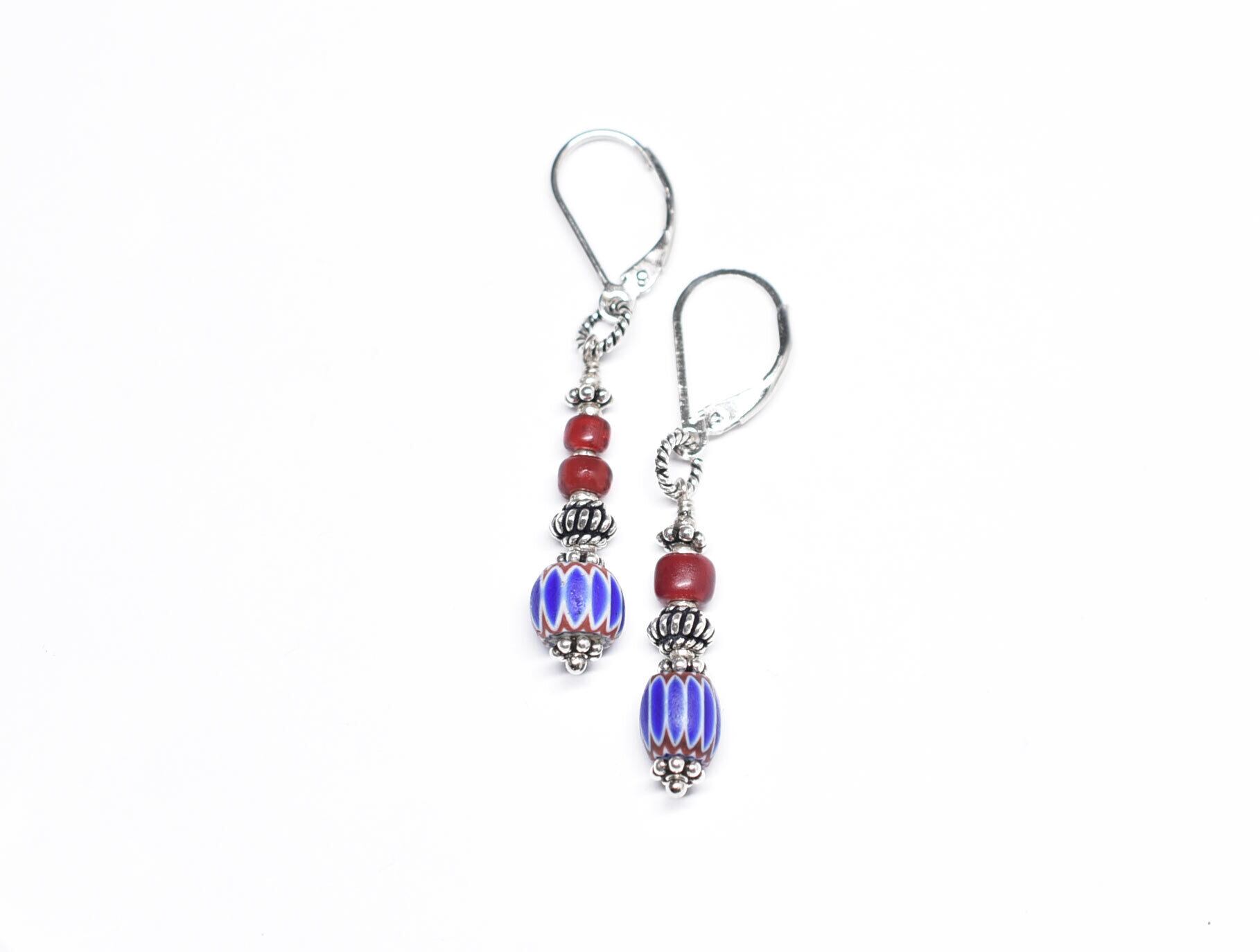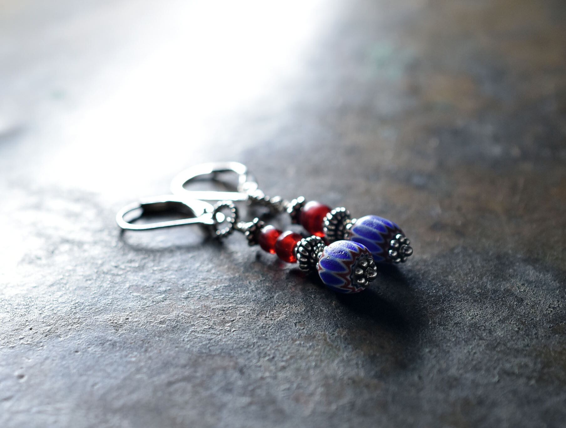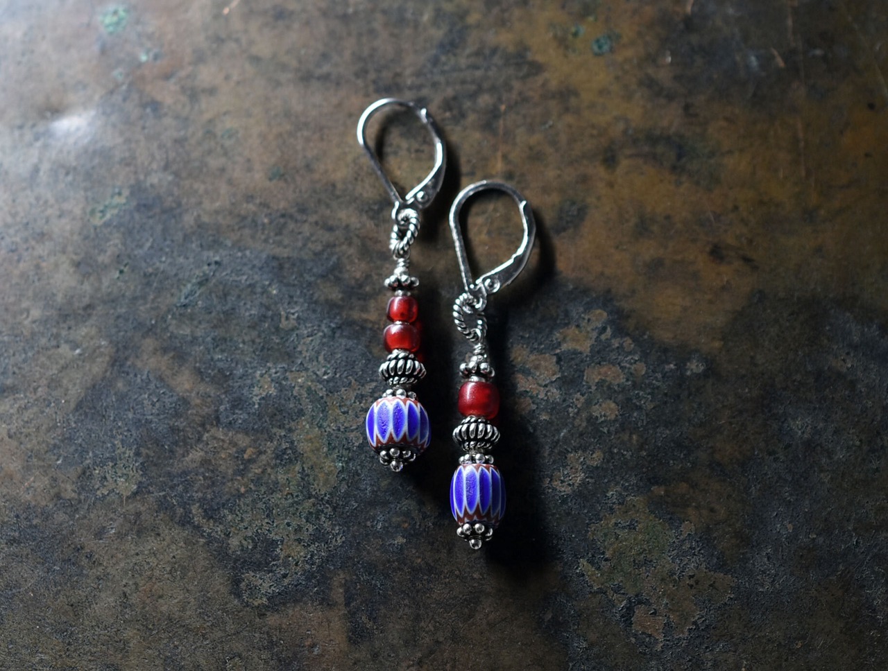 アンティークブルーシェブロンビーズと濃赤ホワイトハーツ、シルバ-ビーズのアンシメトリーピアス
