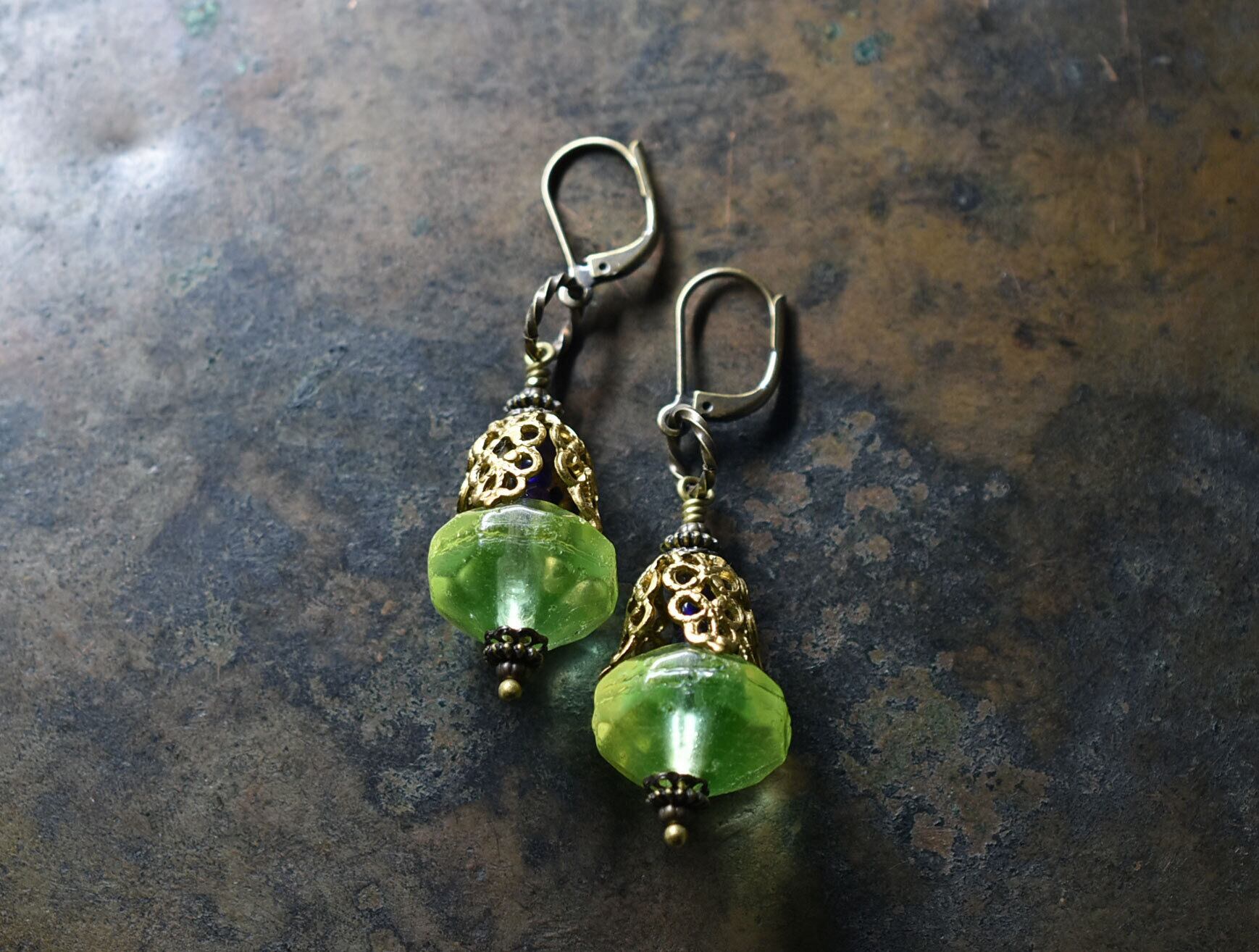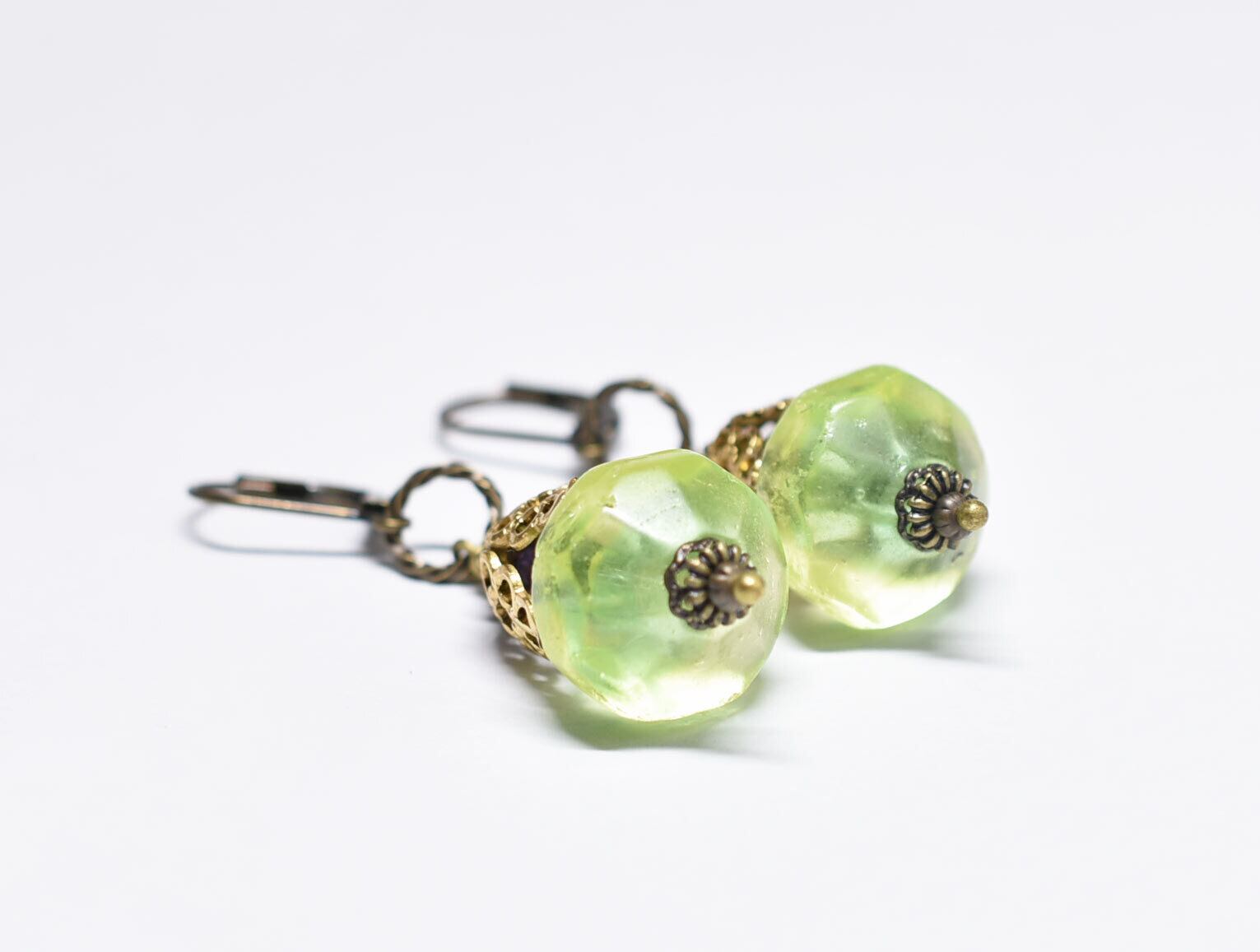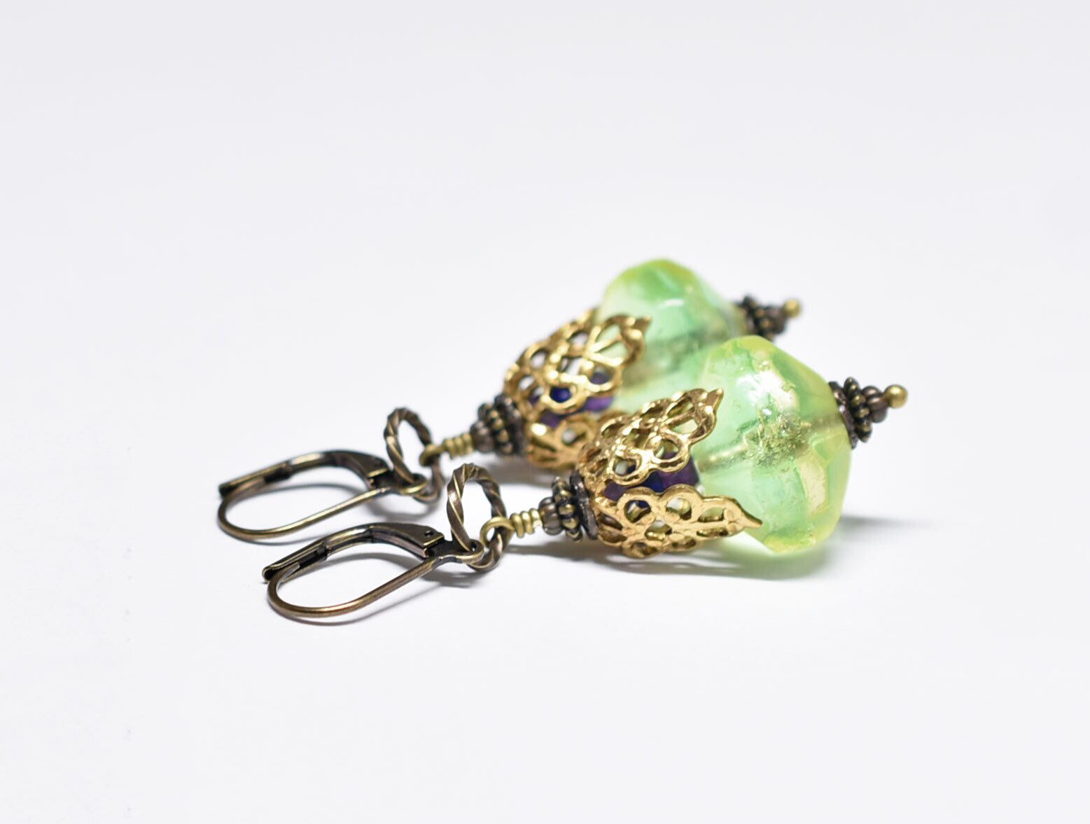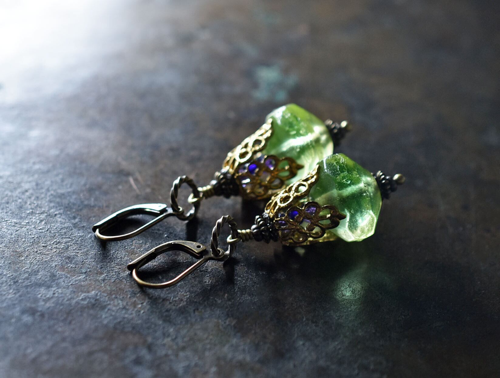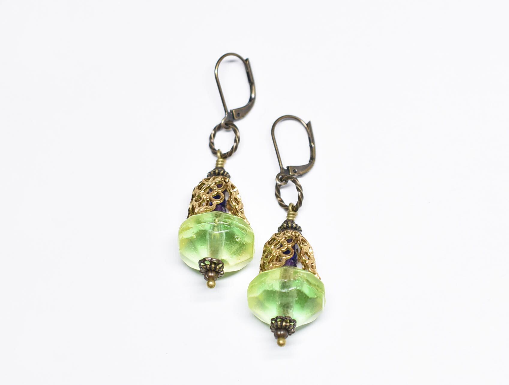 淡いバイカラーアンティークウランガラスと繊細装飾ブラスキャップ、アメジスト、瑠璃色ビーズのピアス