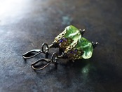 淡いバイカラーアンティークウランガラスと繊細装飾ブラスキャップ、アメジスト、瑠璃色ビーズを繋いだピアスです。