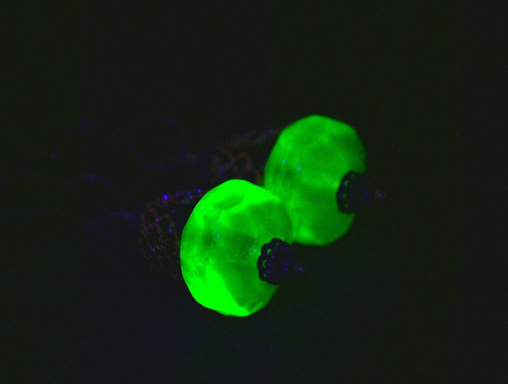 独特なセミクリアグリーンのビーズは、極々微量のウランで発色させています。ブラックライトを当てると光ります!
