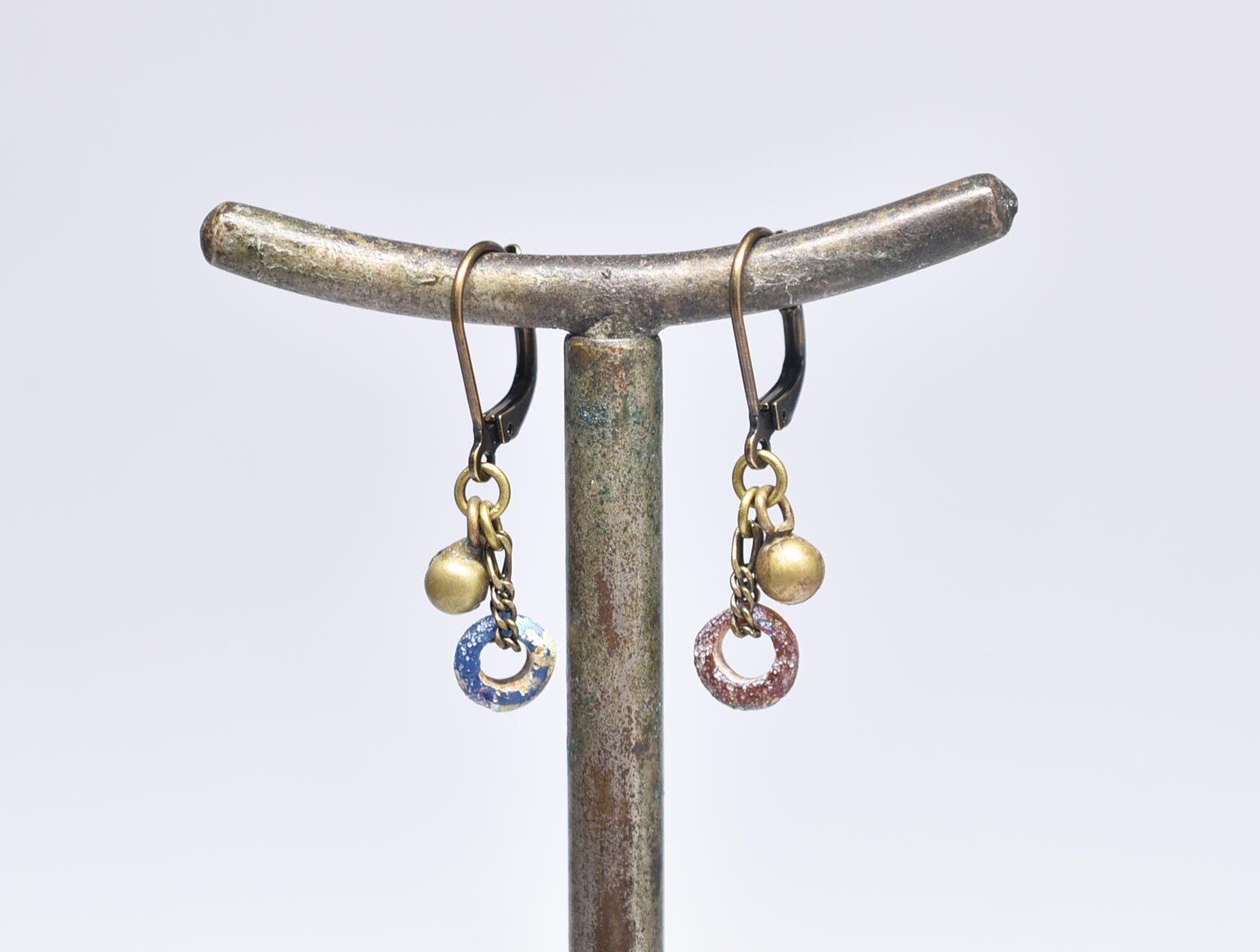 銀化ローマングラスリングビーズと民族鈴の小さなピアス