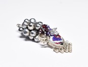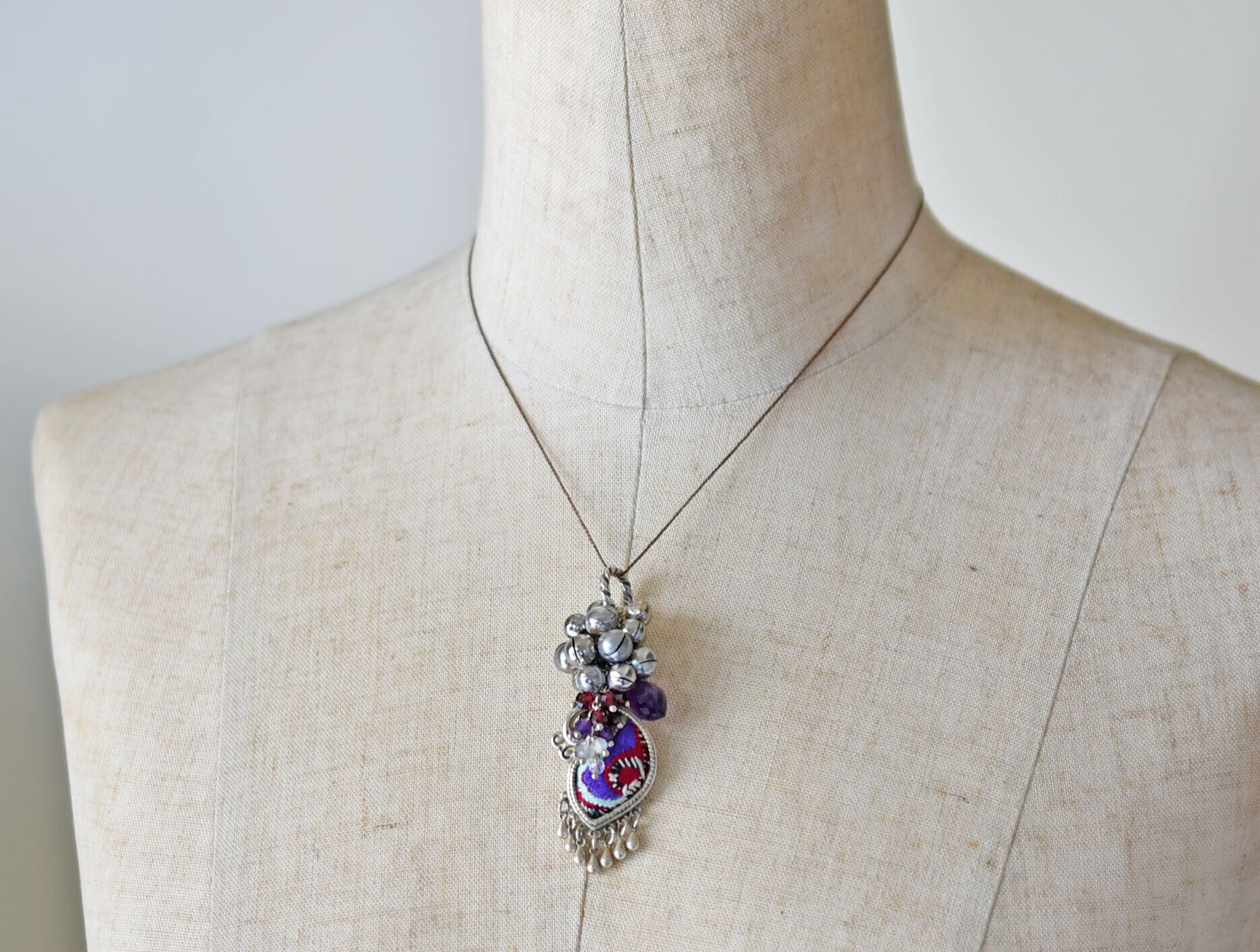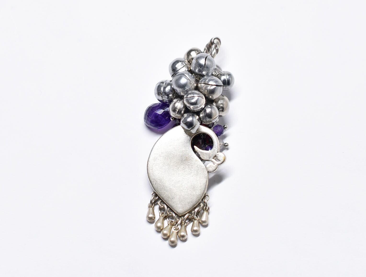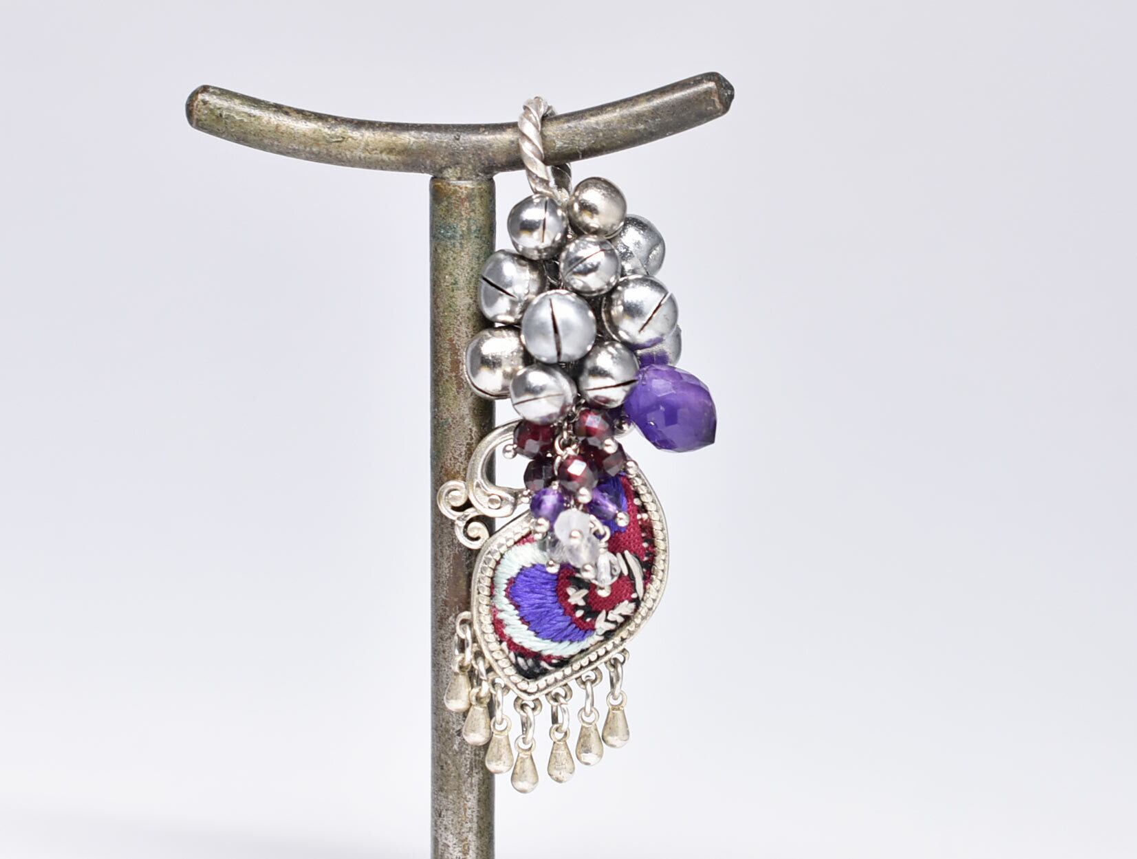 ミャオ族刺繍古裂孔雀とたわわな鈴と雫アメジスト、小さなストーンビーズを繋いだペンダントトップです。