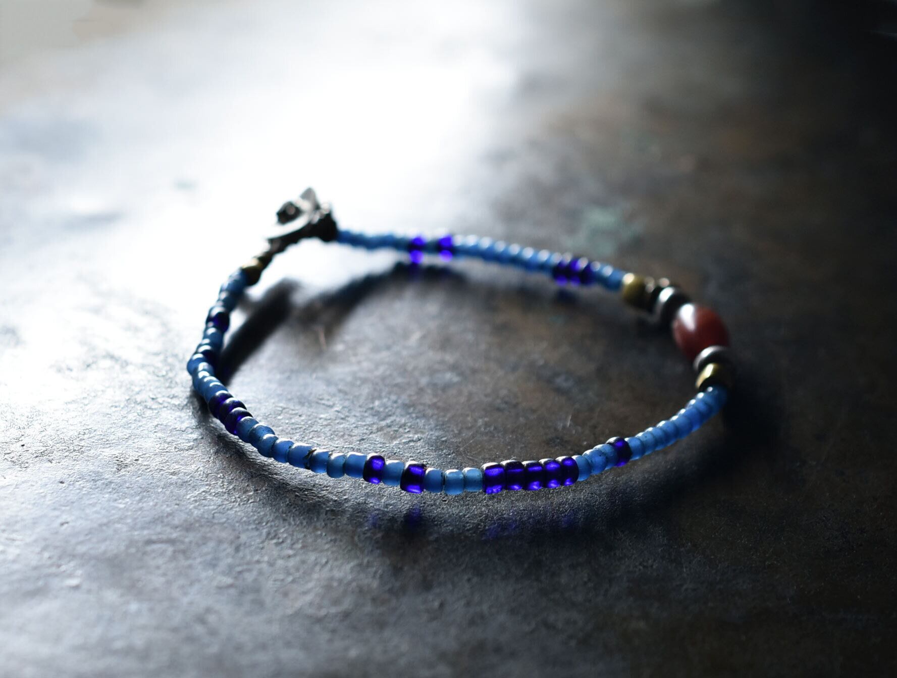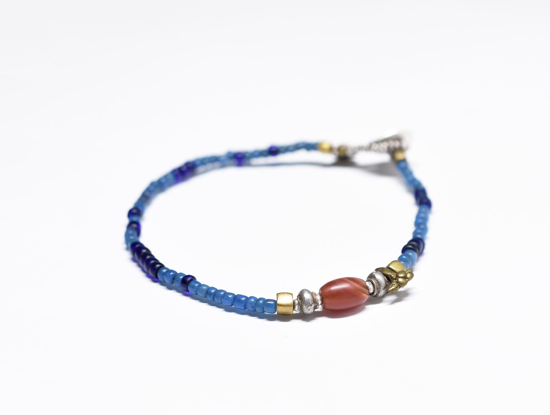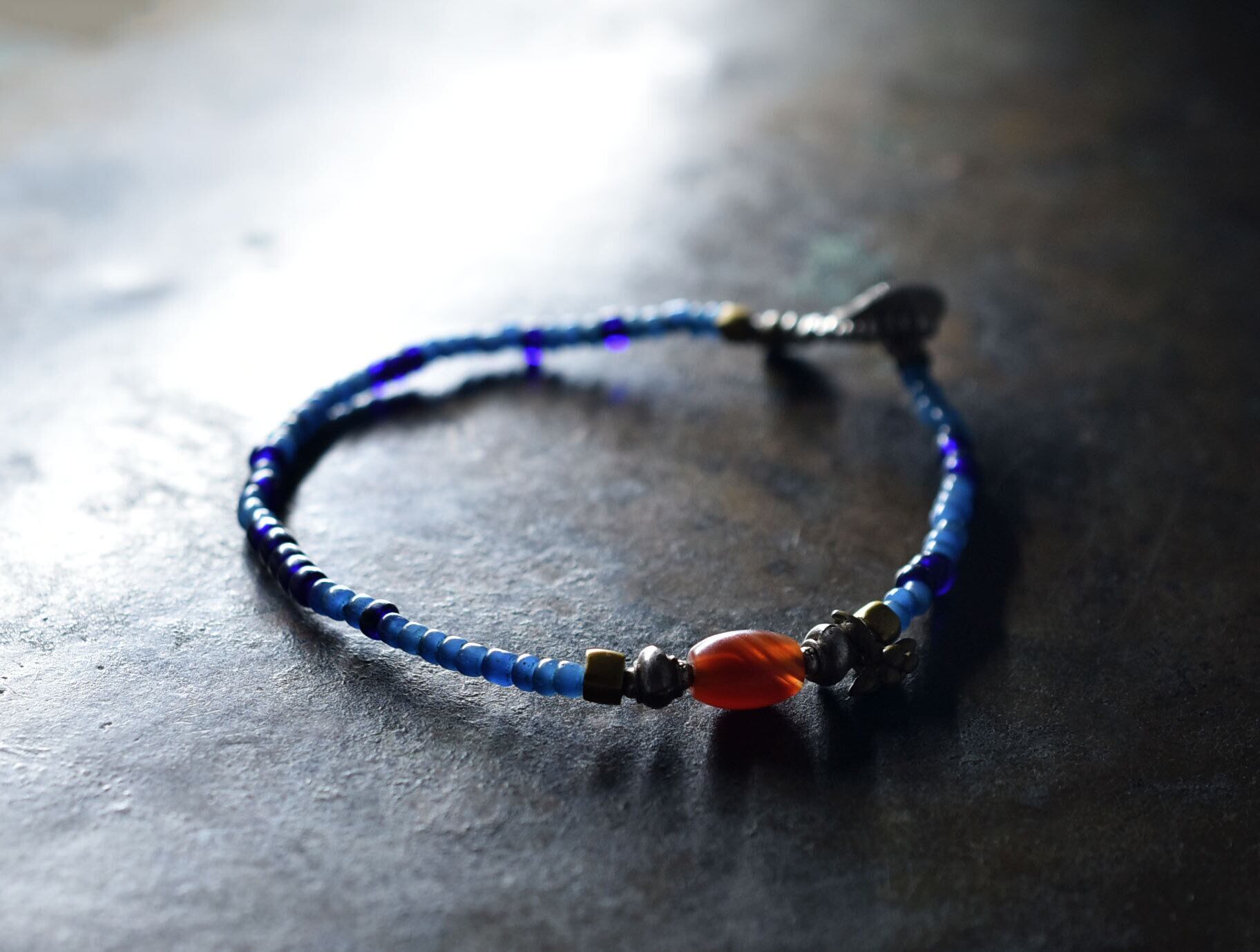 サックスブルー&瑠璃色シードビーズとシャン族ヴィンテージカーネリアン、古代瑪瑙、oldチンシルバー&オリッサブラスを繋いだ華奢なブレスです。