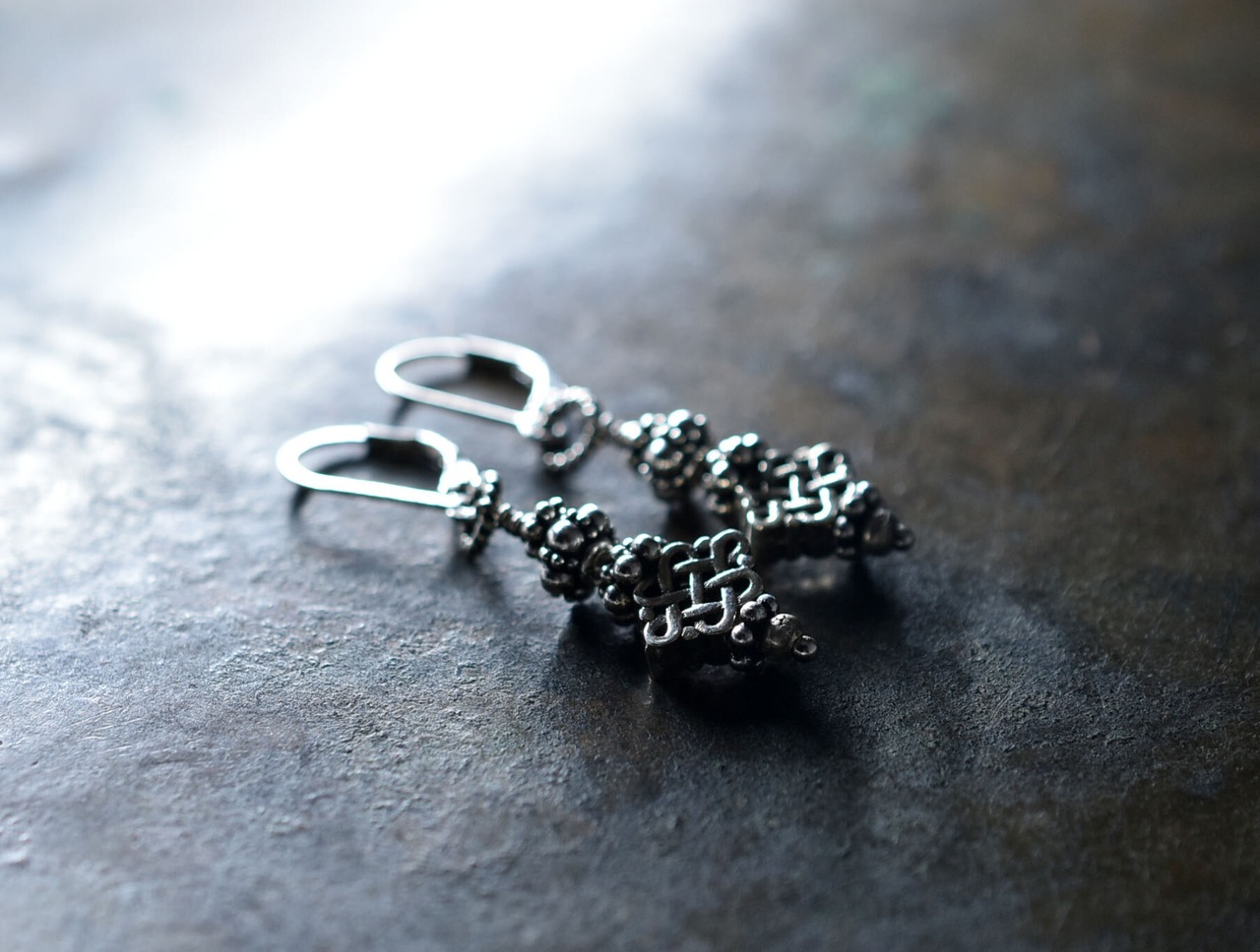 二重らせんの輪っかや小さなビーズ(花の刻印が施されています。)はカレンシルバーです。