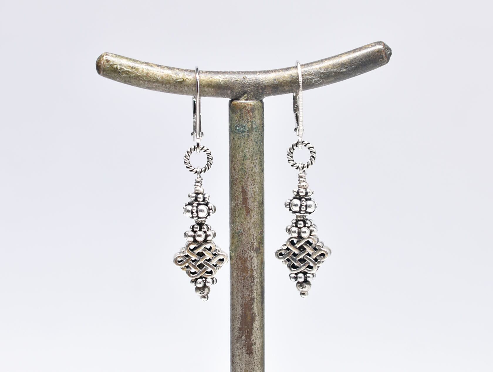 エンドレスノットとシルバービーズを繋いだピアスです。