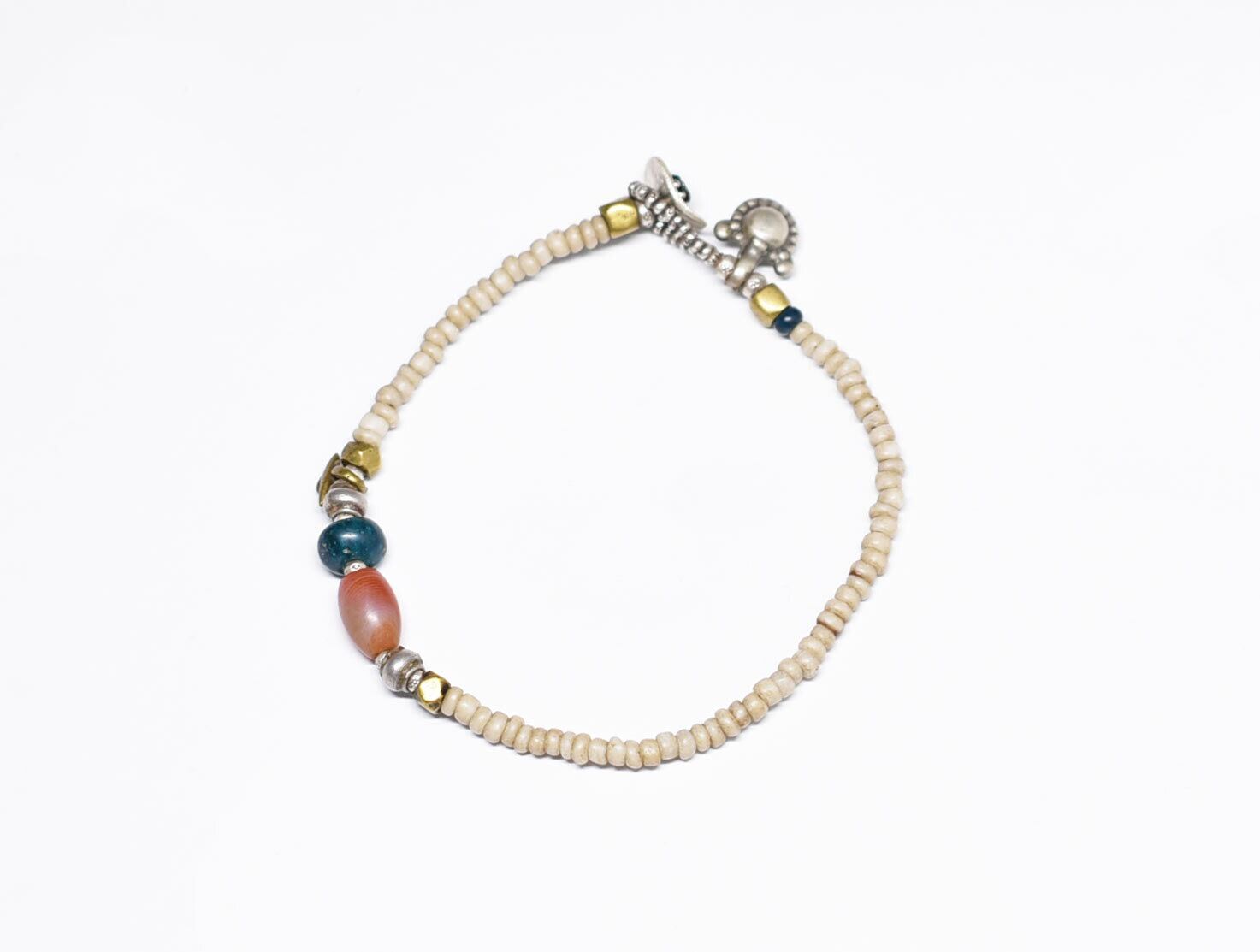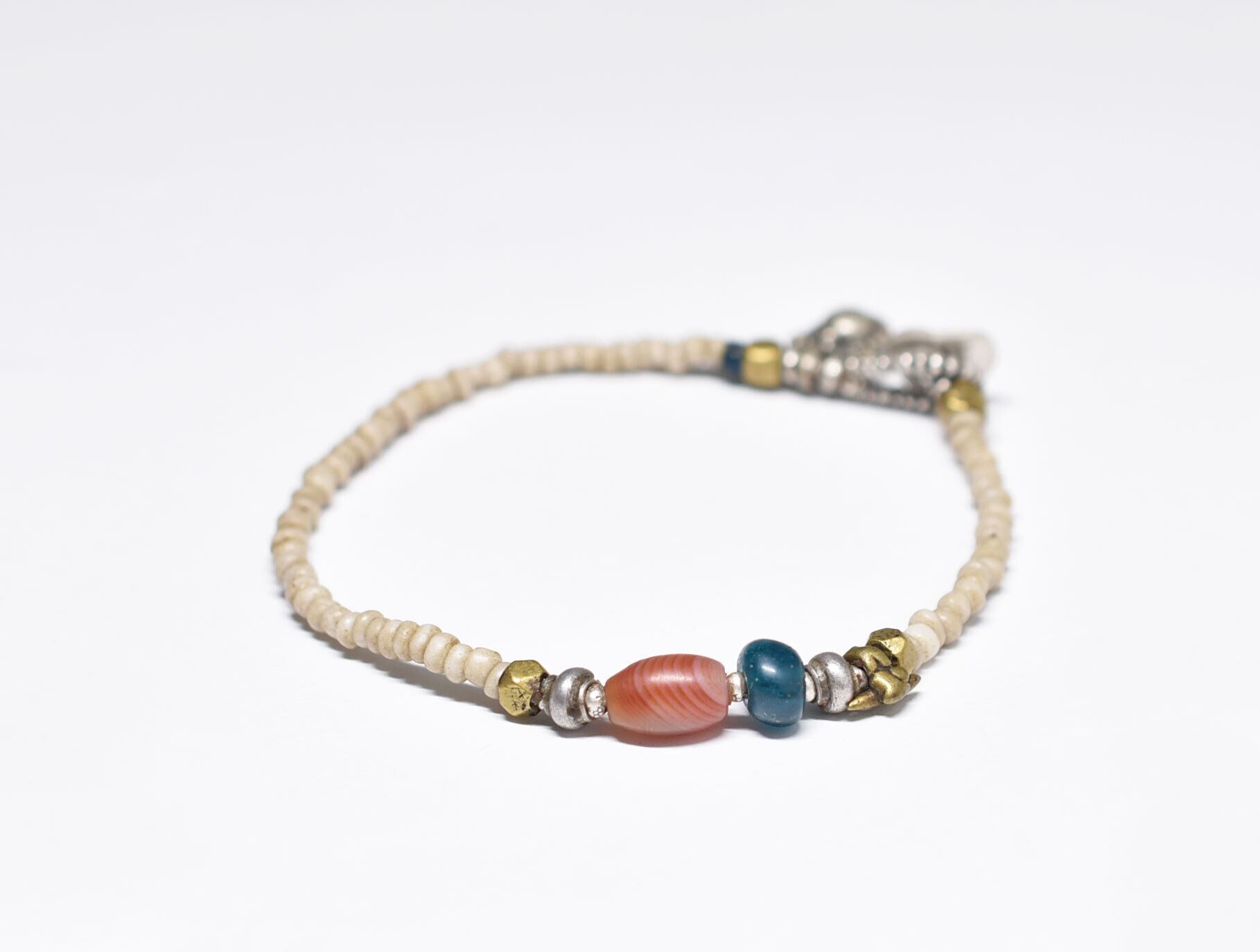 アイボリーシードビーズとシャン族ヴィンテージカーネリアン、インディゴブルービーズ、oldチンシルバー&オリッサブラスの華奢なブレス