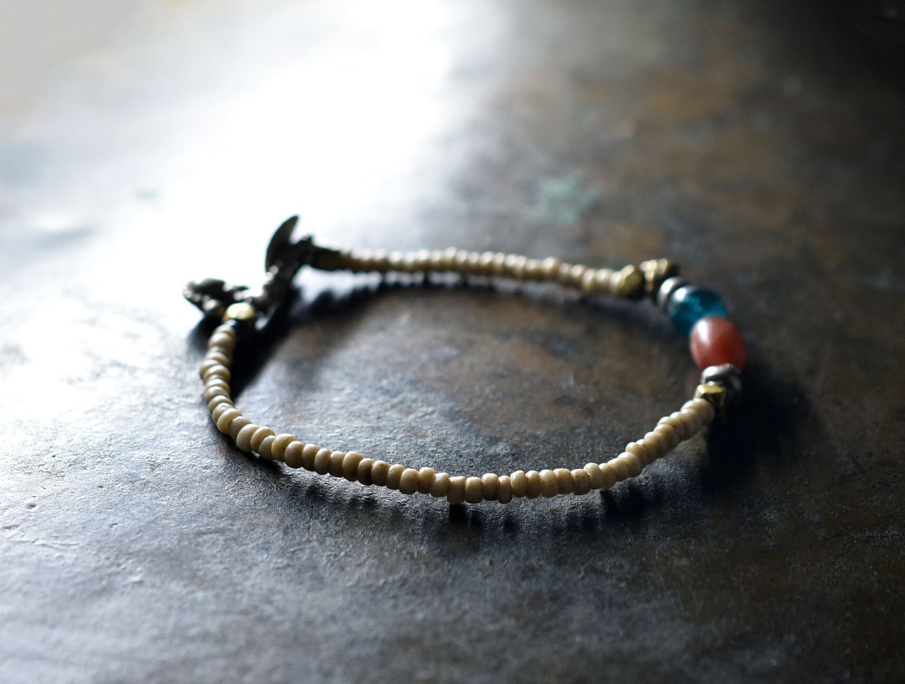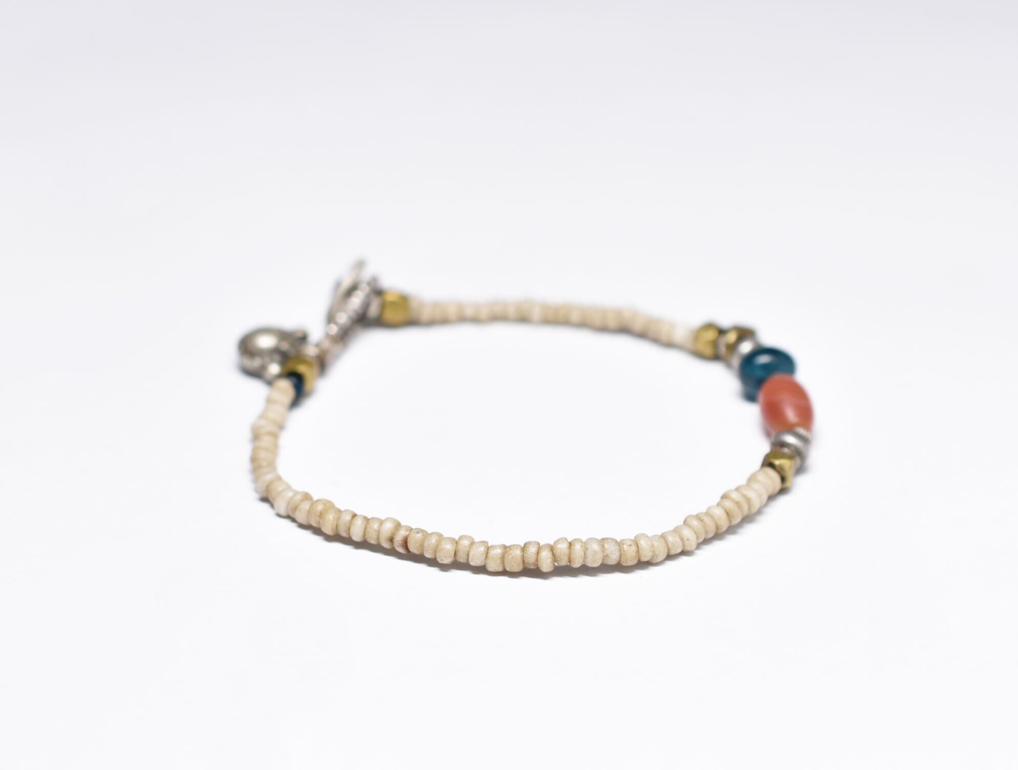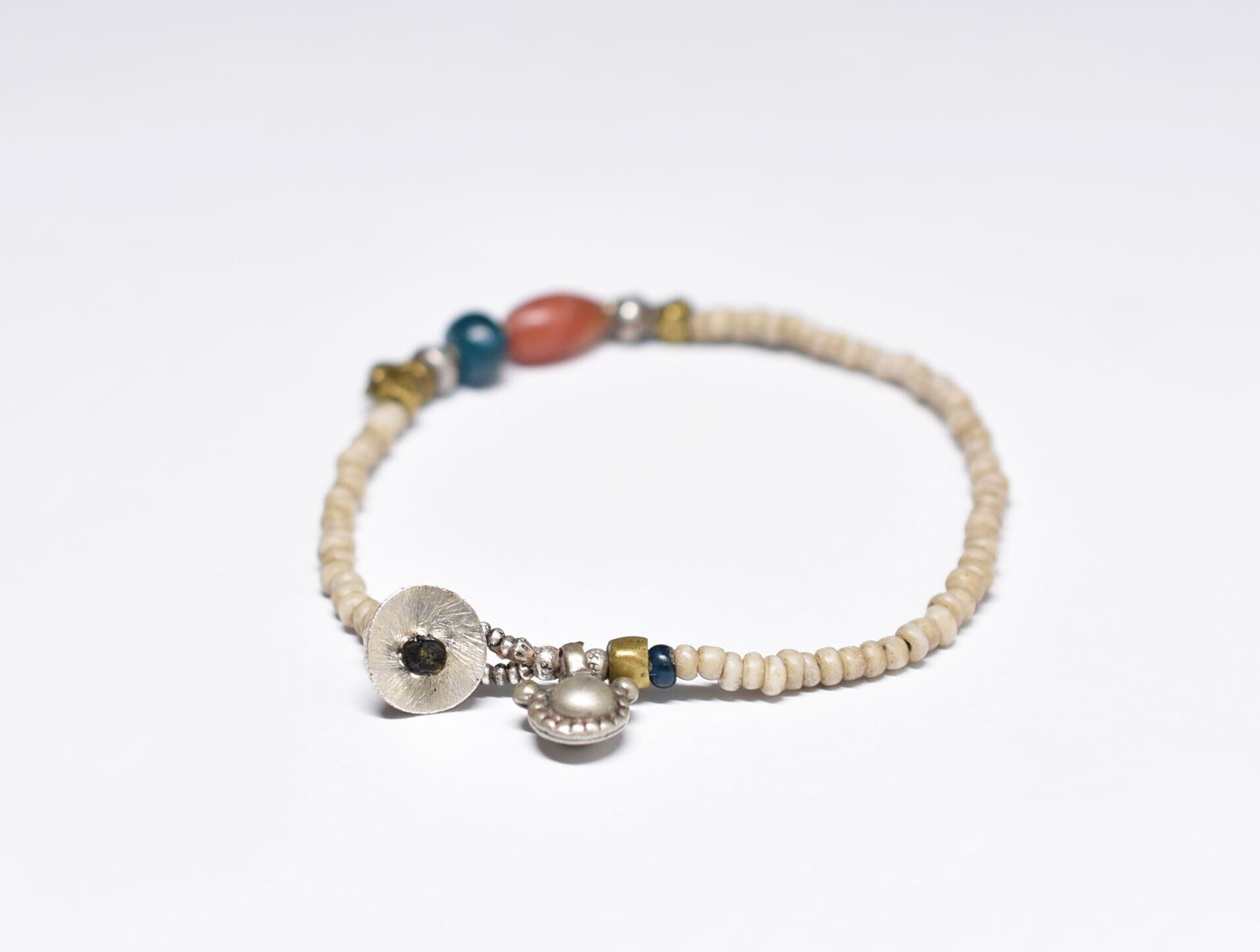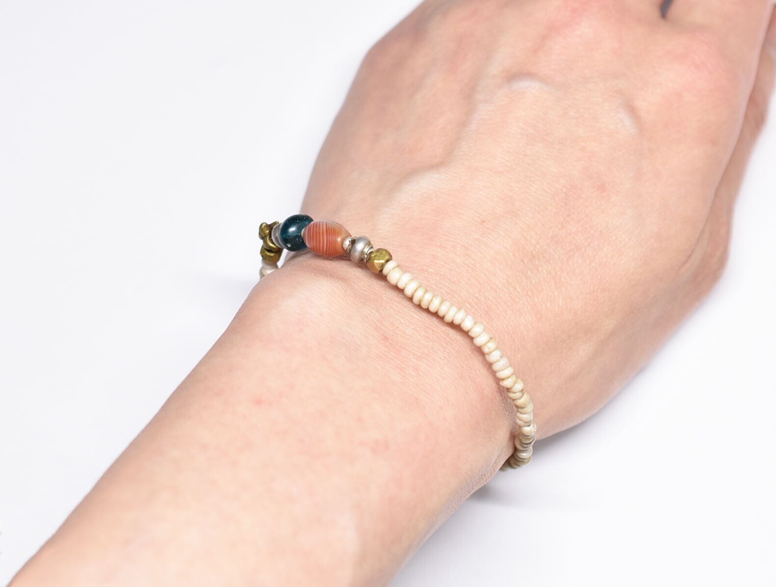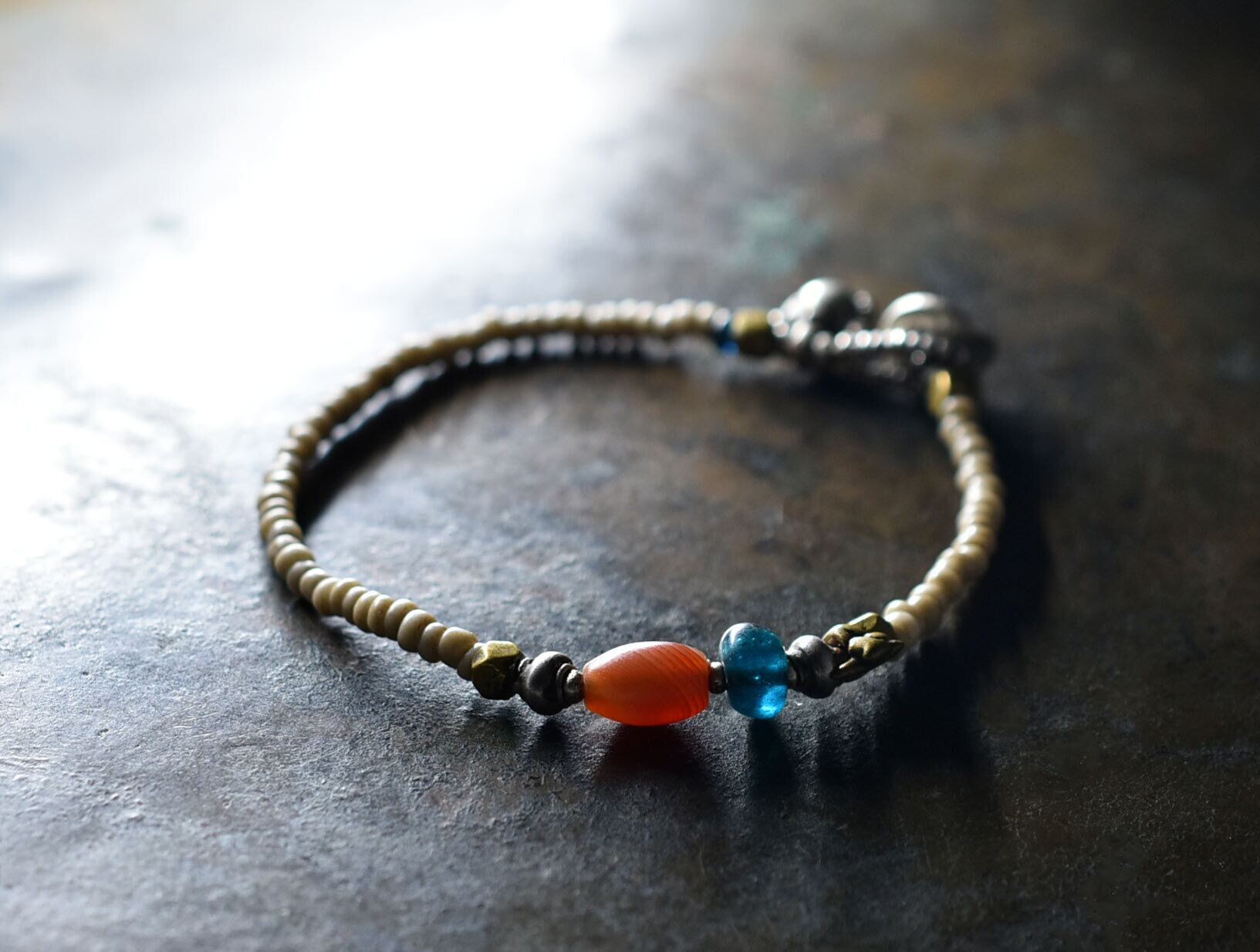 アイボリーシードビーズとシャン族ヴィンテージカーネリアン、インディゴブルービーズ、oldチンシルバー&オリッサブラスなどを繋いだ華奢なブレスです。