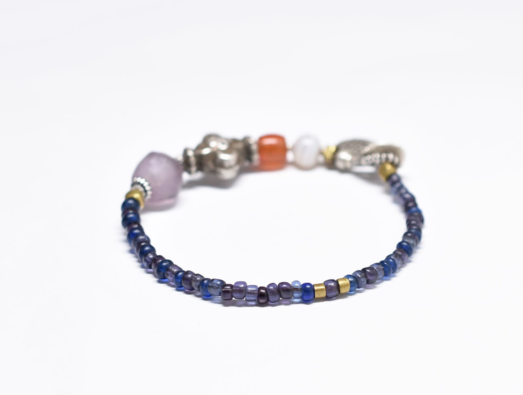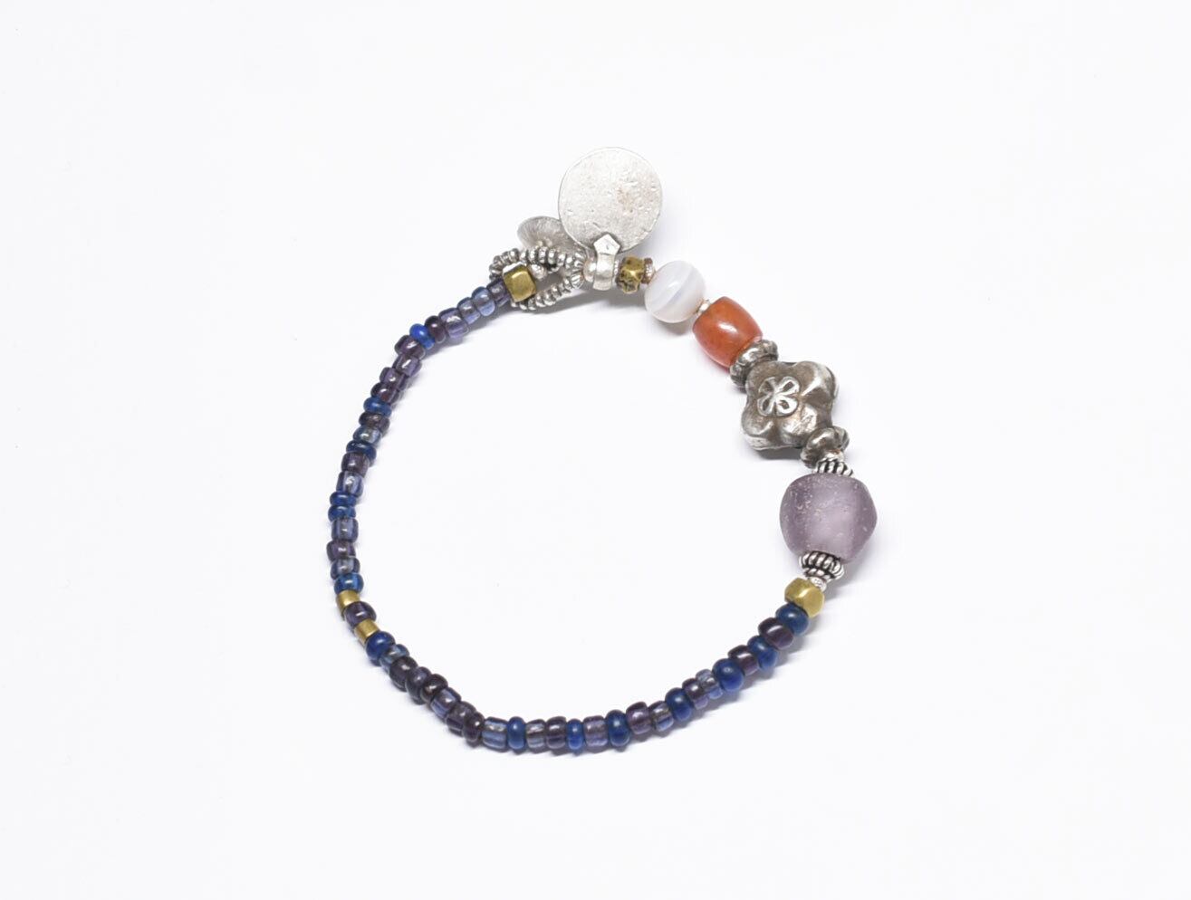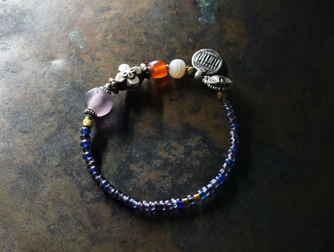 ドゴン族すみれ色ビーズとミゾーラムカーネリアン、古代瑪瑙、oldヒマーチャルシルバー、ブルー&パープルビーズ、oldインドシルバーチャームを繋いだブレスえす。