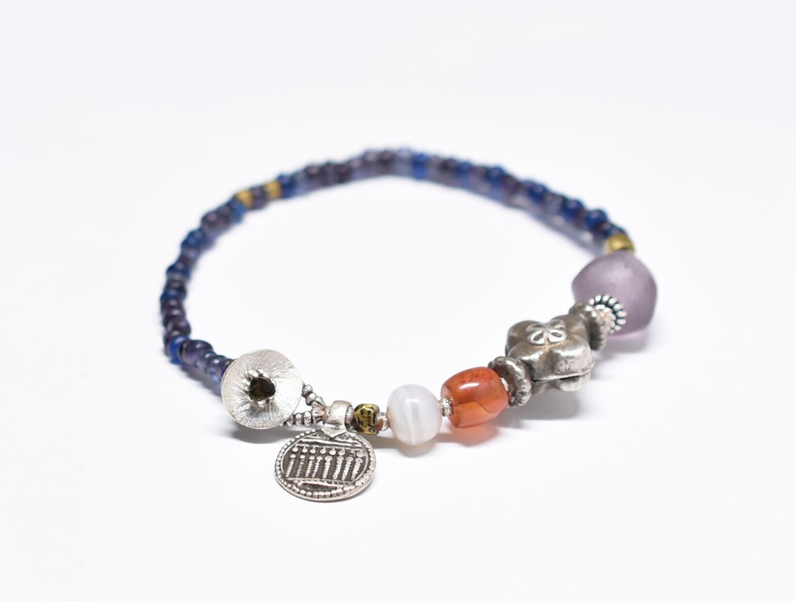 ドゴン族すみれ色ビーズとミゾーラムカーネリアン、古代瑪瑙、oldヒマーチャルシルバー、ブルー&パープルビーズ、oldインドシルバーチャームのブレス