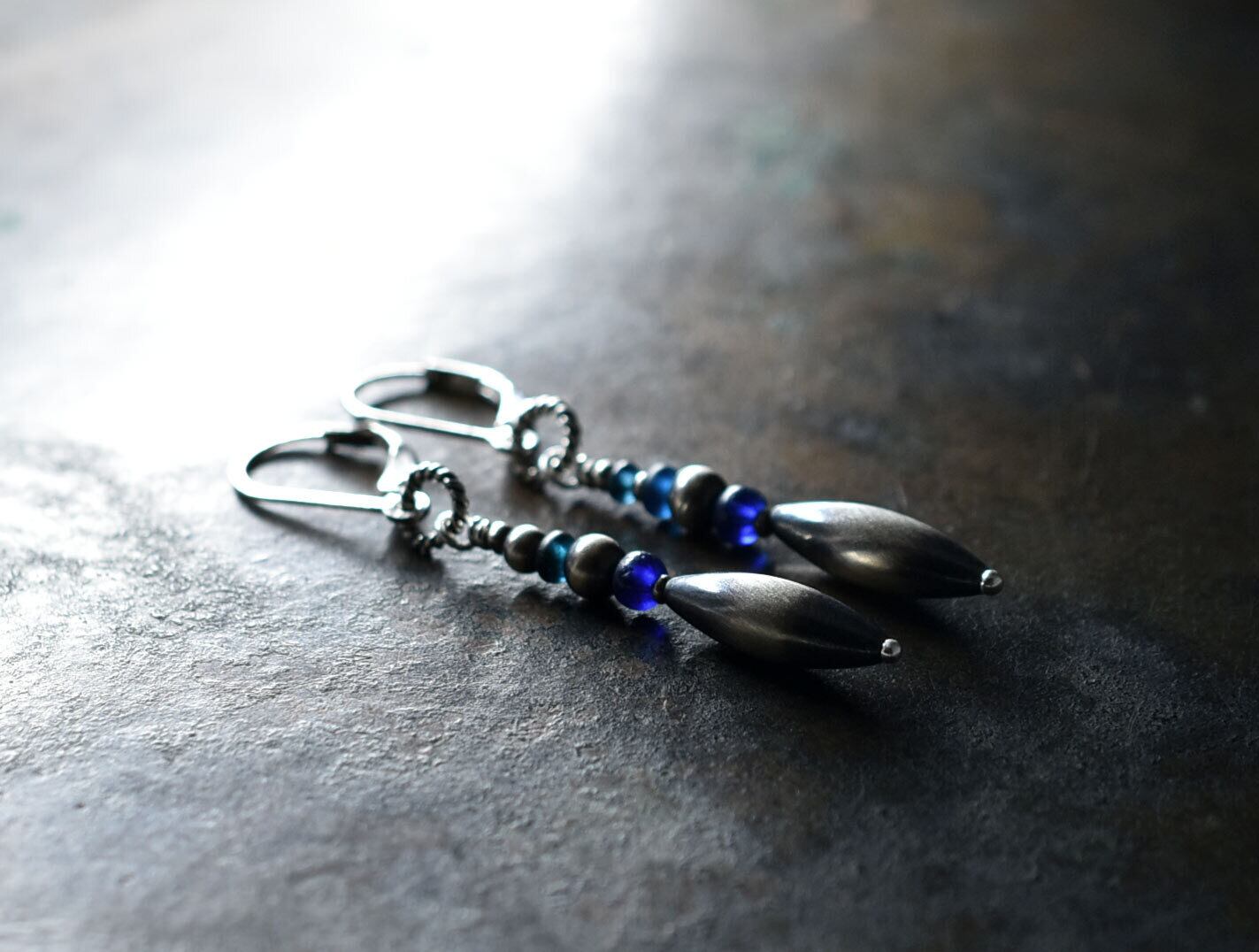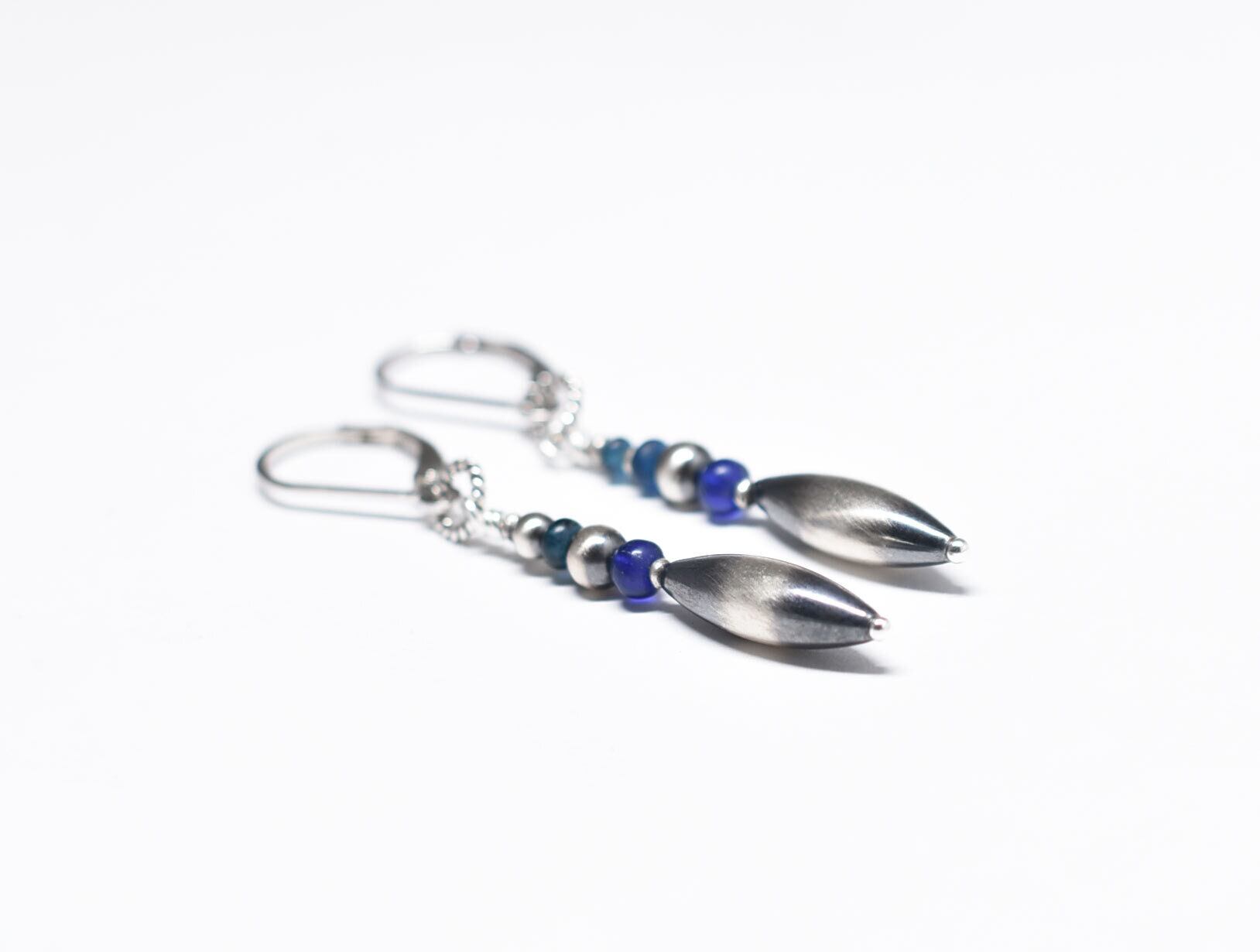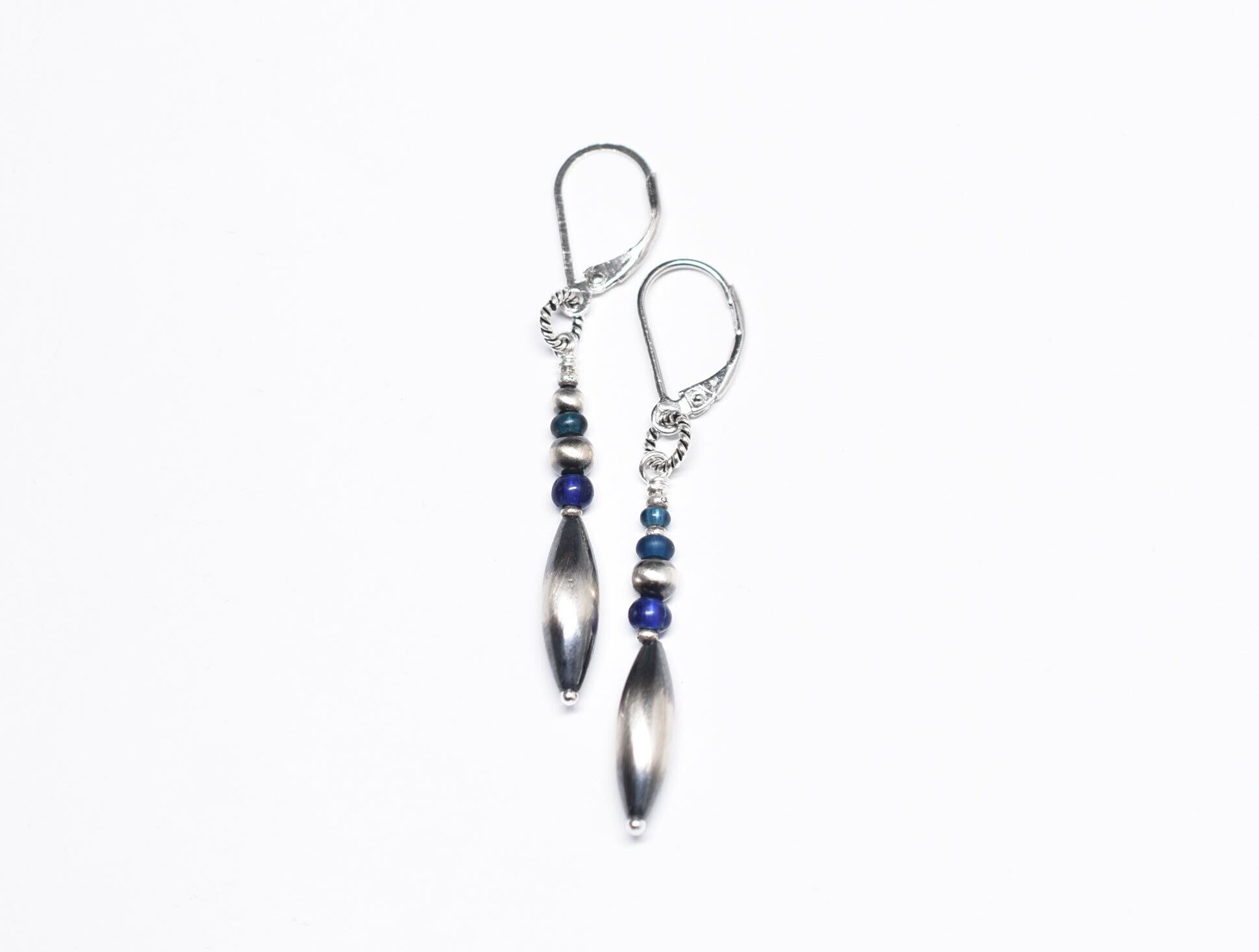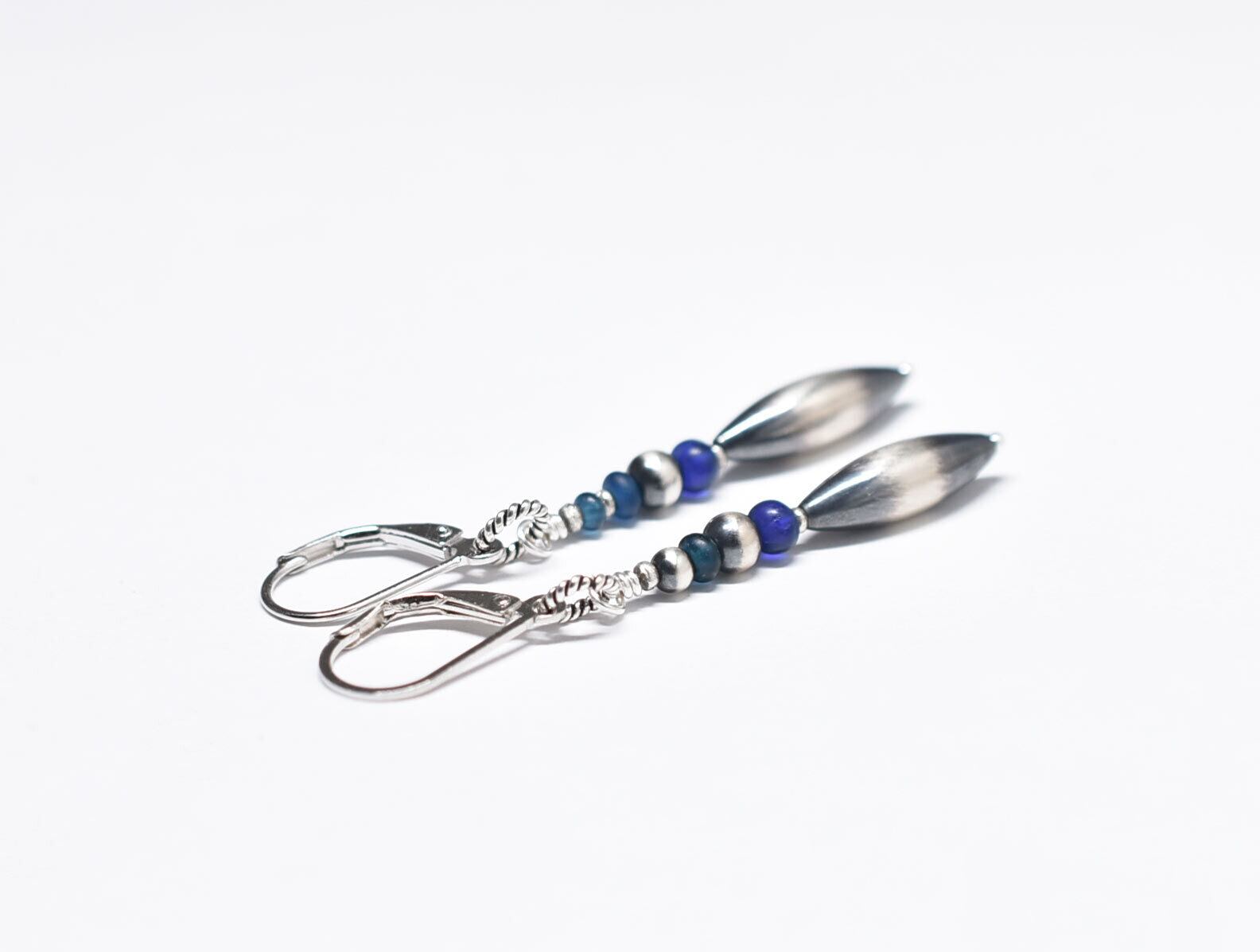 ナバホパールとブルー系アンティークビーズのスリムなピアス