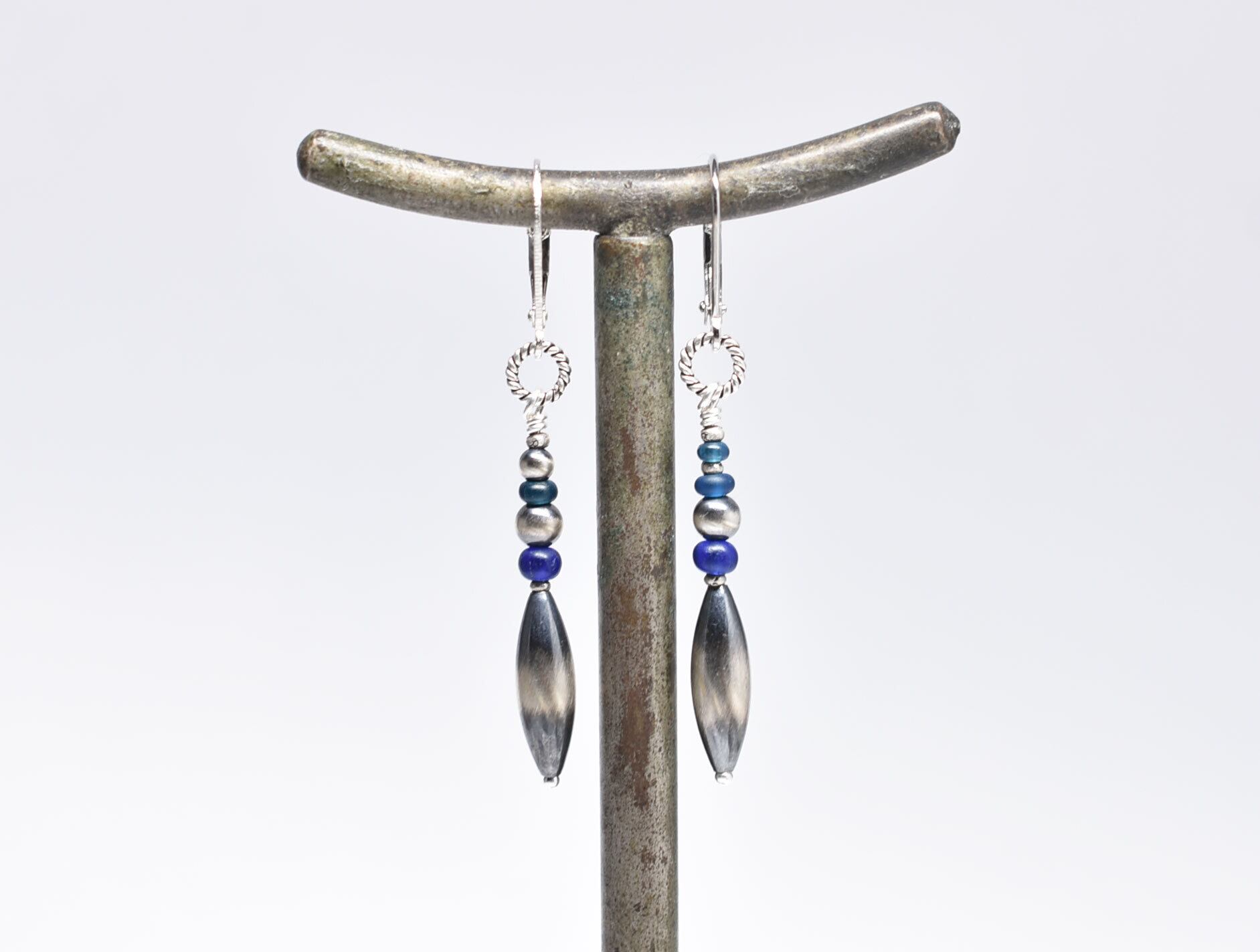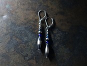ナバホパールとブルー系アンティークビーズを繋いだスリムなピアスです。