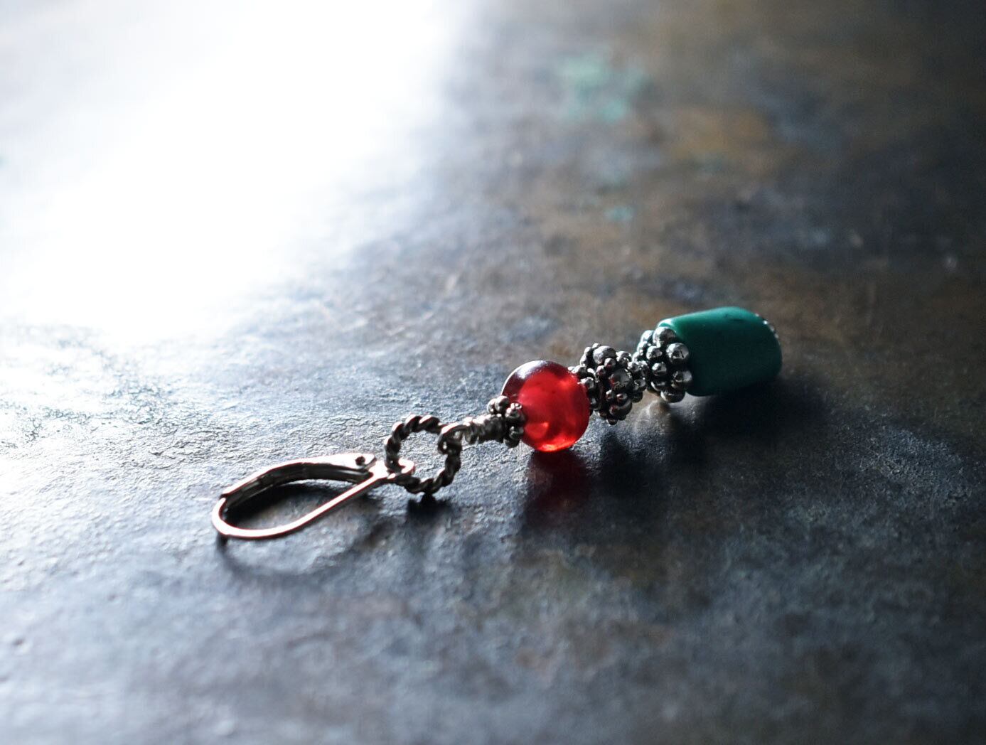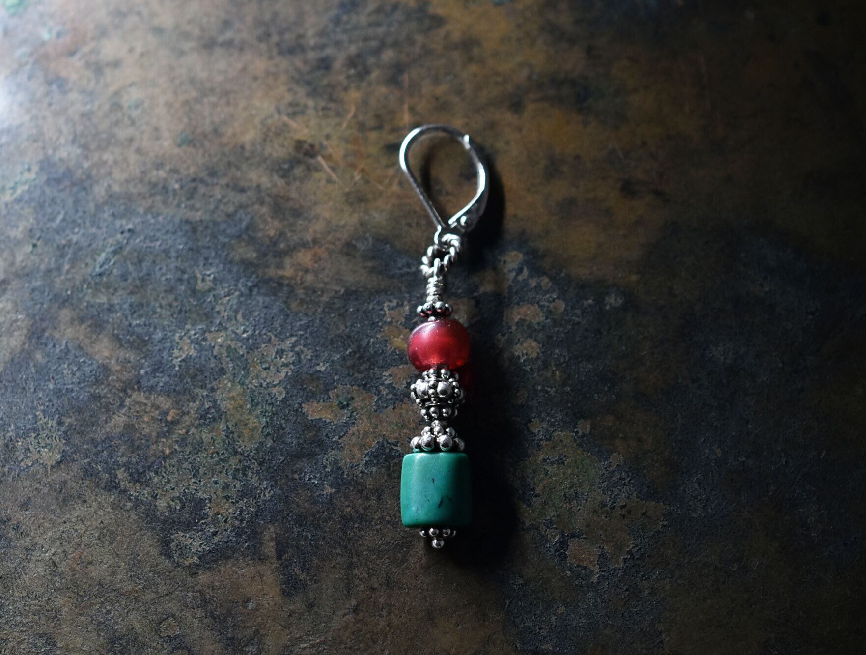 oldチベタンターコイズと金赤ホワイトハーツ、シルバービーズを繋いだ片耳のピアスです。