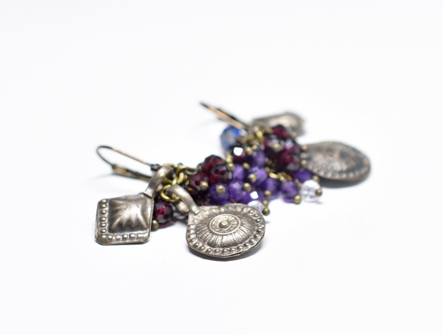 2種アフガンメタルと民族鈴、たわわなガーネット、アメジスト、クォーツ、カイヤナイトのピアス