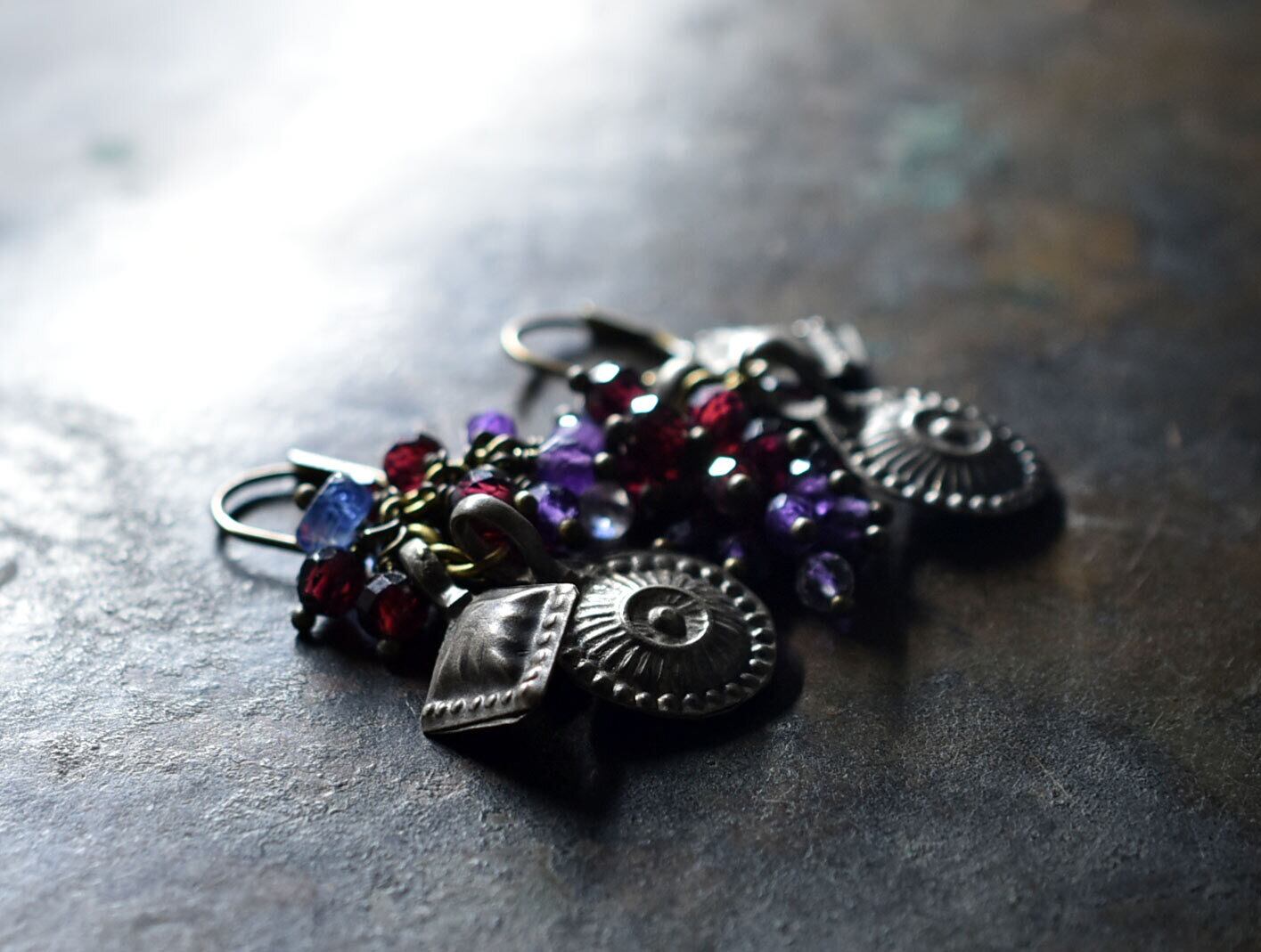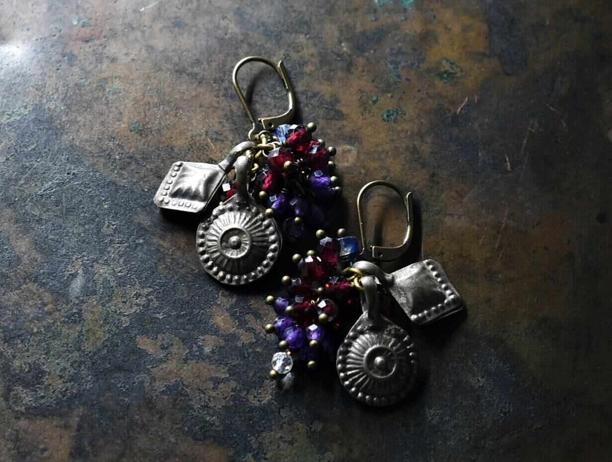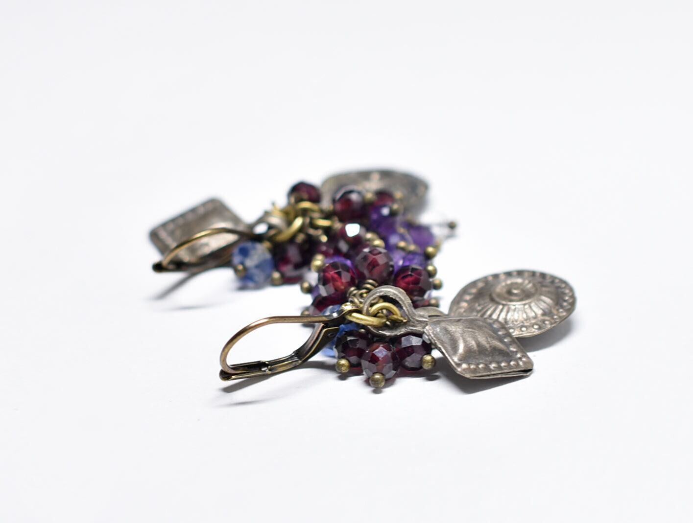 2種アフガンメタルと民族鈴、たわわなガーネット、アメジスト、クォーツ、カイヤナイトを繋いだピアスです。