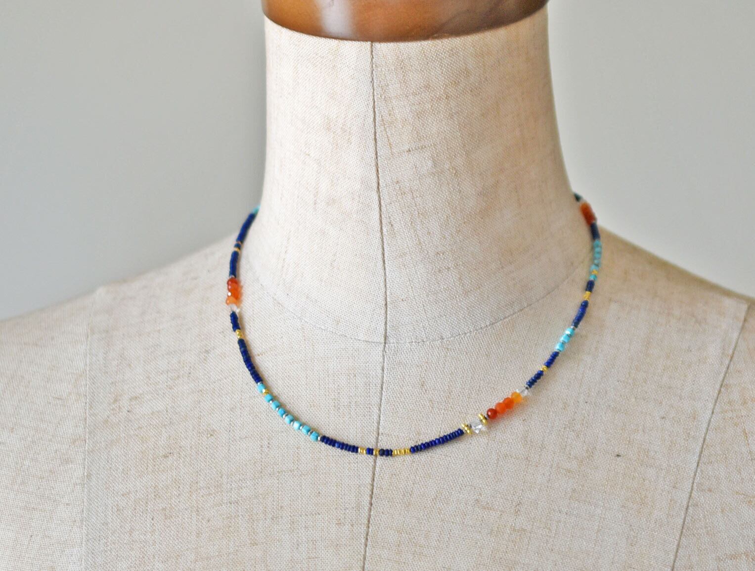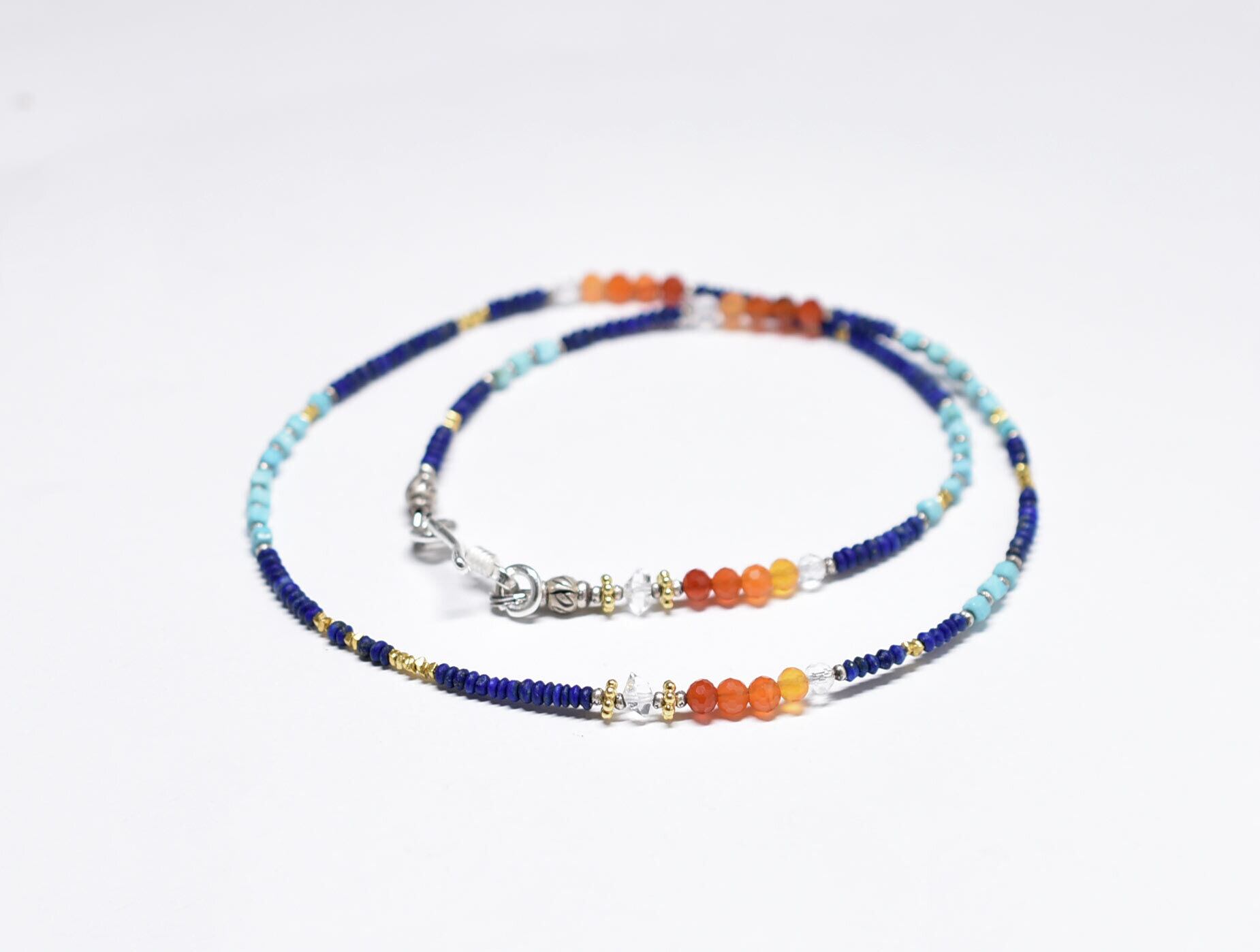 カーネリアンとスクエアターコイズ、ハーキマーダイヤモンド、小さなラピス、カレンシルバーの華奢なネックレス