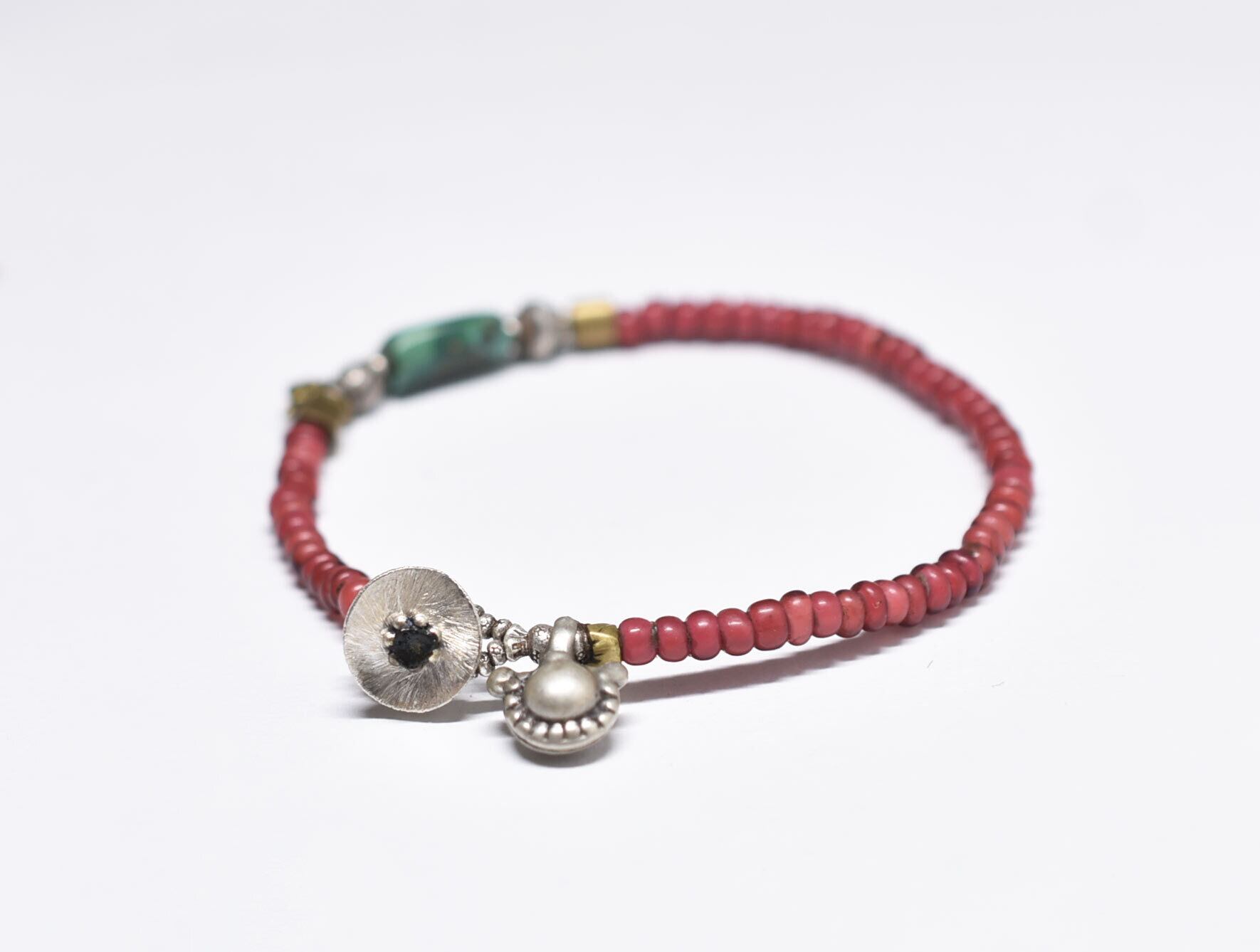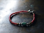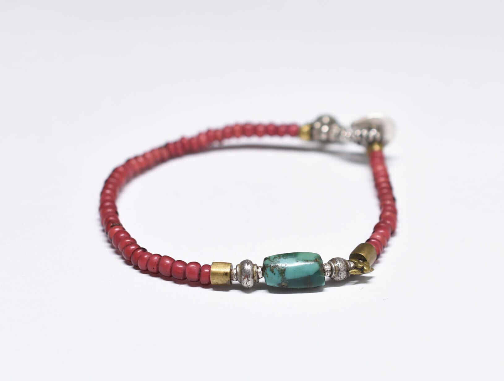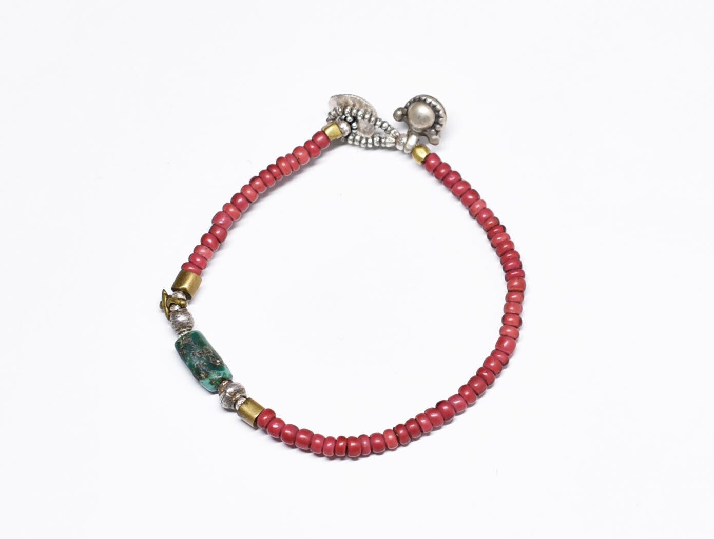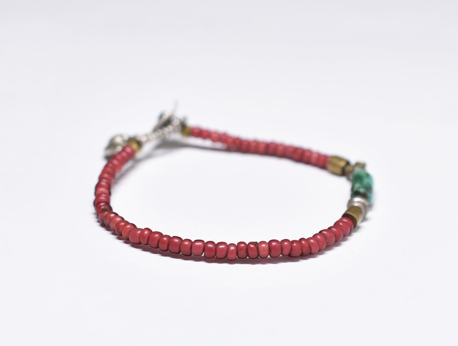 oldチベタンターコイズと金赤ホワイトハーツ、oldチンシルバー&オリッサブラスを繋いだブレスです。