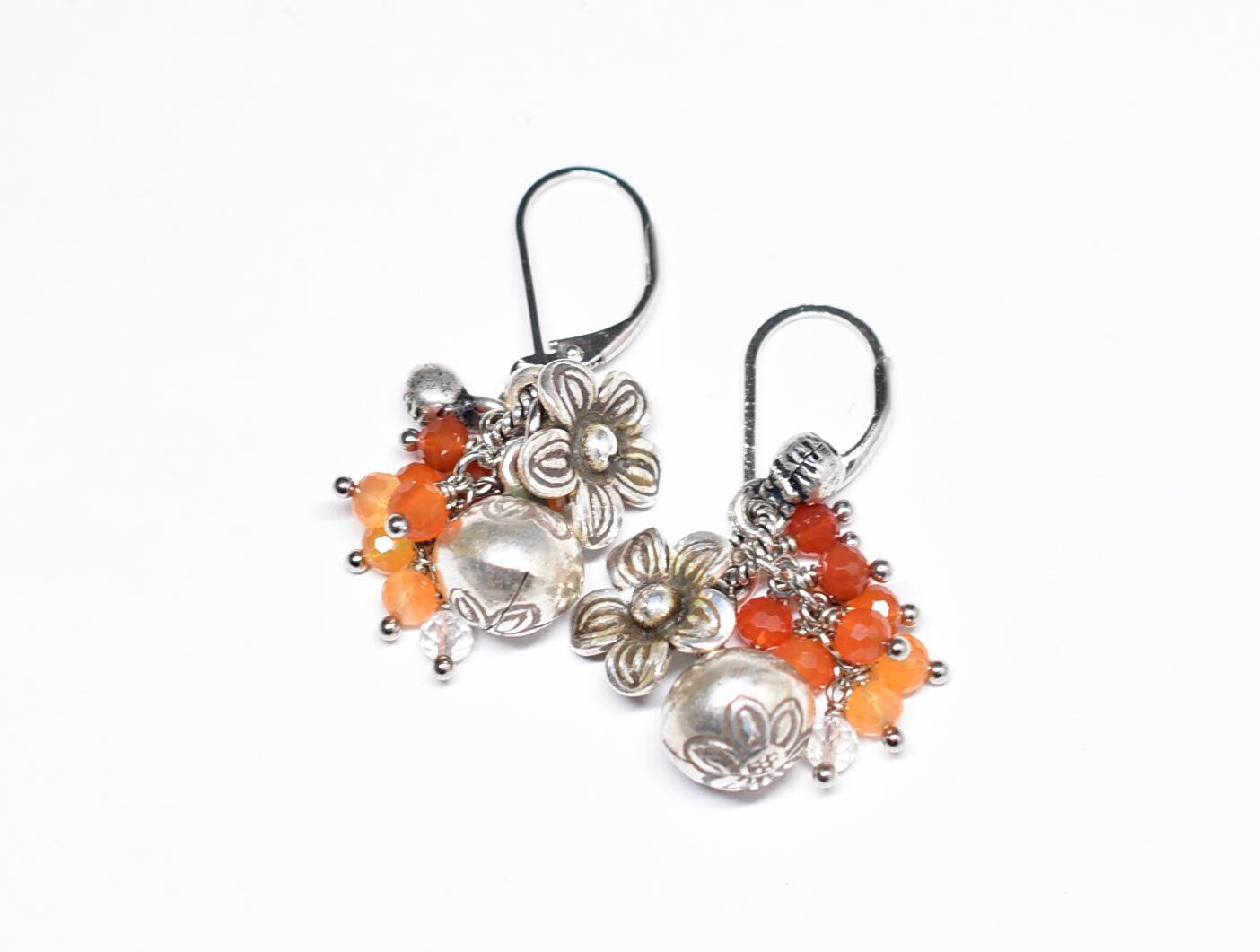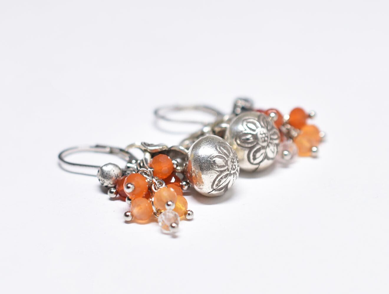鈴とお花カレンシルバー、たわわなカーネリアン、クォーツ、インドシルバー鈴のピアス