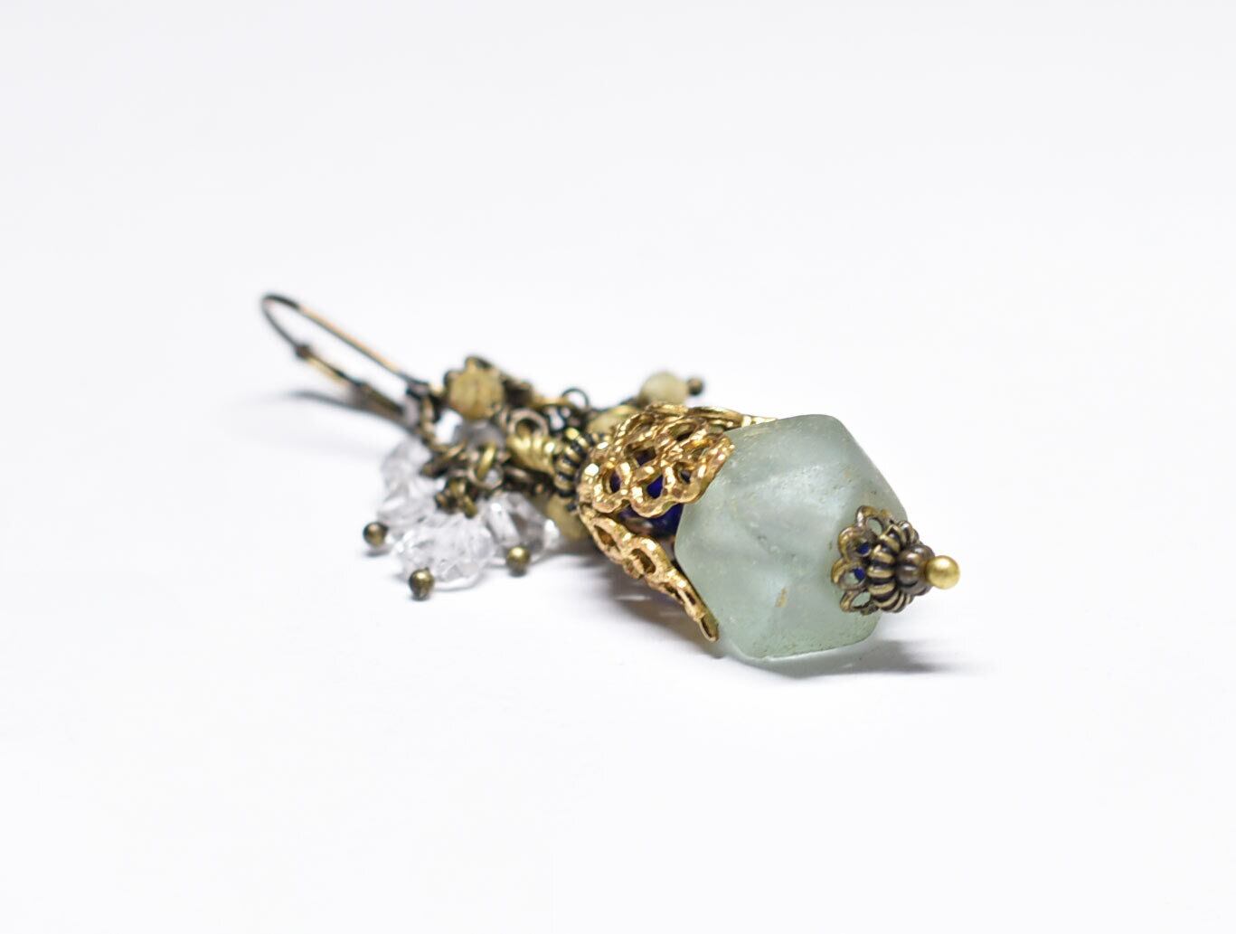 千草色ローマングラスビーズとたわわなラブラドライト&ハーキマーダイヤモンド、民族鈴の片耳ピアス