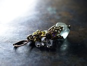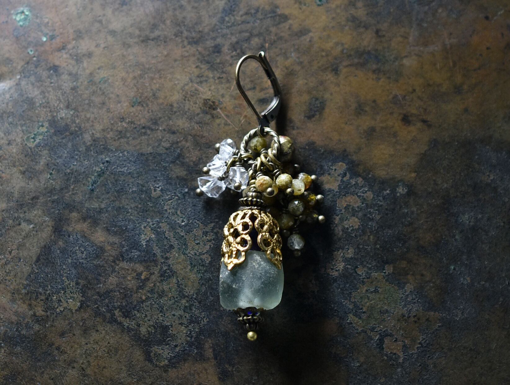 千草色ローマングラスビーズとたわわなラブラドライト&ハーキマーダイヤモンド、民族鈴を繋いだ片耳ピアスです。