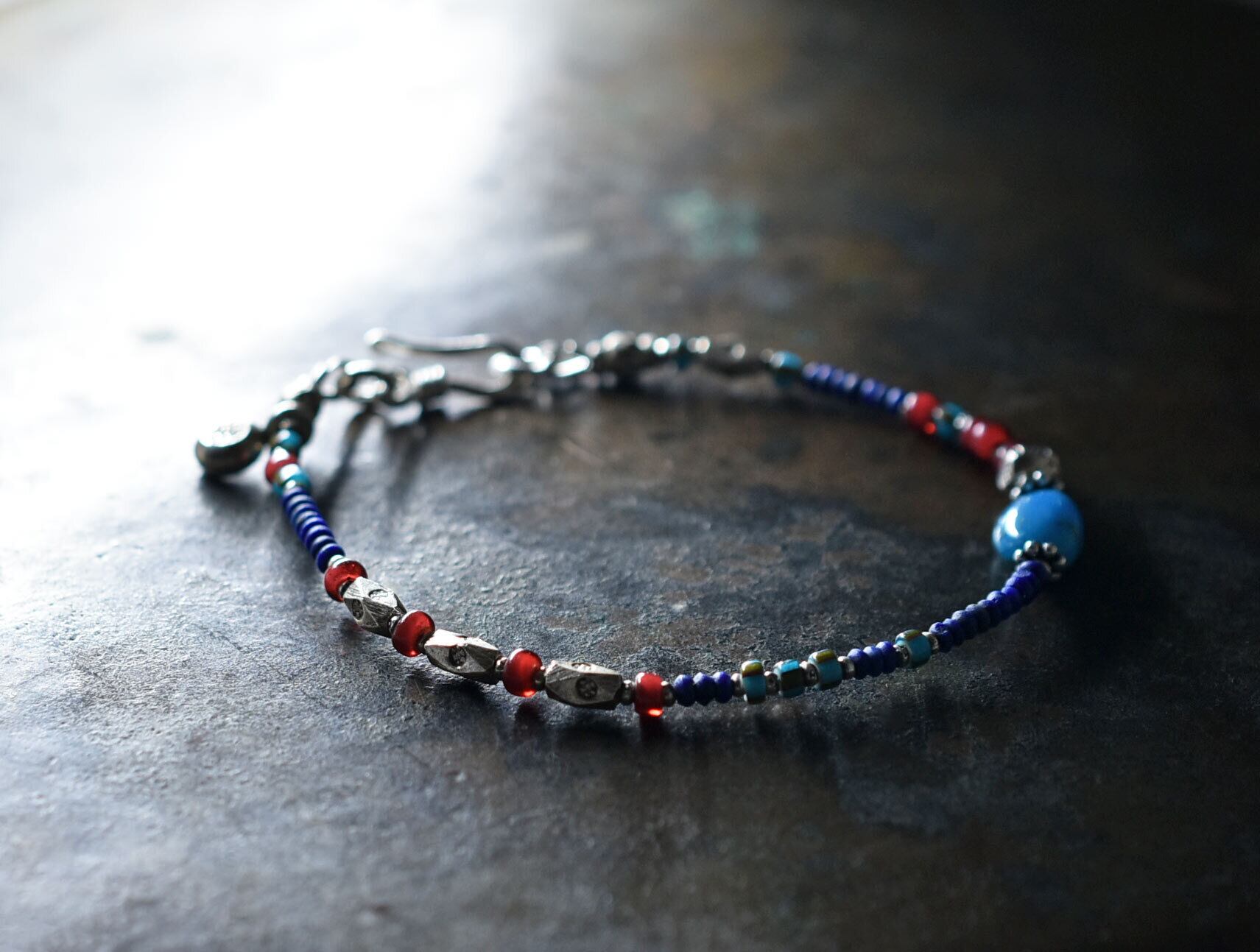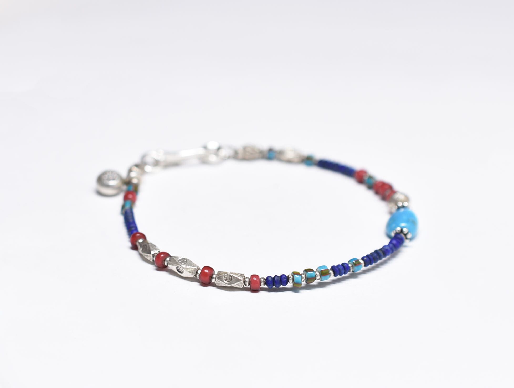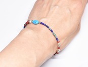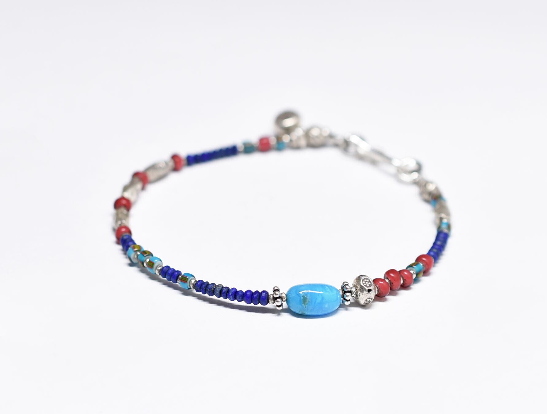 キングマンターコイズと金赤&ターコイズブルーホワイトハーツ、ラピス、カレンシルバーを繋いだ華奢なブレスです。