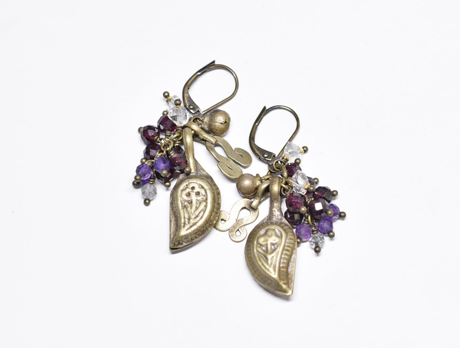 アフガニスタンメタルとたわわなガーネット&アメジスト、ラブラドライト、ハーキマーダイヤモンド、民族鈴のピアス