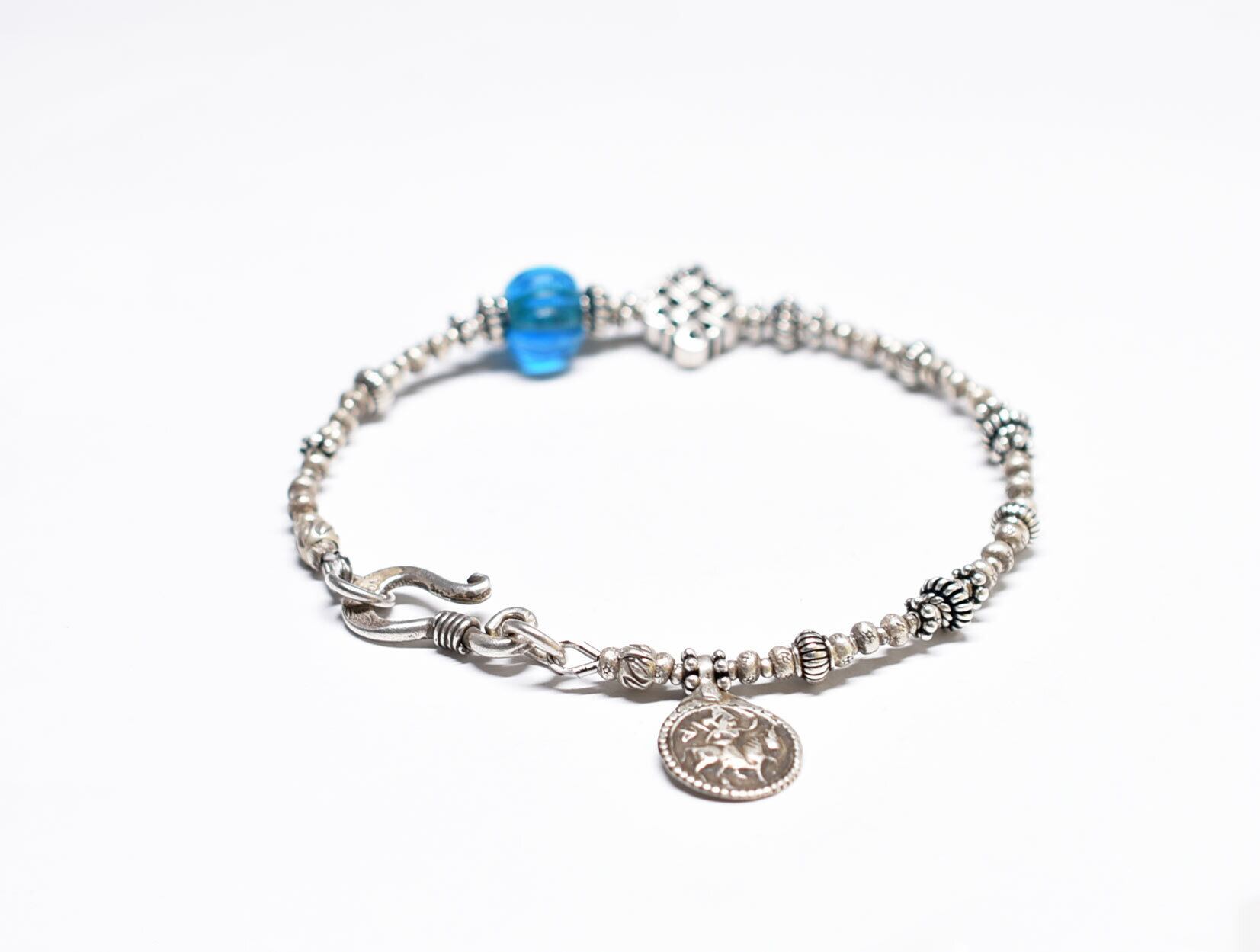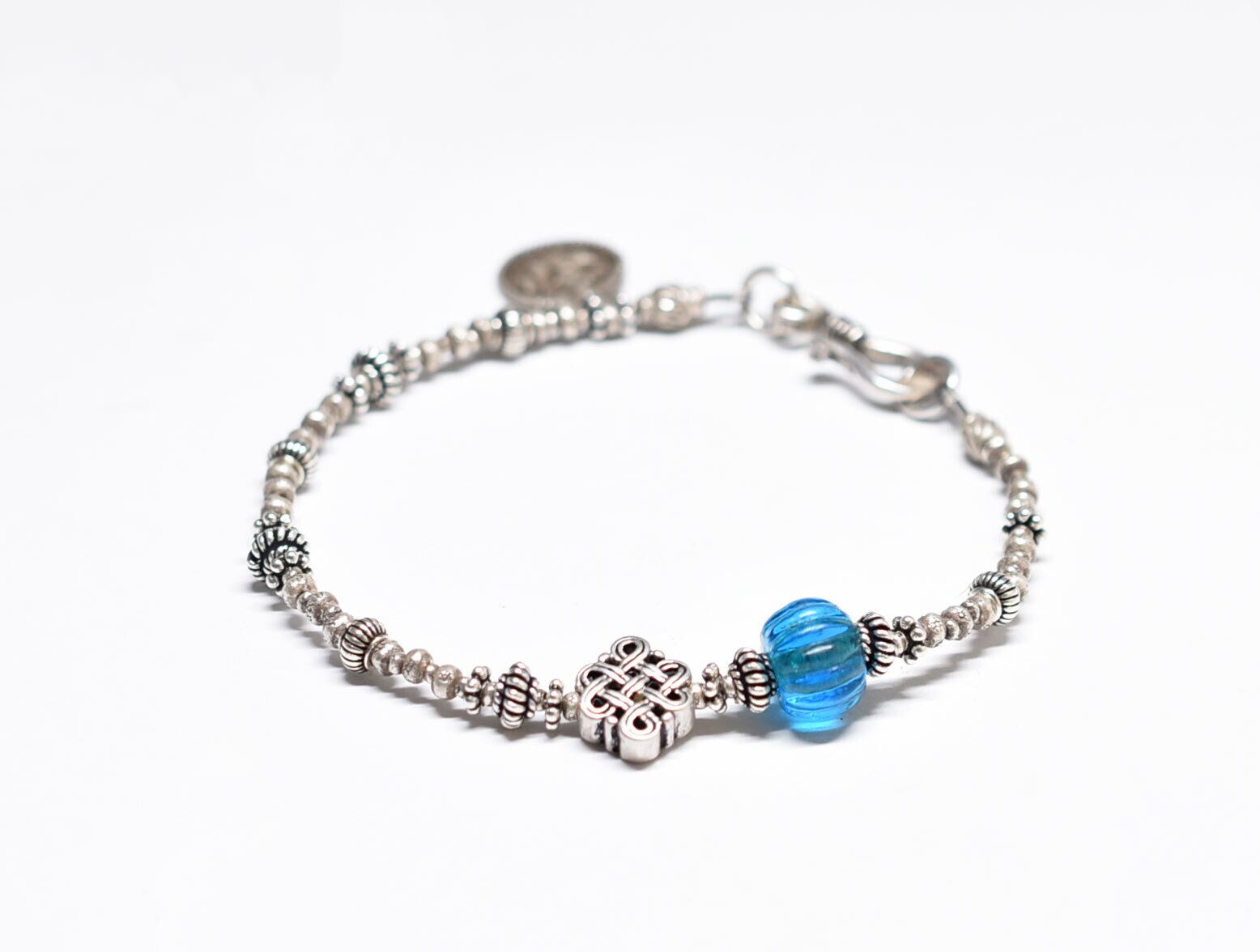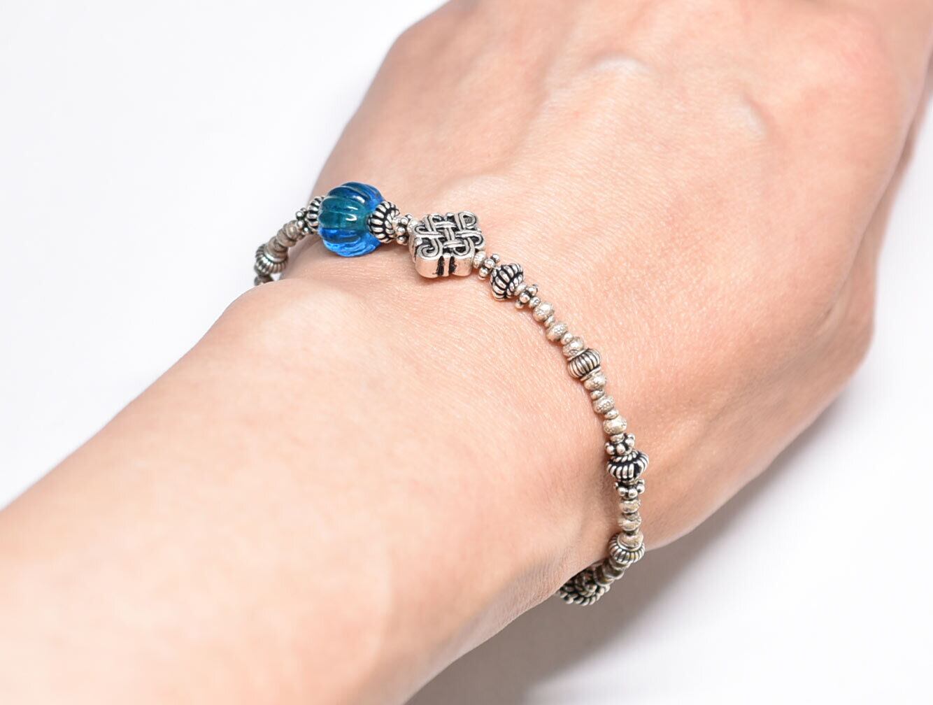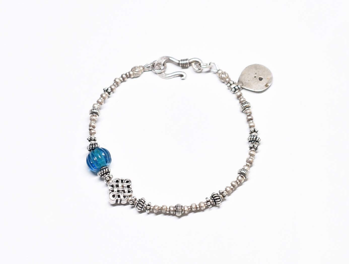 oldブルー蜜柑玉とエンドレスノット、多彩なシルバービーズoldインドシルバーチャームを繋いだブレスです。