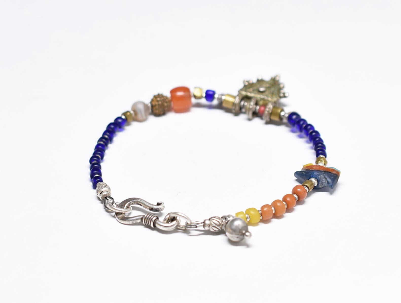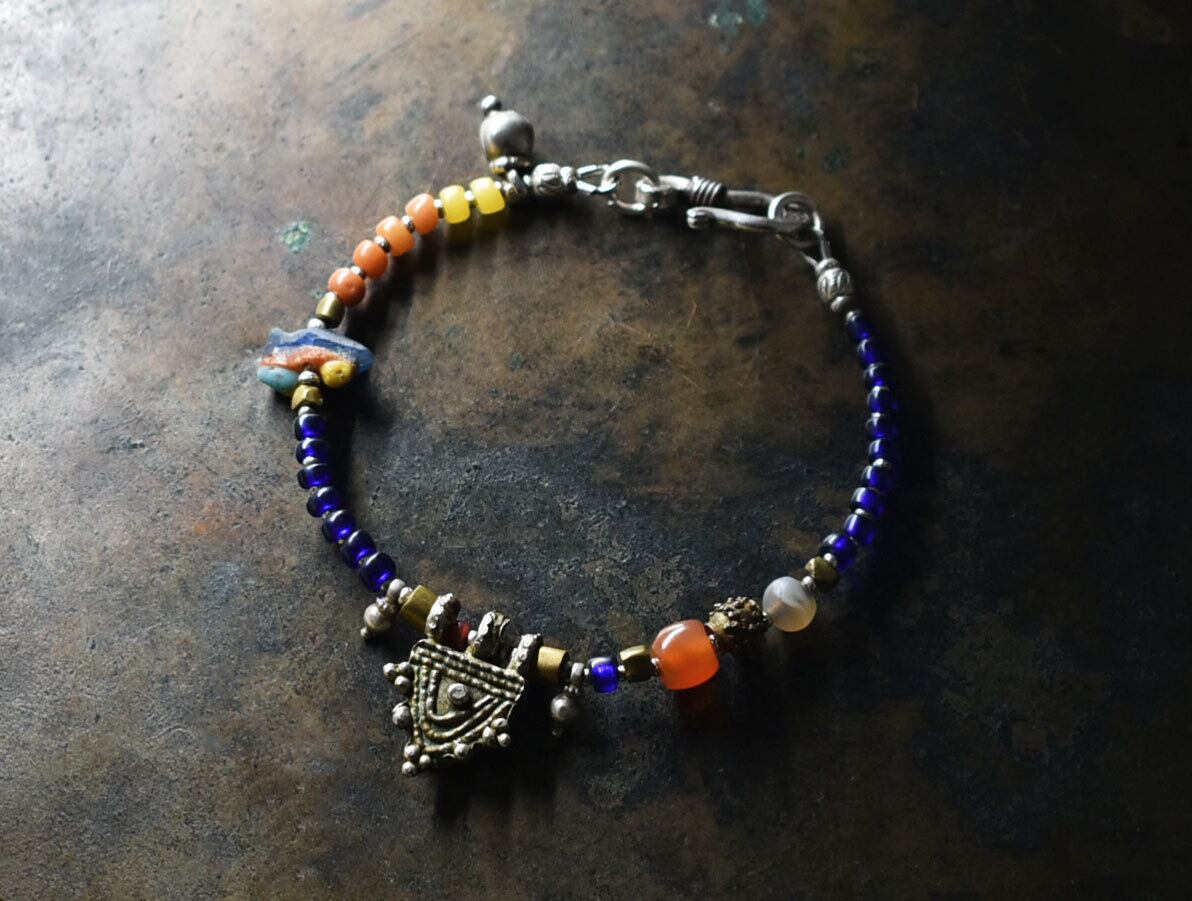 ミエチオピアンシルバーとoldインドシルバーチャーム、ゾーラムカーネリアンと古代瑪瑙、小鳥ローマングラス、ブルーアンティークビーズ、oldオリッサブラスなどを繋いだブレスです。
