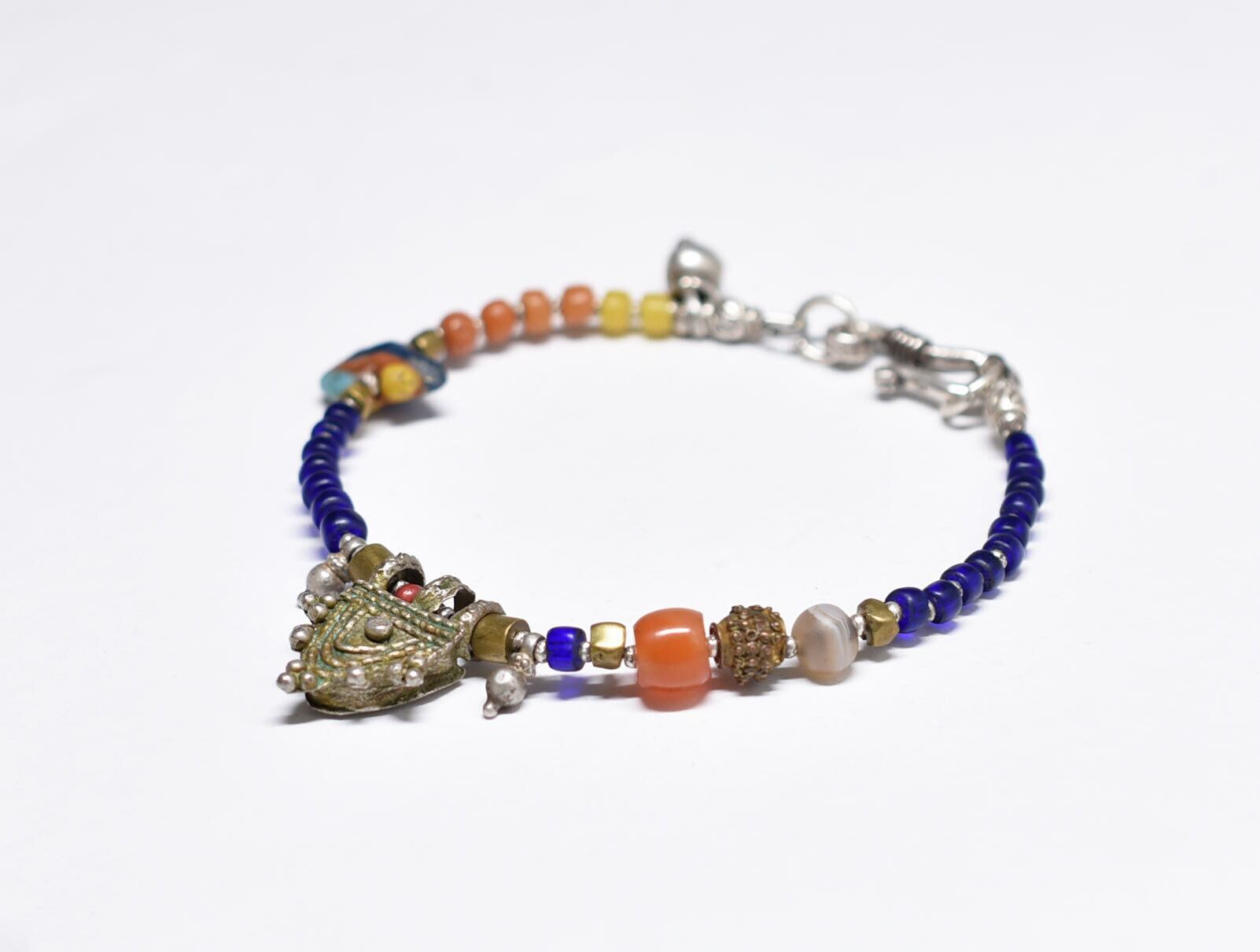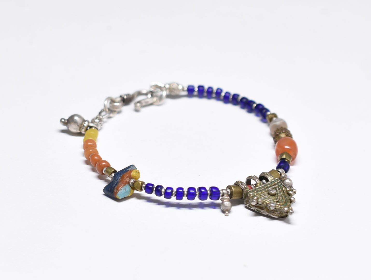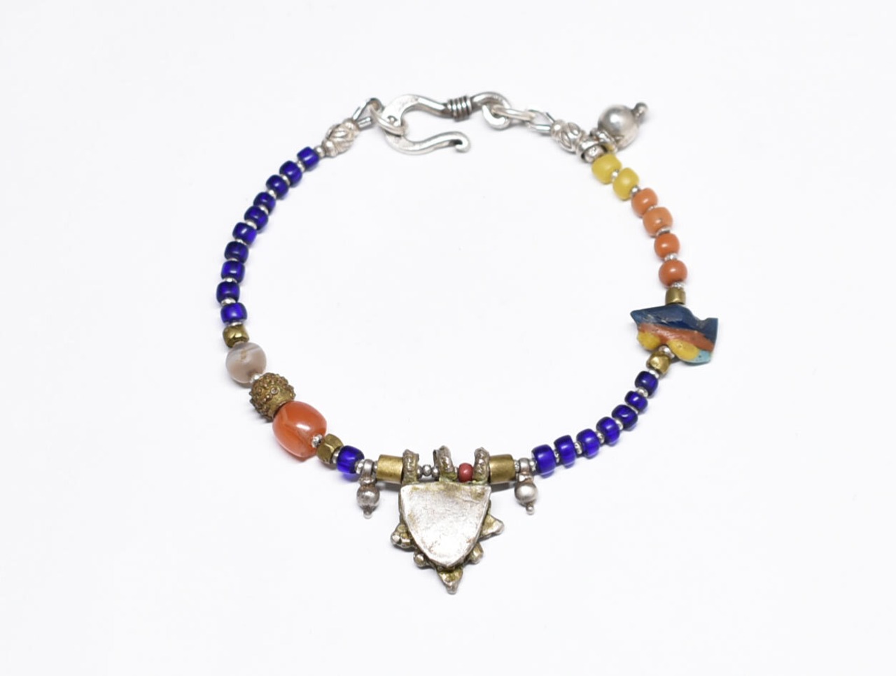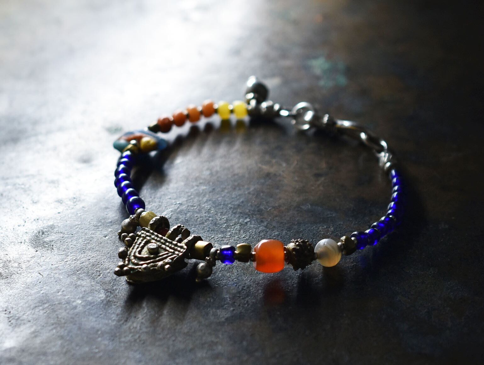 ミエチオピアンシルバーとoldインドシルバーチャーム、ミゾーラムカーネリアンと古代瑪瑙、小鳥ローマングラス、ブルーアンティークビーズのブレス