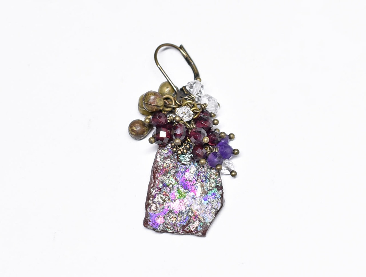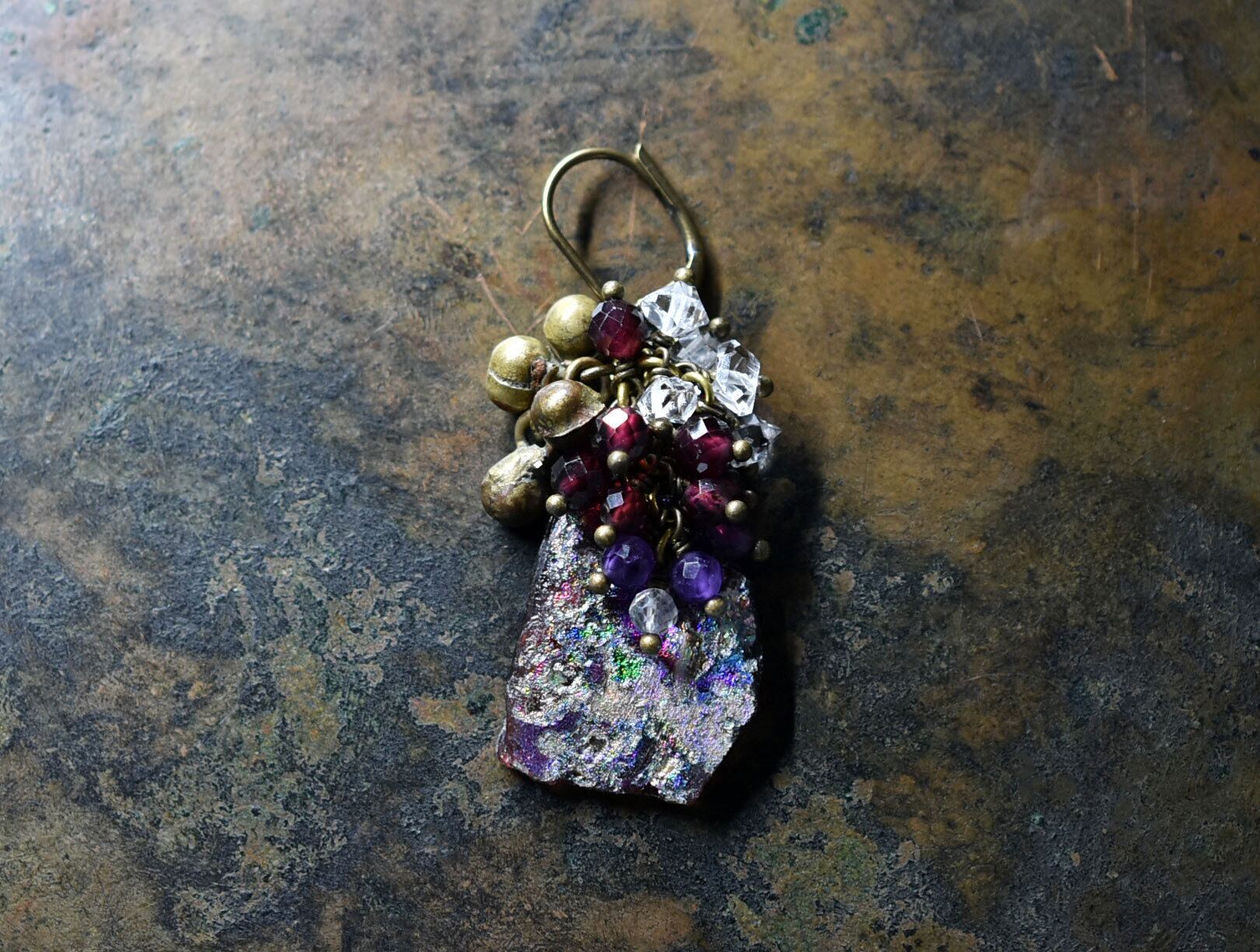 美しい銀化パープルローマングラスとたわわなストーンビーズ、民族鈴、ハーキマーダイヤモンドの片耳ピアス