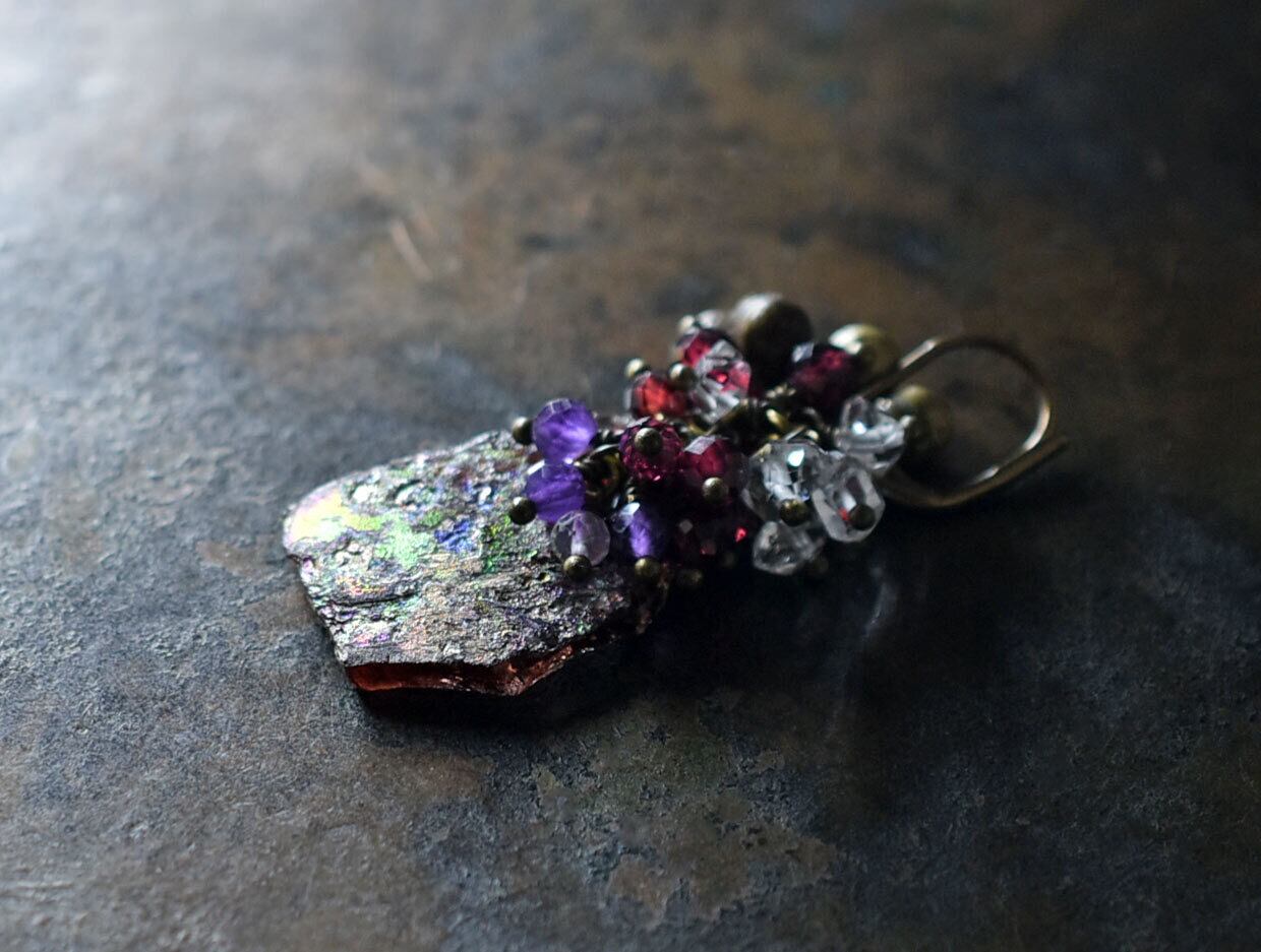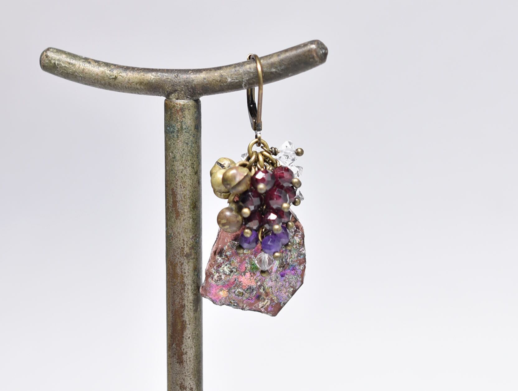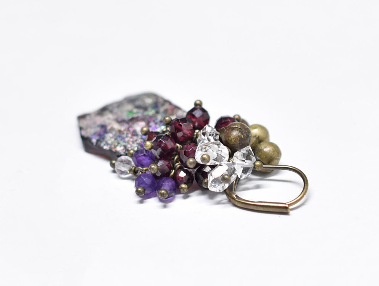 美しい銀化パープルとたわわなストーンビーズ、民族鈴、ハーキマーダイヤモンドを繋いだ片耳のピアスです。