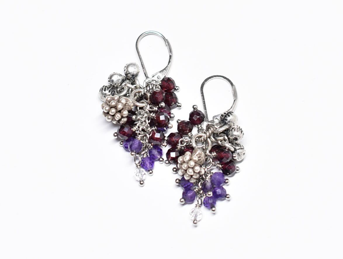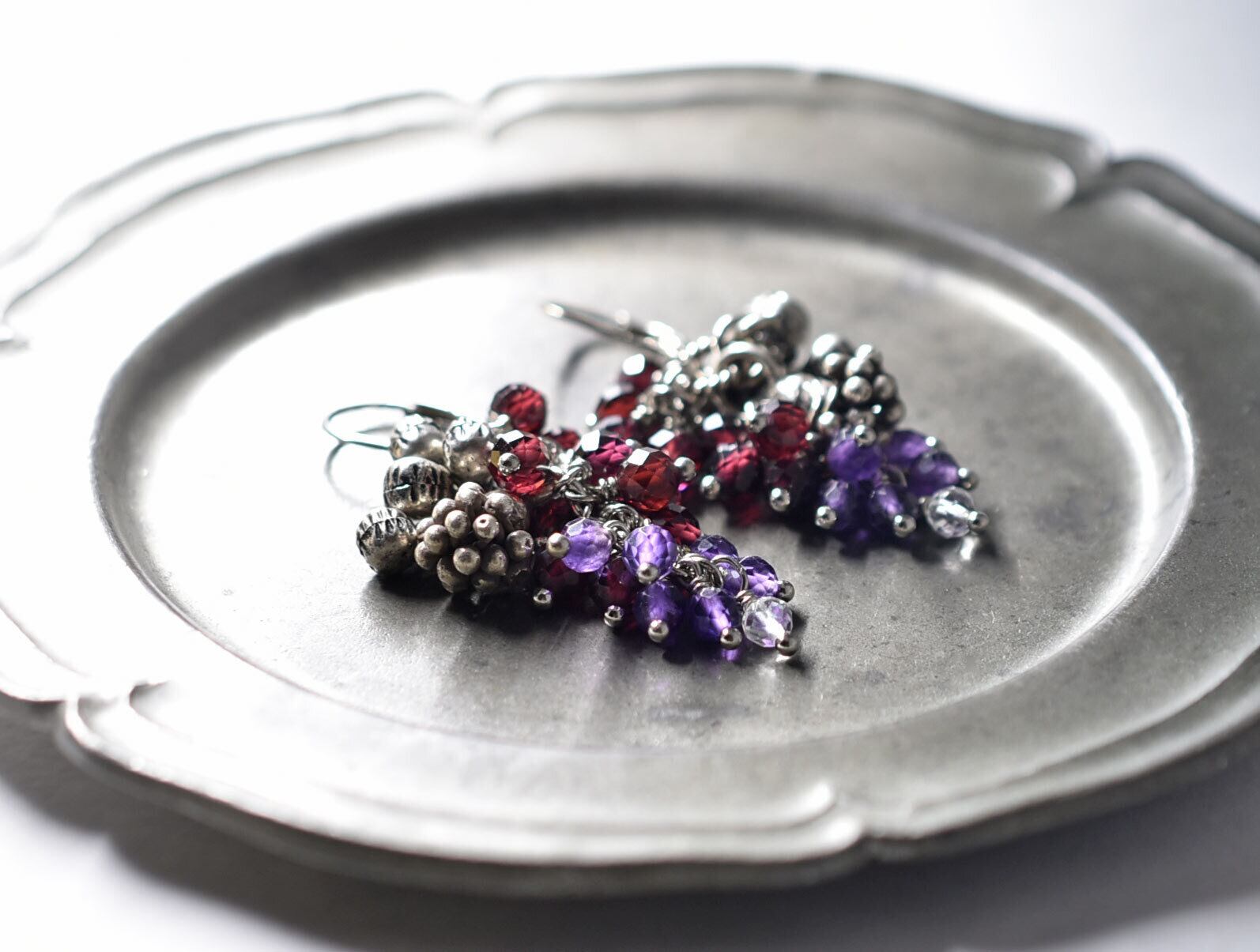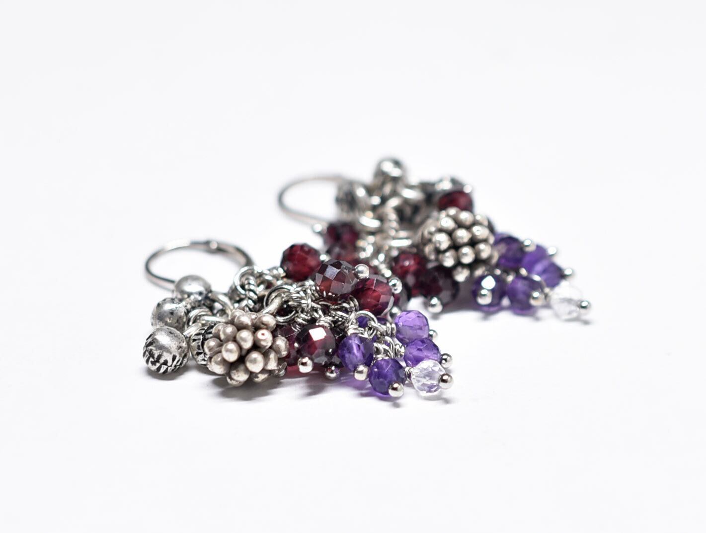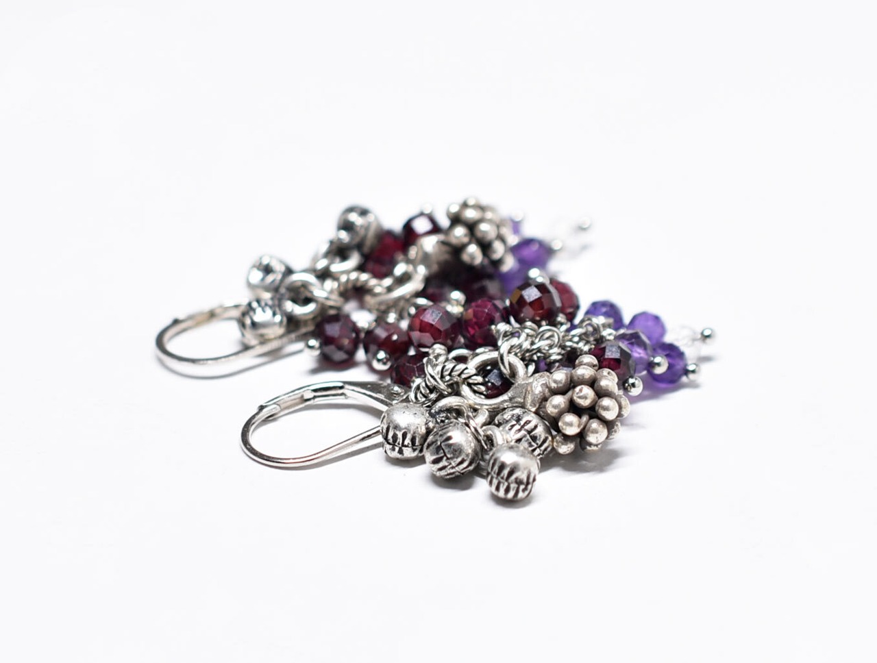 蕾カレンシルバーとたわわなガーネット&アメジスト&クォーツ、インドシルバー鈴のピアス