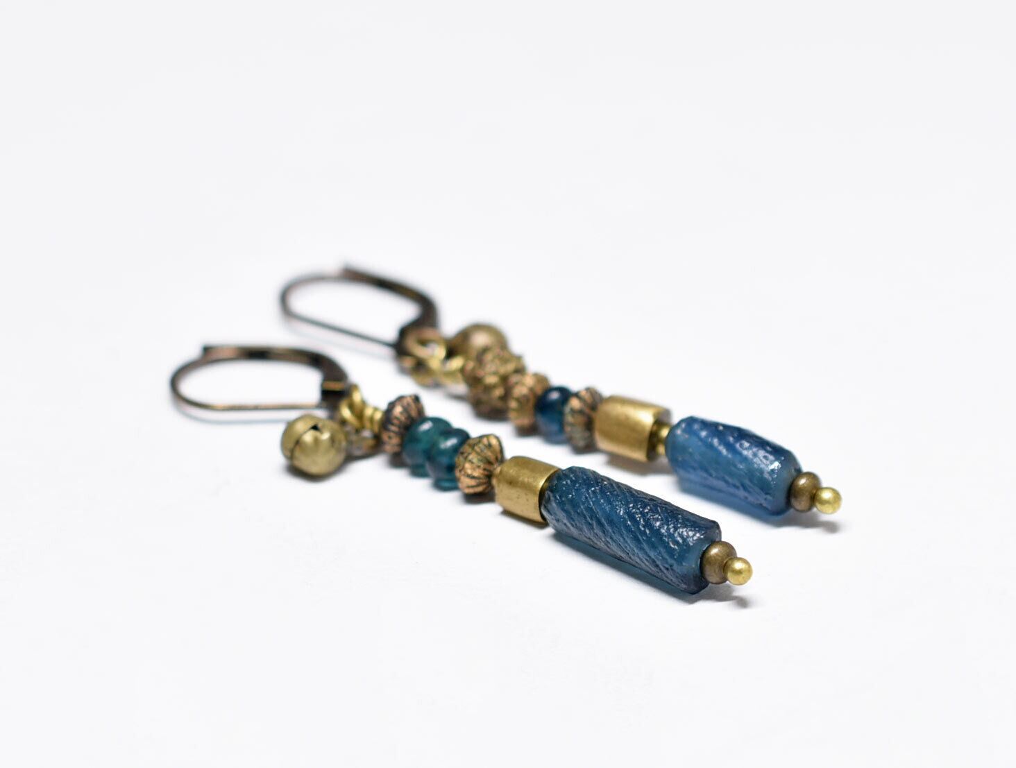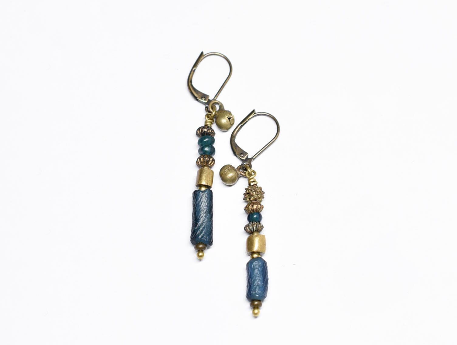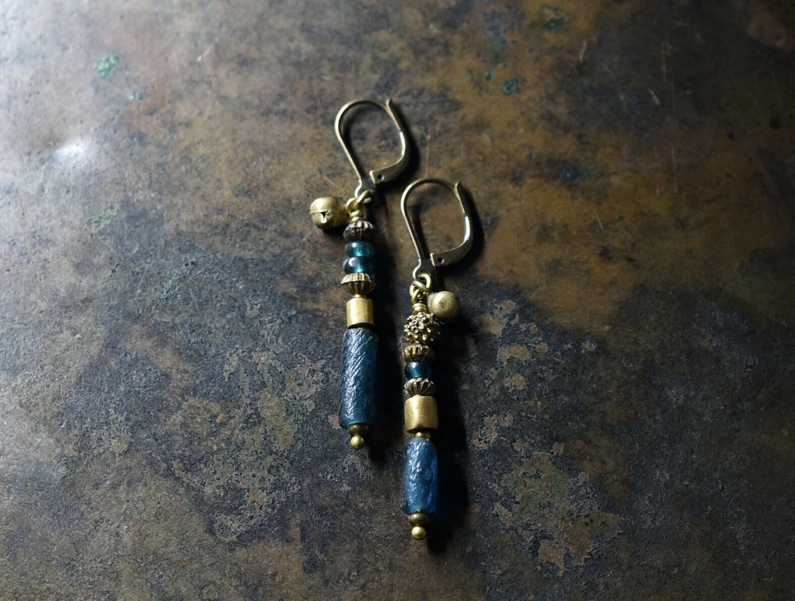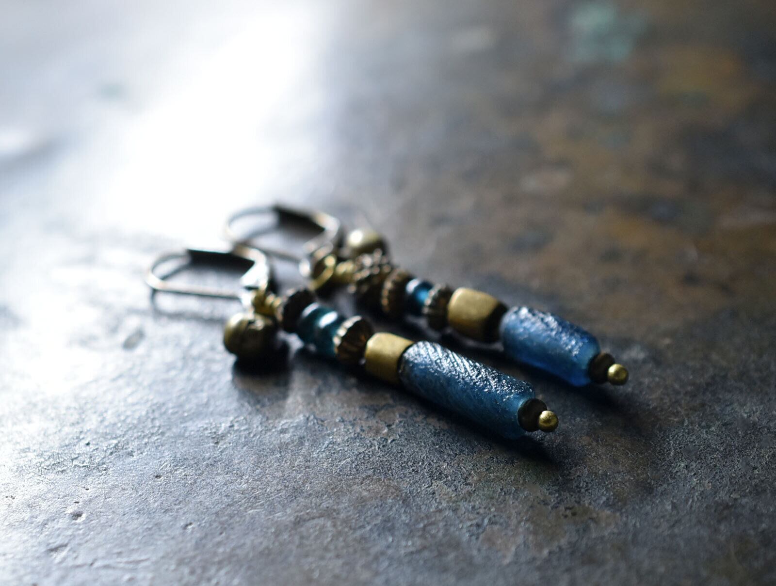藍色ローマングラスとoldオリッサブラス&つぶつぶブラス、インディゴブルービーズのスリムなピアス
