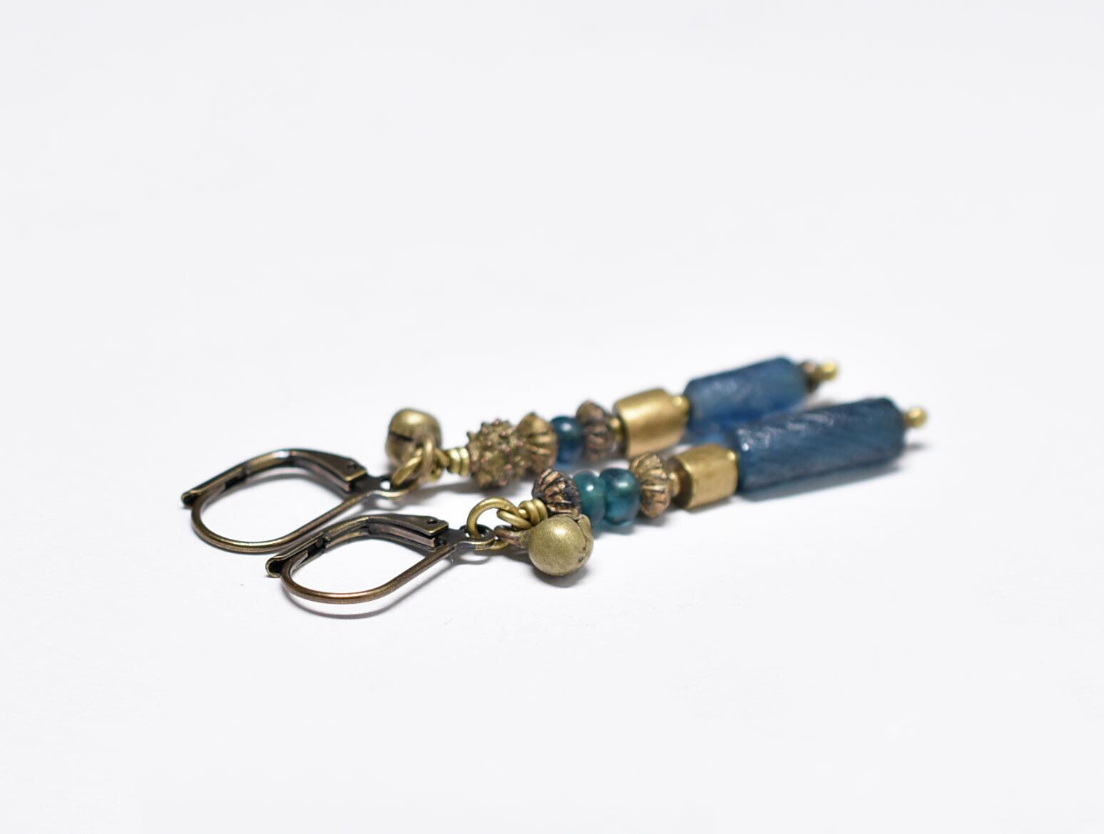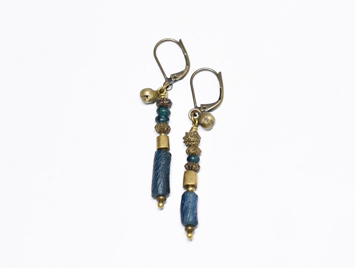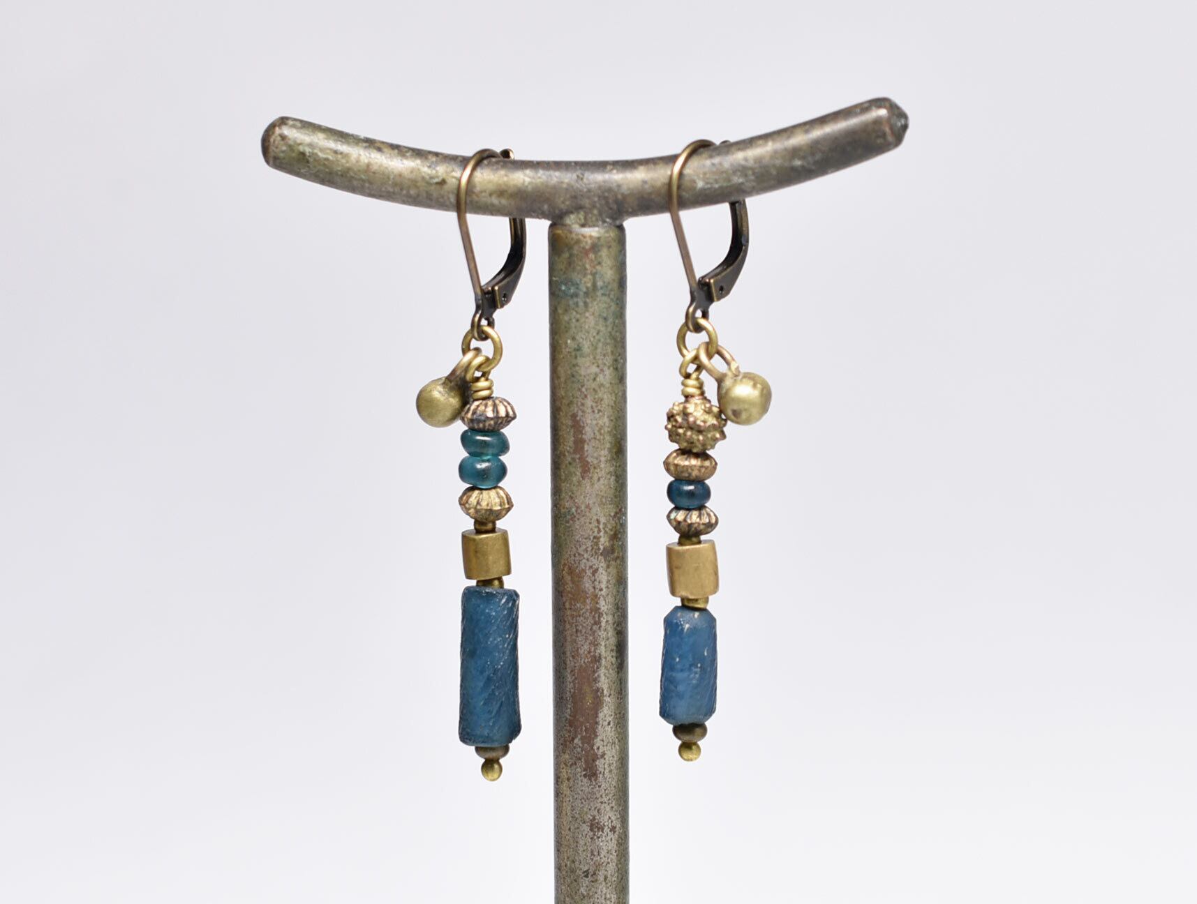 様々な古いブラスと、古代ガラスが楽しめるスリムなピアスです。