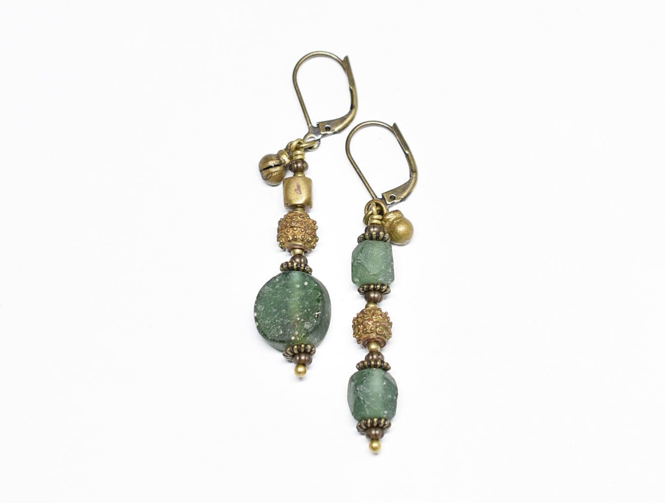 グリーンローマングラスとoldオリッサブラス&つぶつぶブラス、民族鈴を繋いだピアスです。