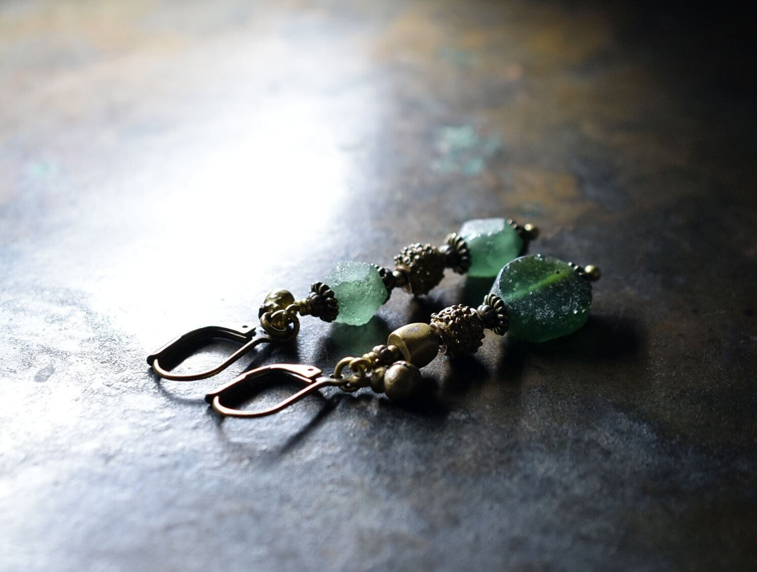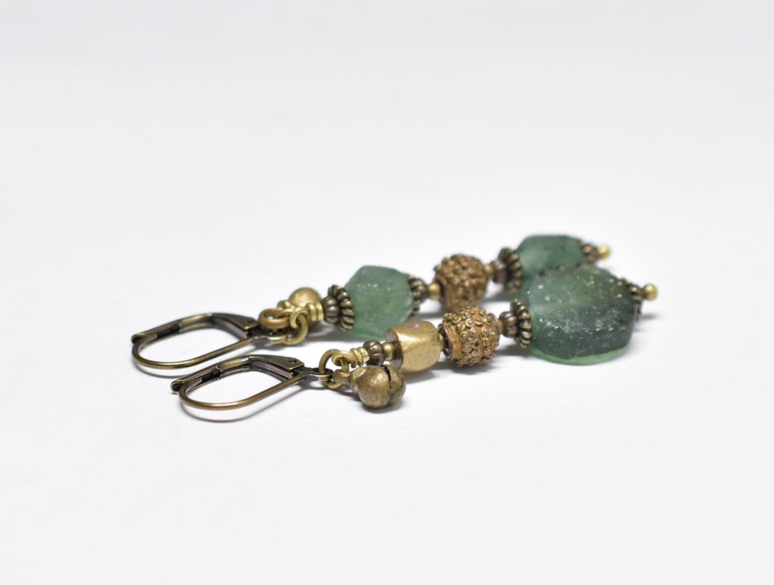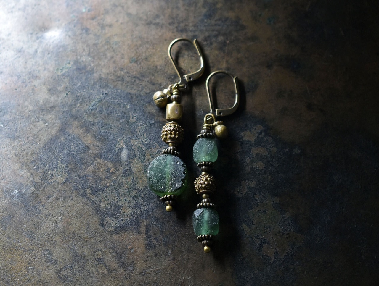 様々な古いブラスと、古代ガラスが楽しめるスリムなピアスです。