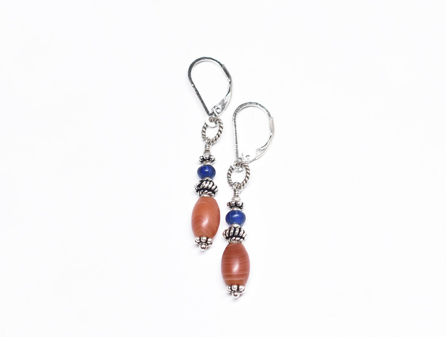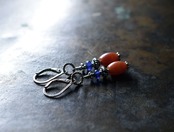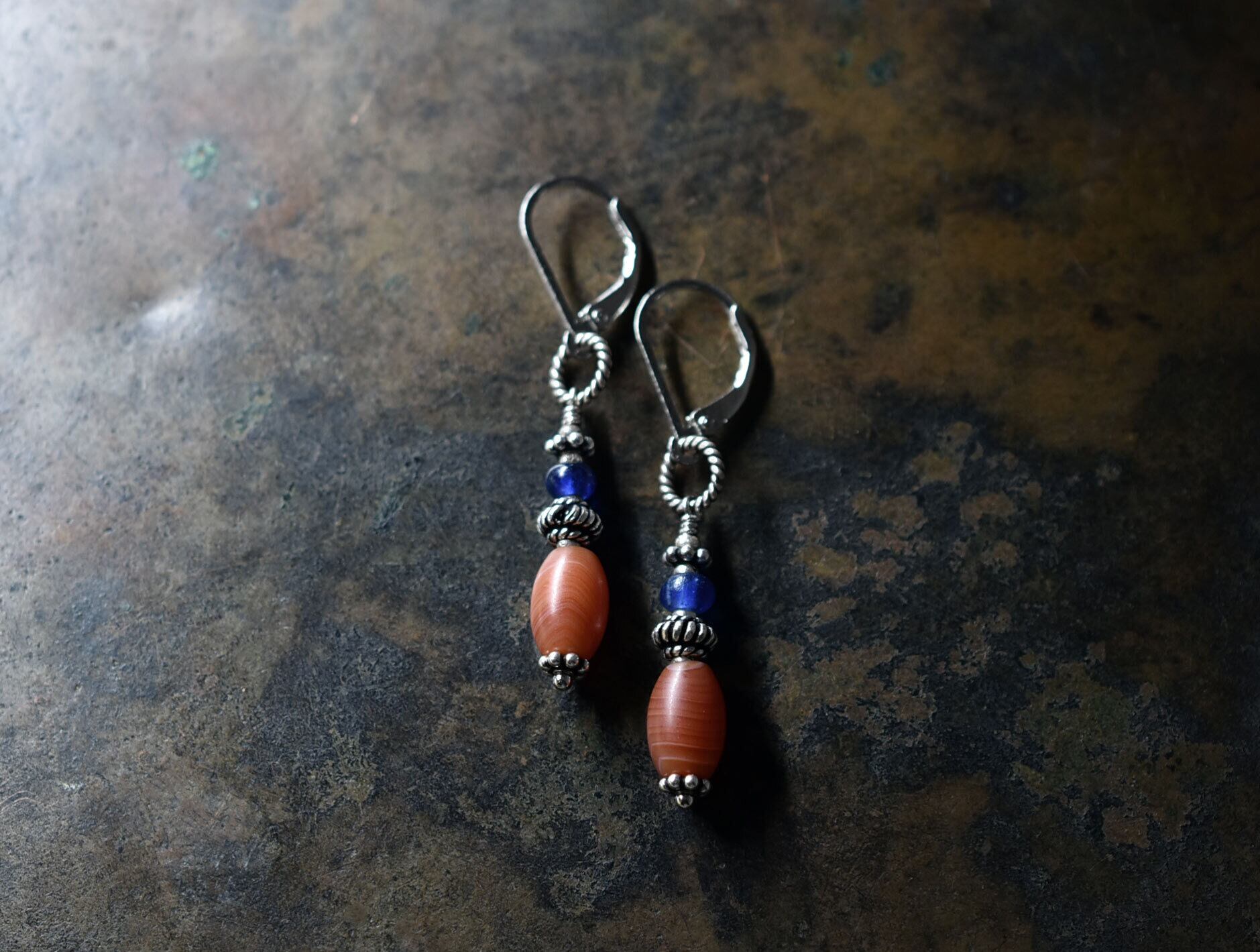シャン族ヴィンテージカーネリアンとシルバービーズ、ブルーアンティークビーズを繋いだピアスです。
