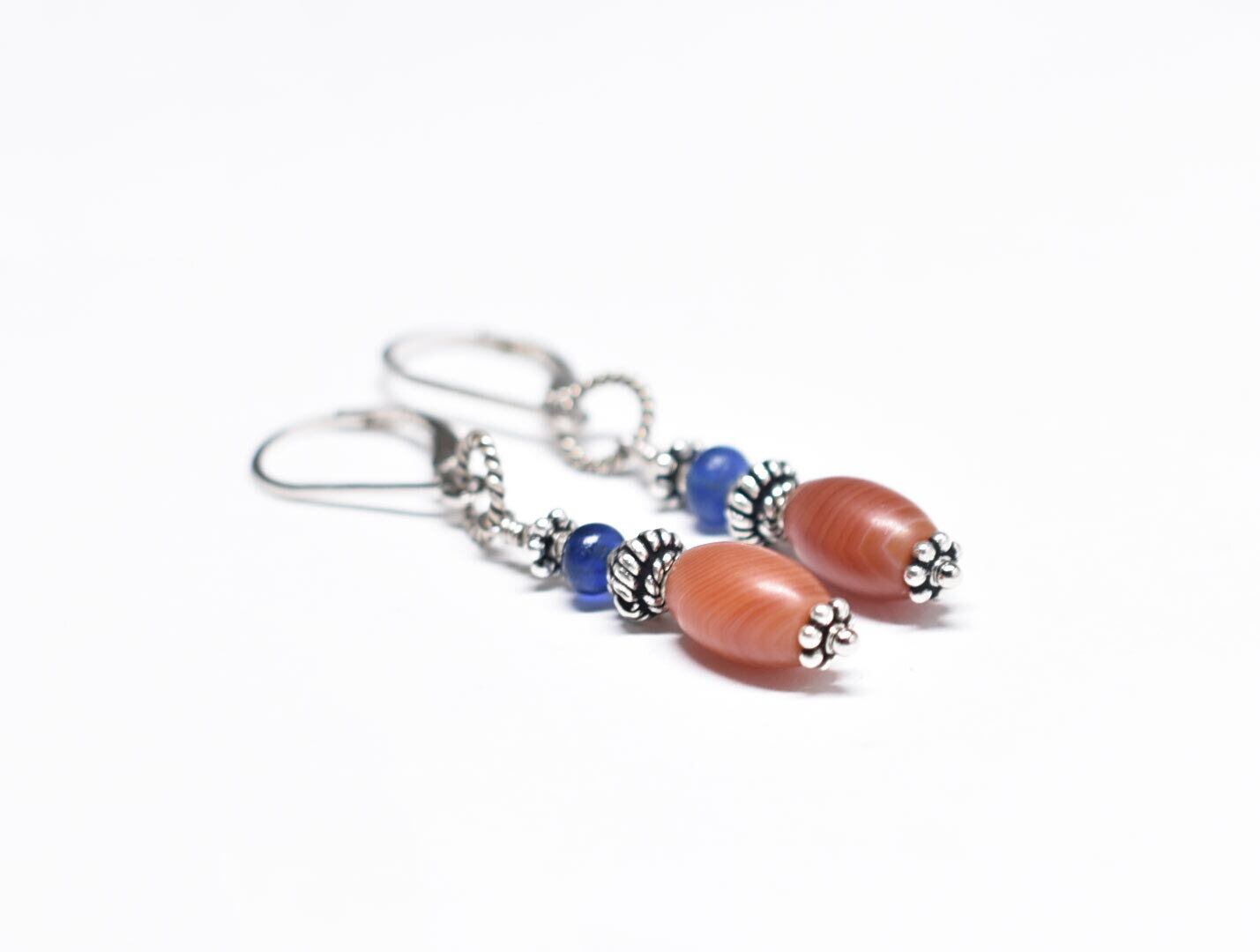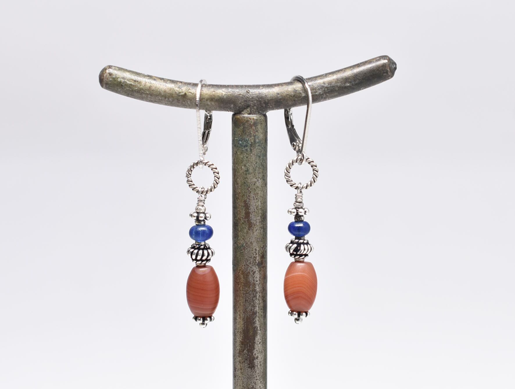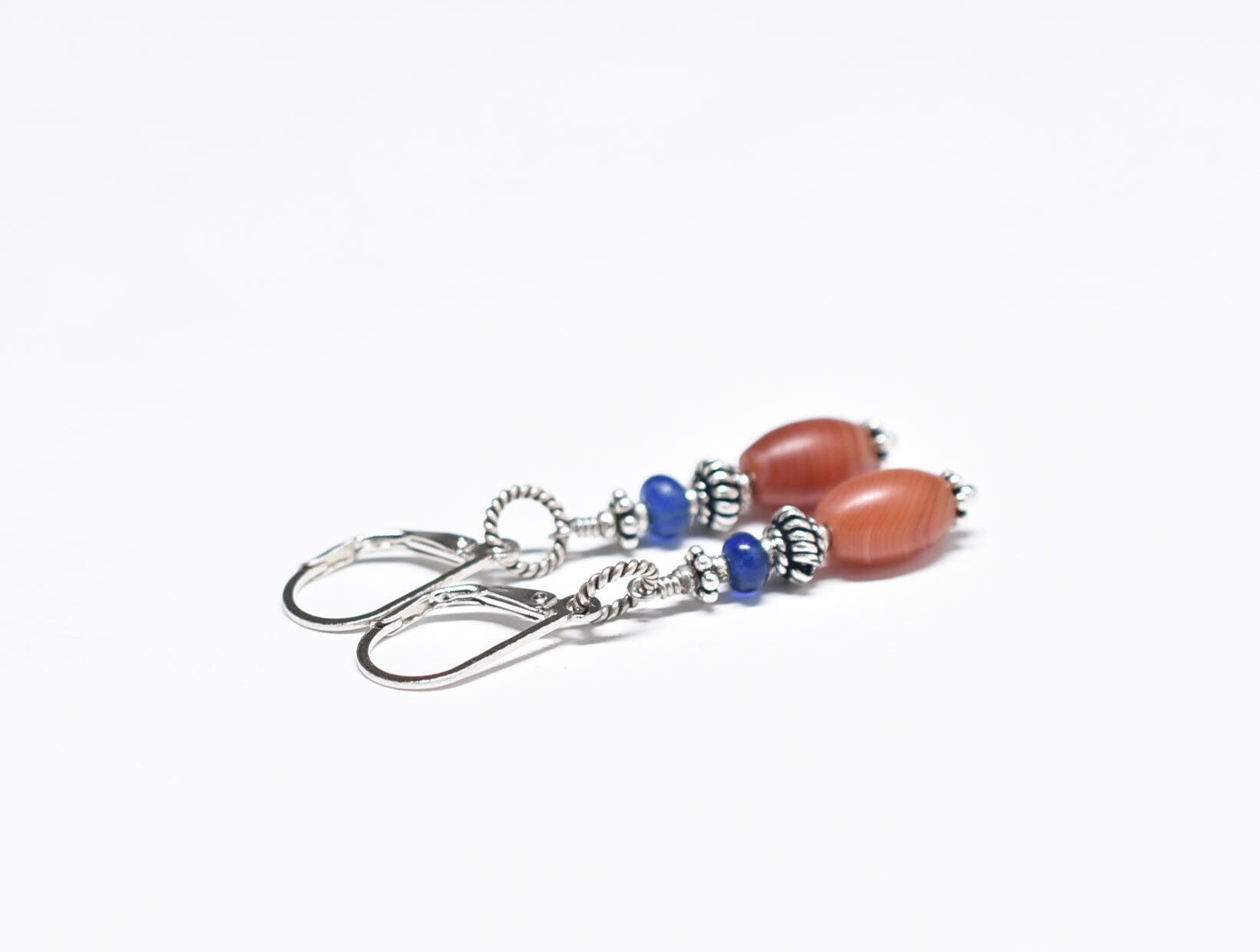 シャン族ヴィンテージカーネリアンとシルバービーズ、ブルーアンティークビーズのピアス