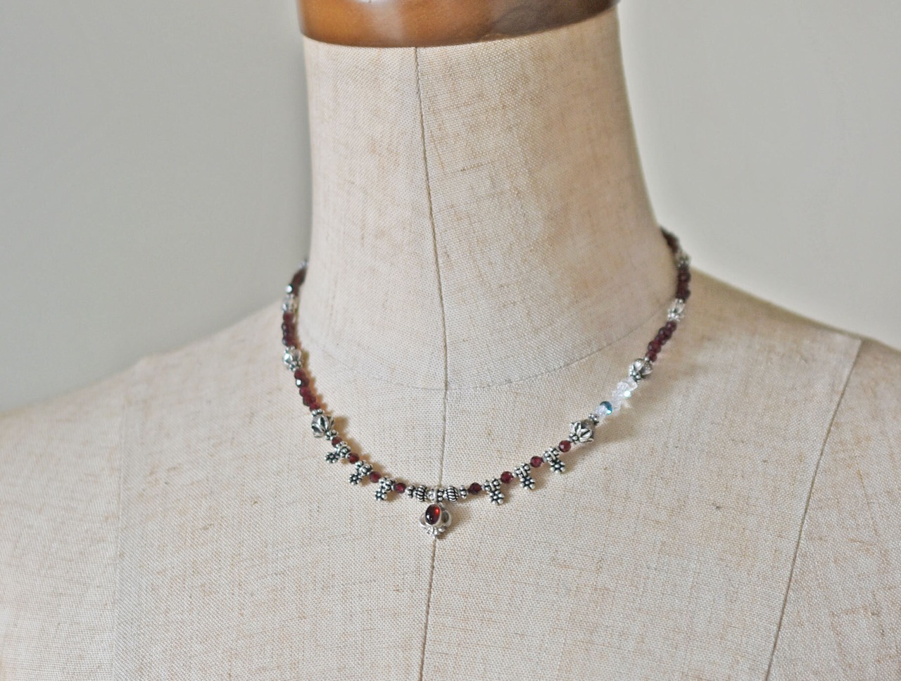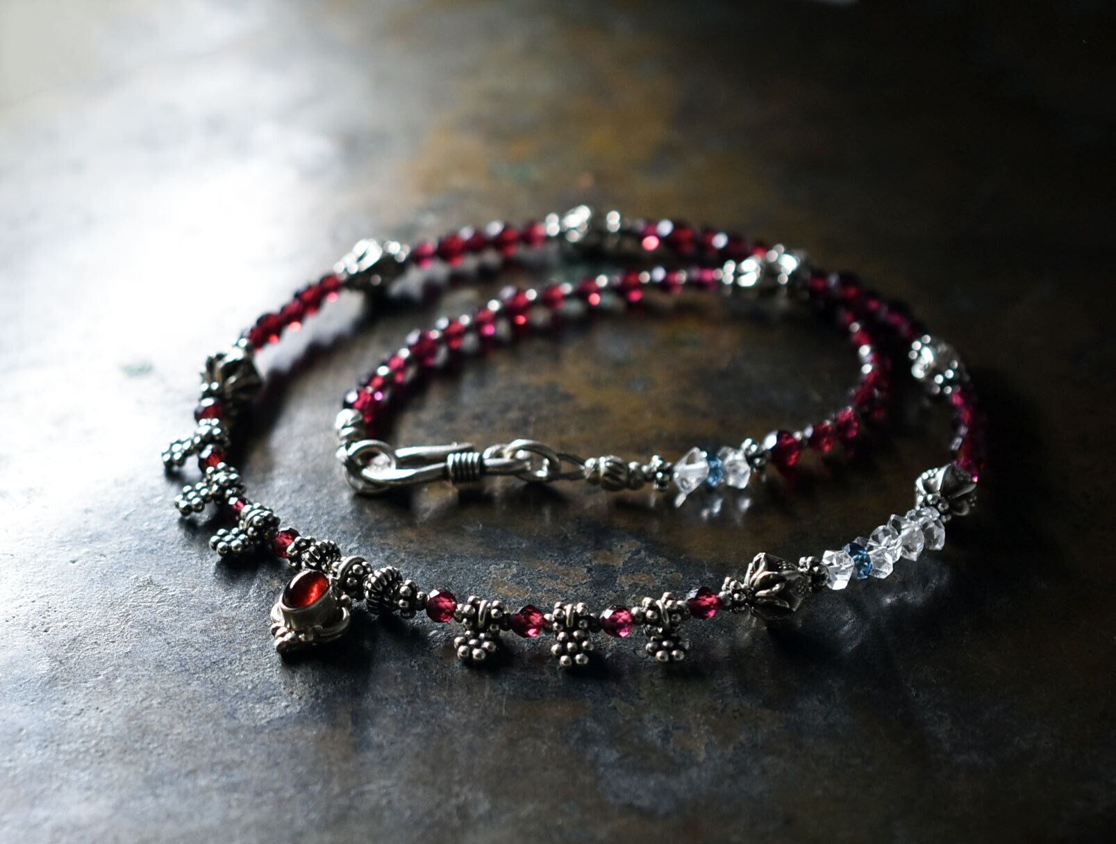 ガーネットとシルバーのコントラスが目を惹く異国感を感じられる、落ち着く重さのあるネックレスです。