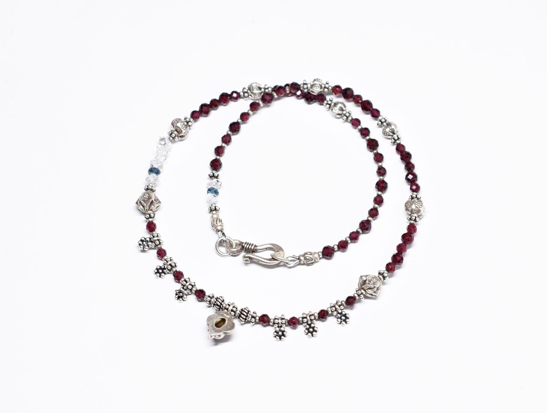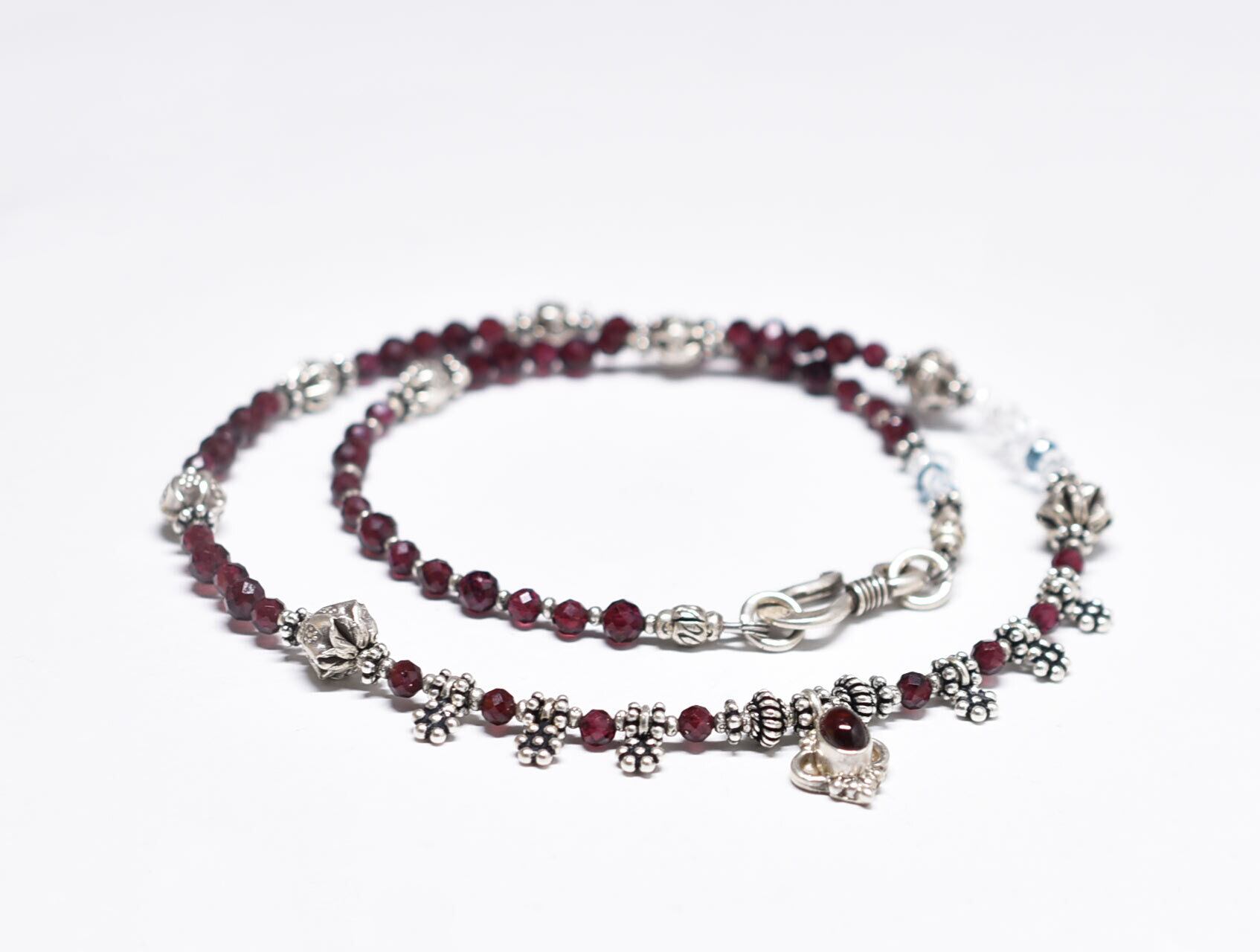 シルバー装飾ガーネットとお花インドシルバー、ハーキマーダイヤモンド、ロンドンブルートパーズ、カレンシルバー、ガーネットのネックレス