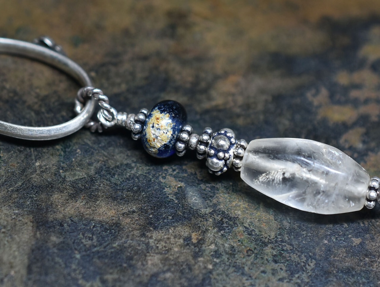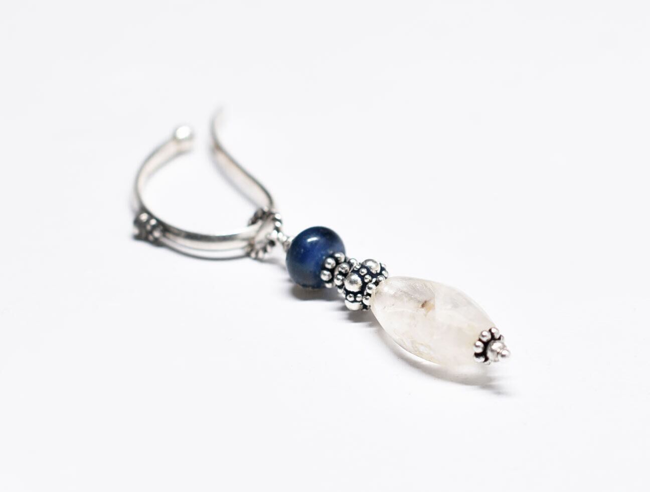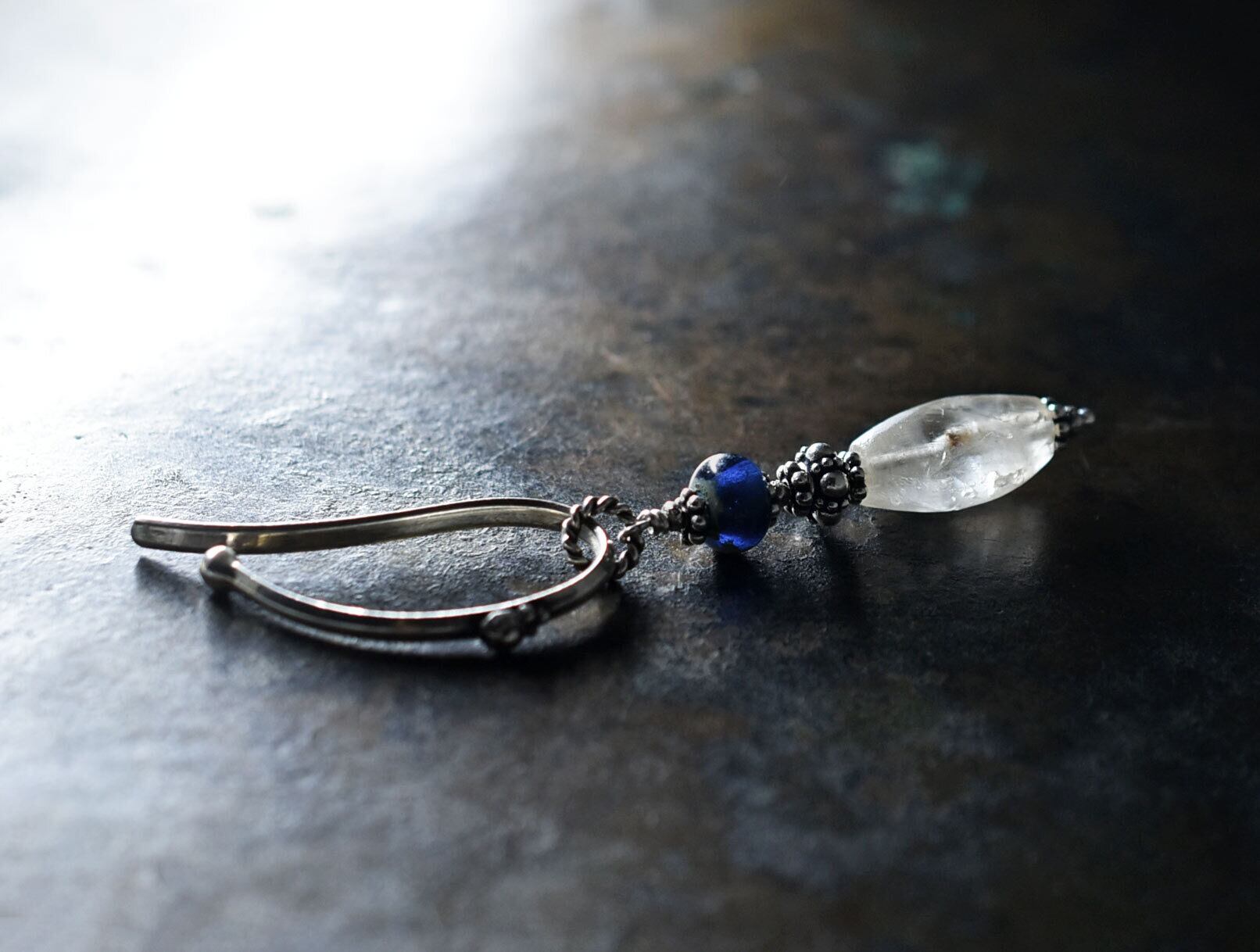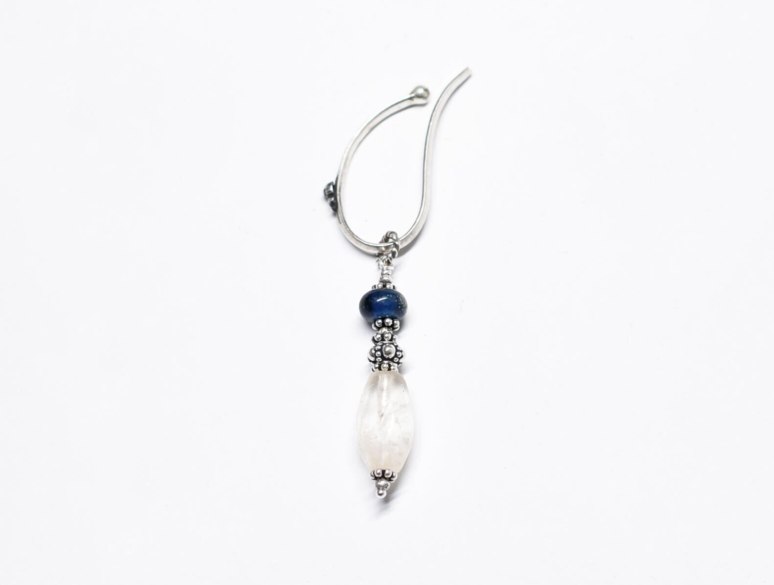 スリムな古代水晶と瑠璃紺色ローマングラスビーズ、シルバービーズを繋いだインドシルバーイヤーカフです。