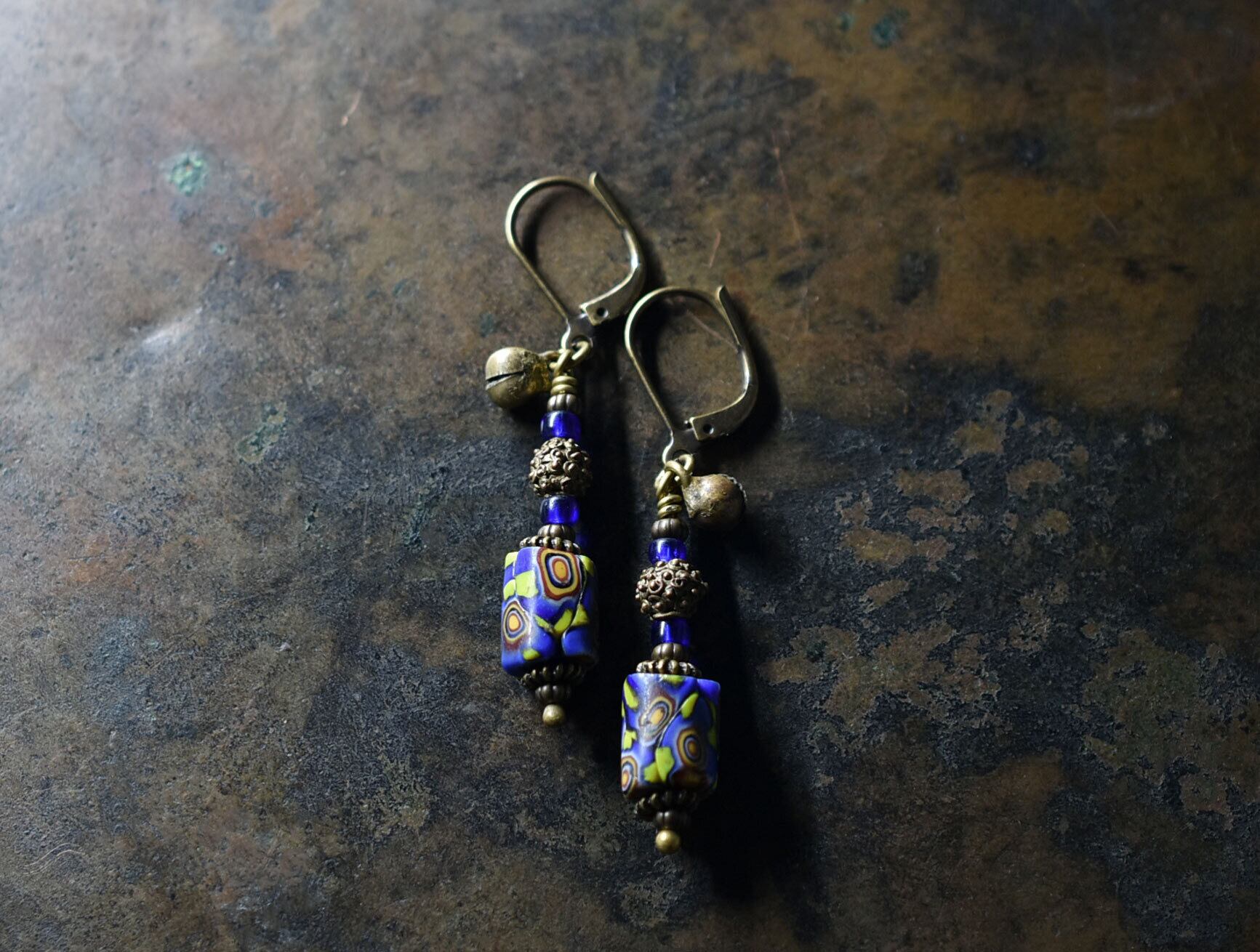 小さなミルフィオリビーズとつぶつぶブラス、ブルーアンティークビーズ、民族鈴のピアス