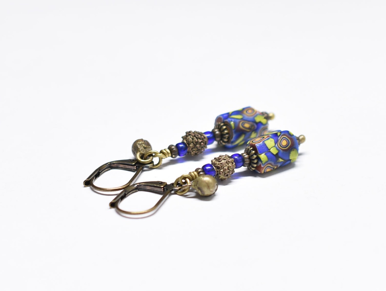 小さなミルフィオリビーズとつぶつぶブラス、ブルーアンティークビーズ、民族鈴を繋いだピアスです。