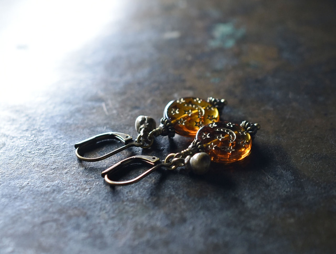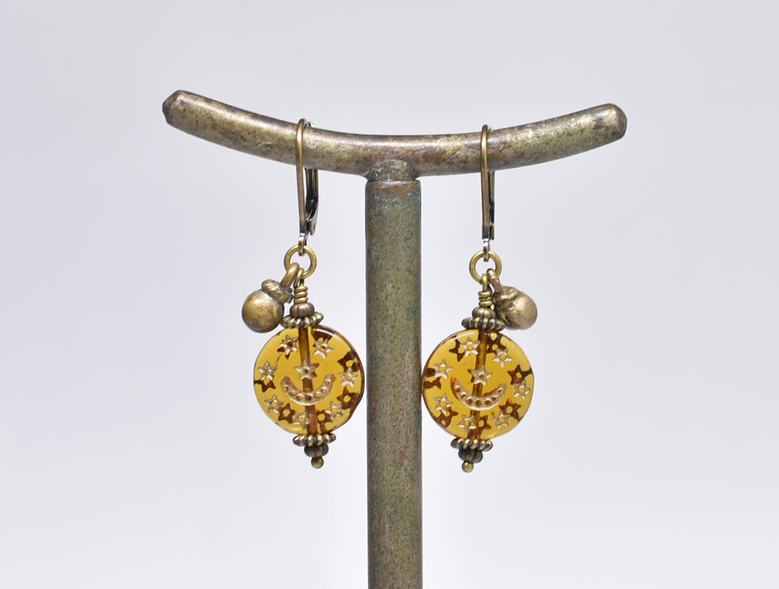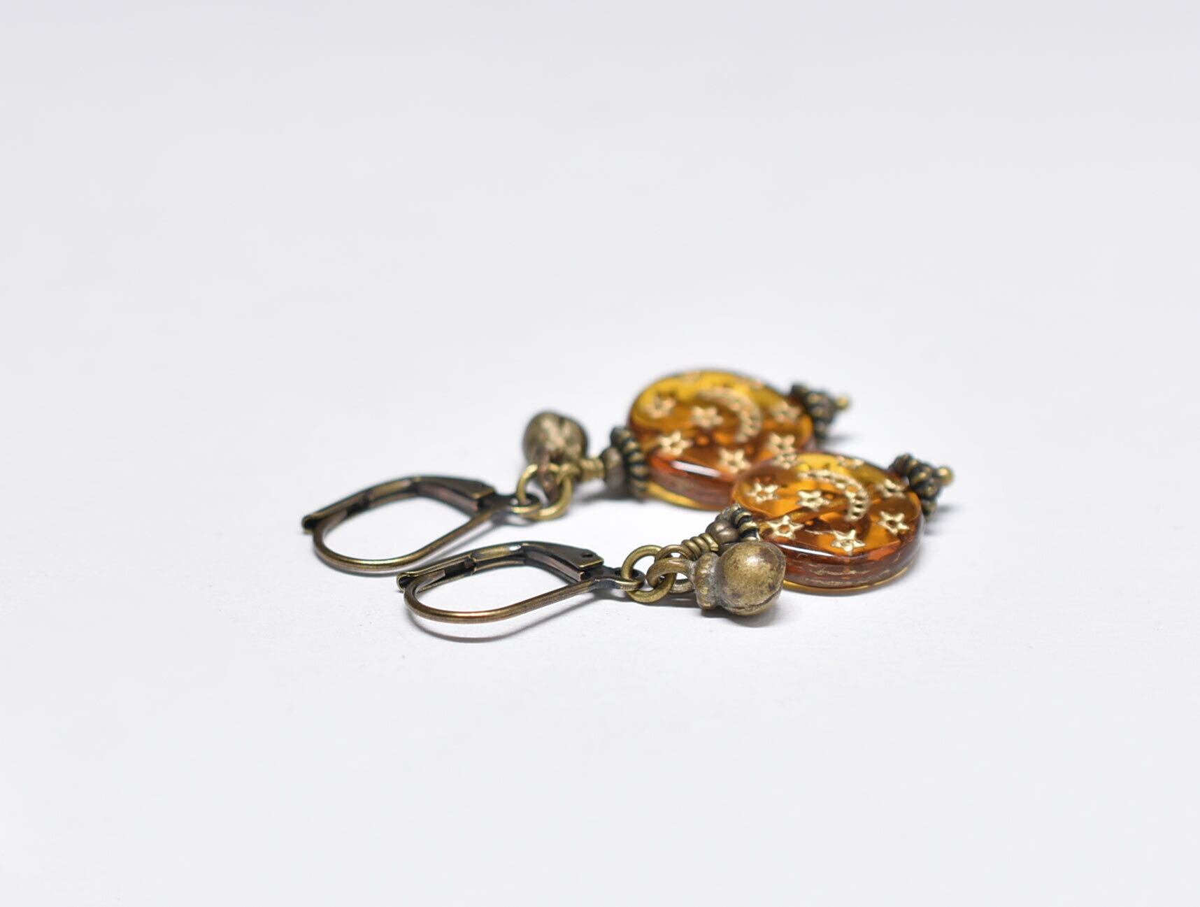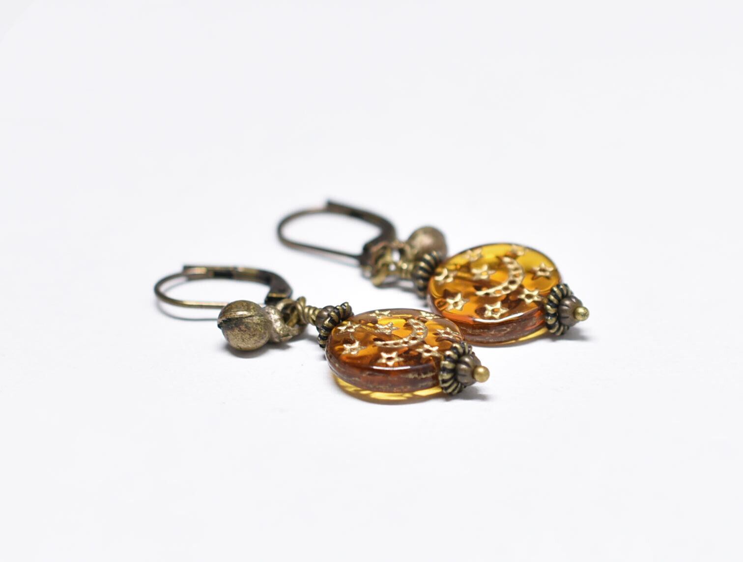 月と星の模様が施された聖者のビーズと、小さな鈴を繋いだピアスです。