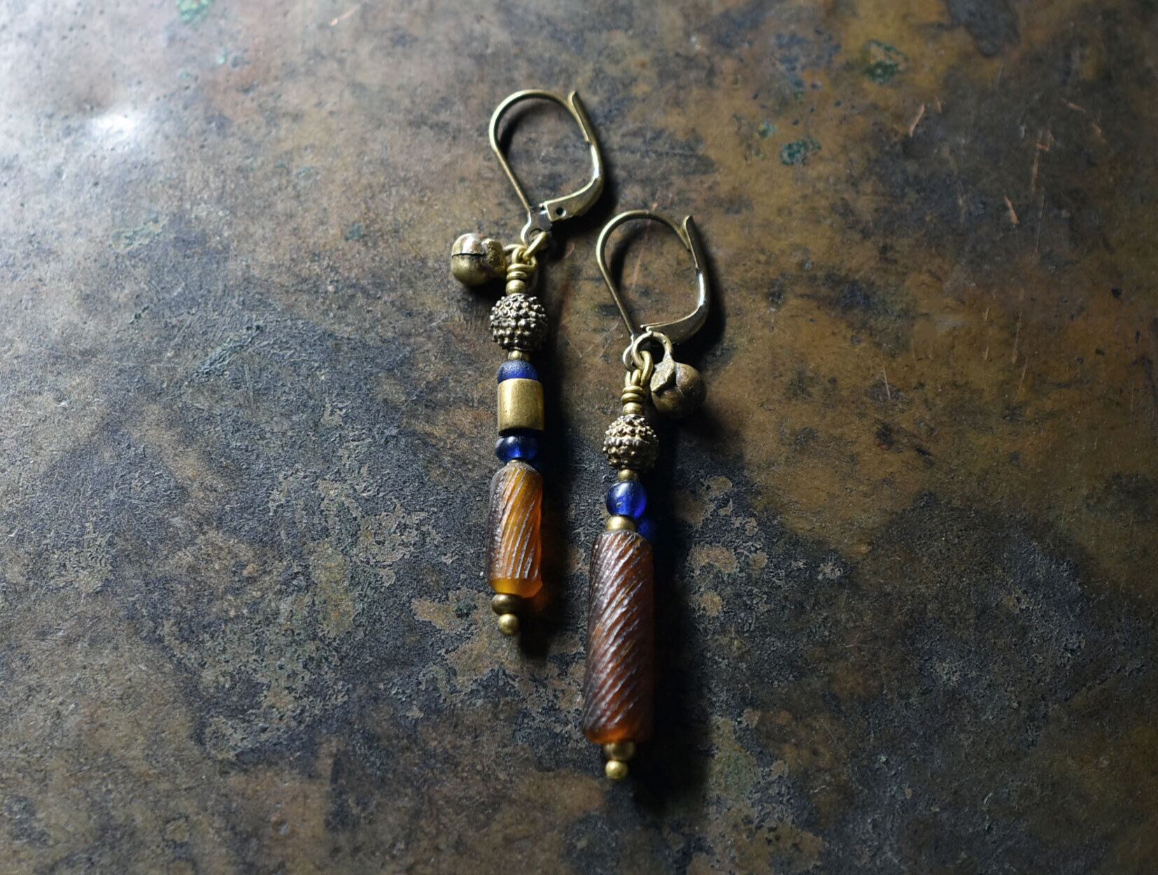琥珀&ブラウンローマングラスとoldオリッサブラス&つぶつぶブラス、ブルービーズのスリムなピアス