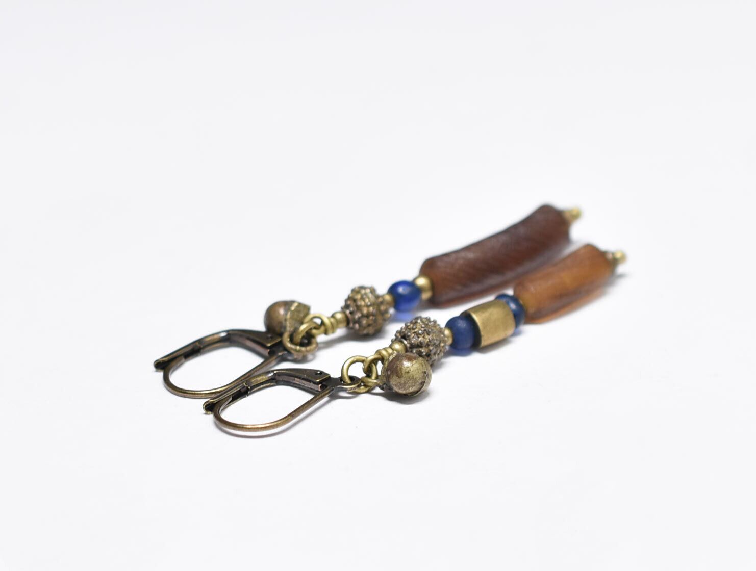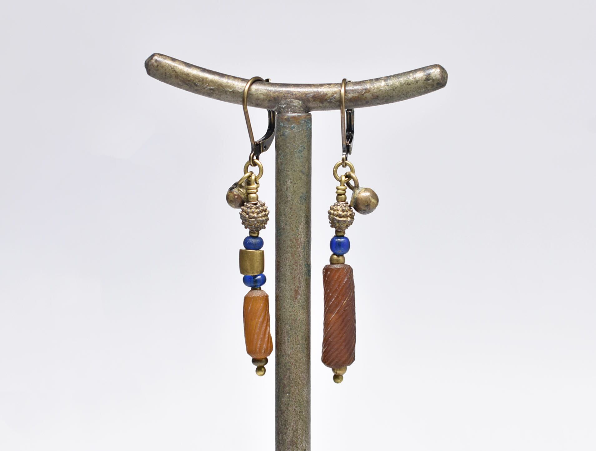 様々な古いブラスと、古代ガラスが楽しめるスリムなピアスです。