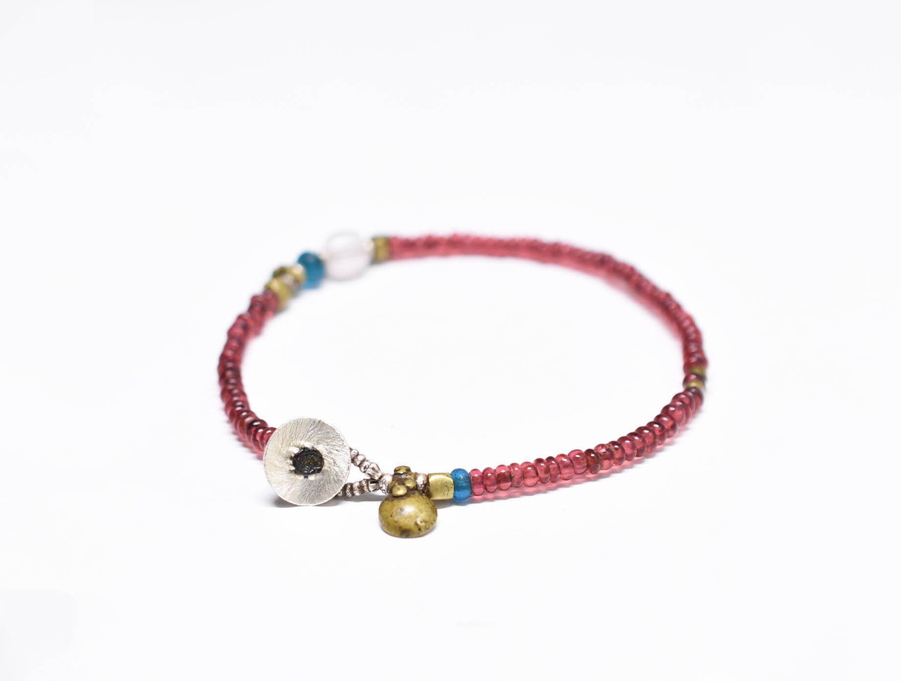 グーズベリーとエメラルドブルービーズ、金赤ビーズ、oldオリッサブラスを繋いだ華奢なブレスです。