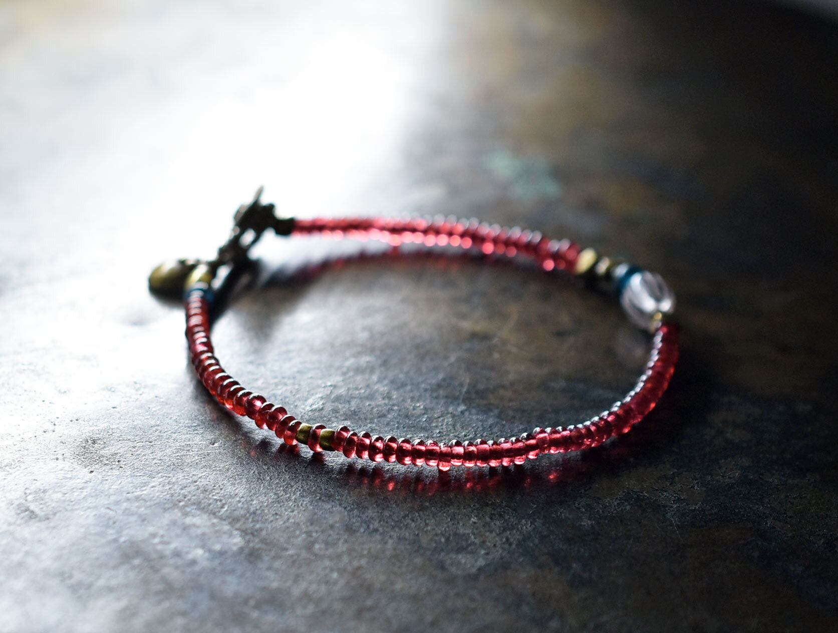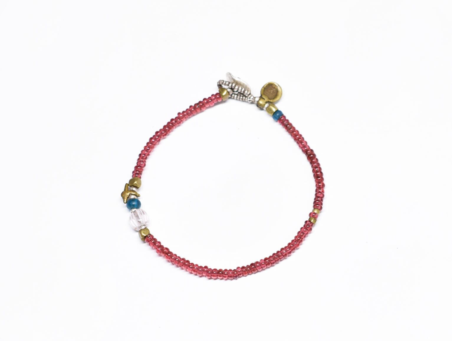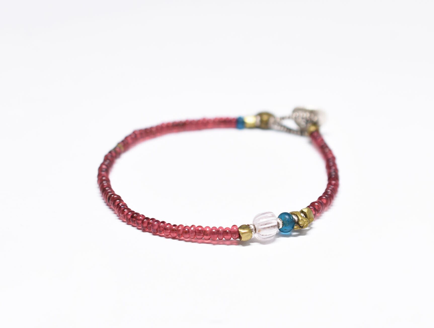 グーズベリーとエメラルドブルービーズ、金赤ビーズ、oldオリッサブラスの華奢なブレス