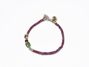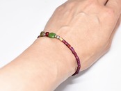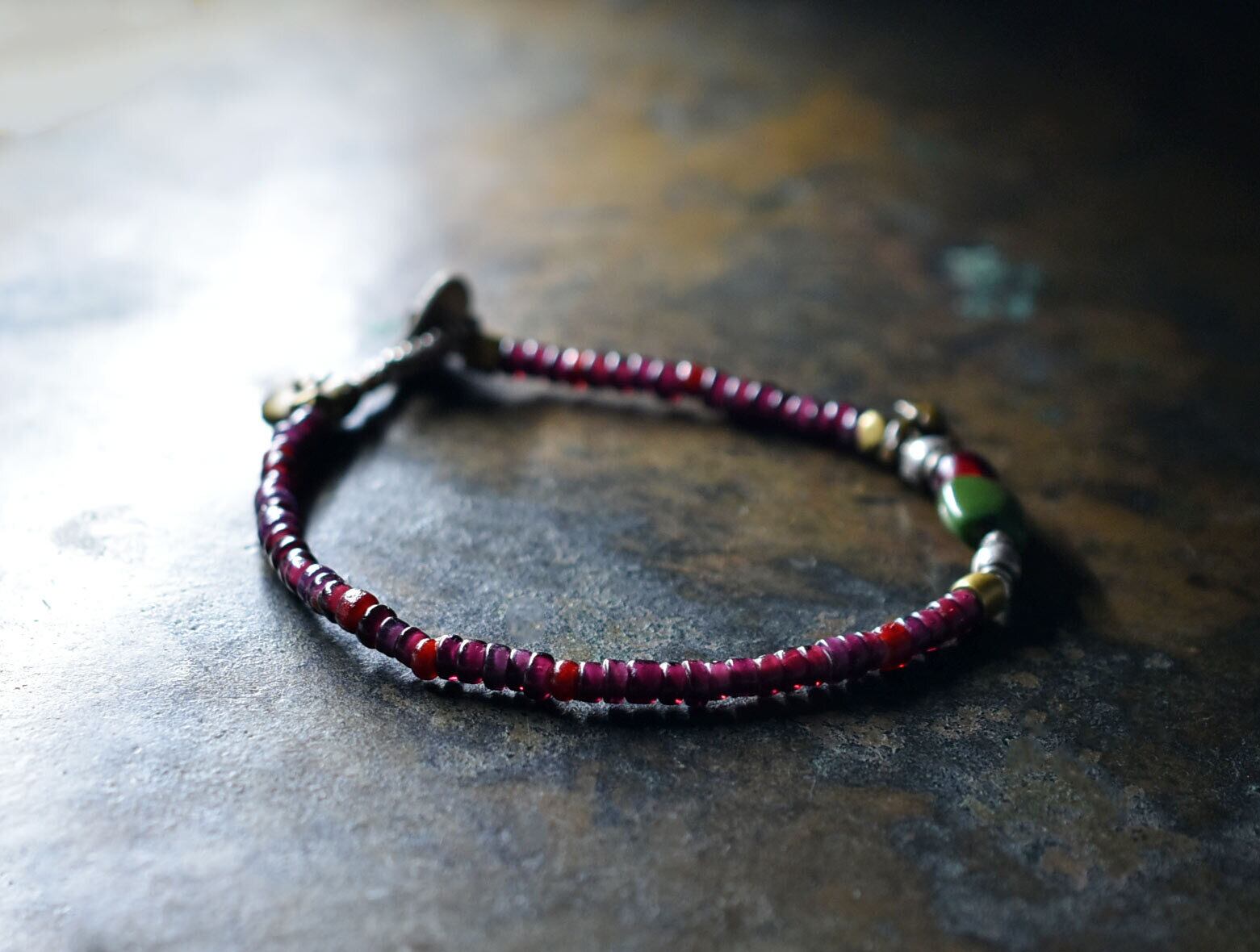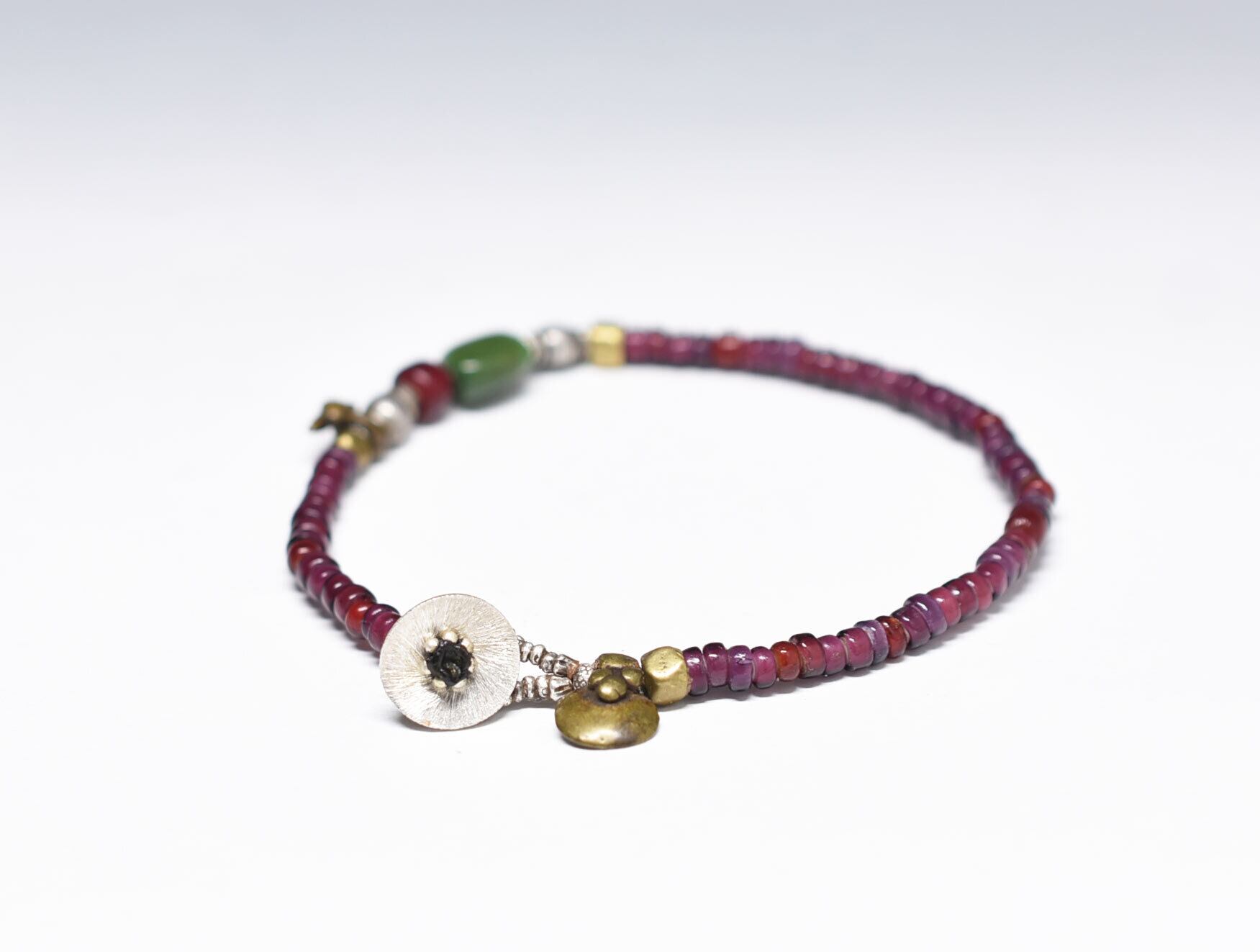 oldチベタンターコイズと血赤ホワイトハーツ、葡萄色ホワイトハーツ、oldチンシルバー&オリッサブラスの華奢なブレス