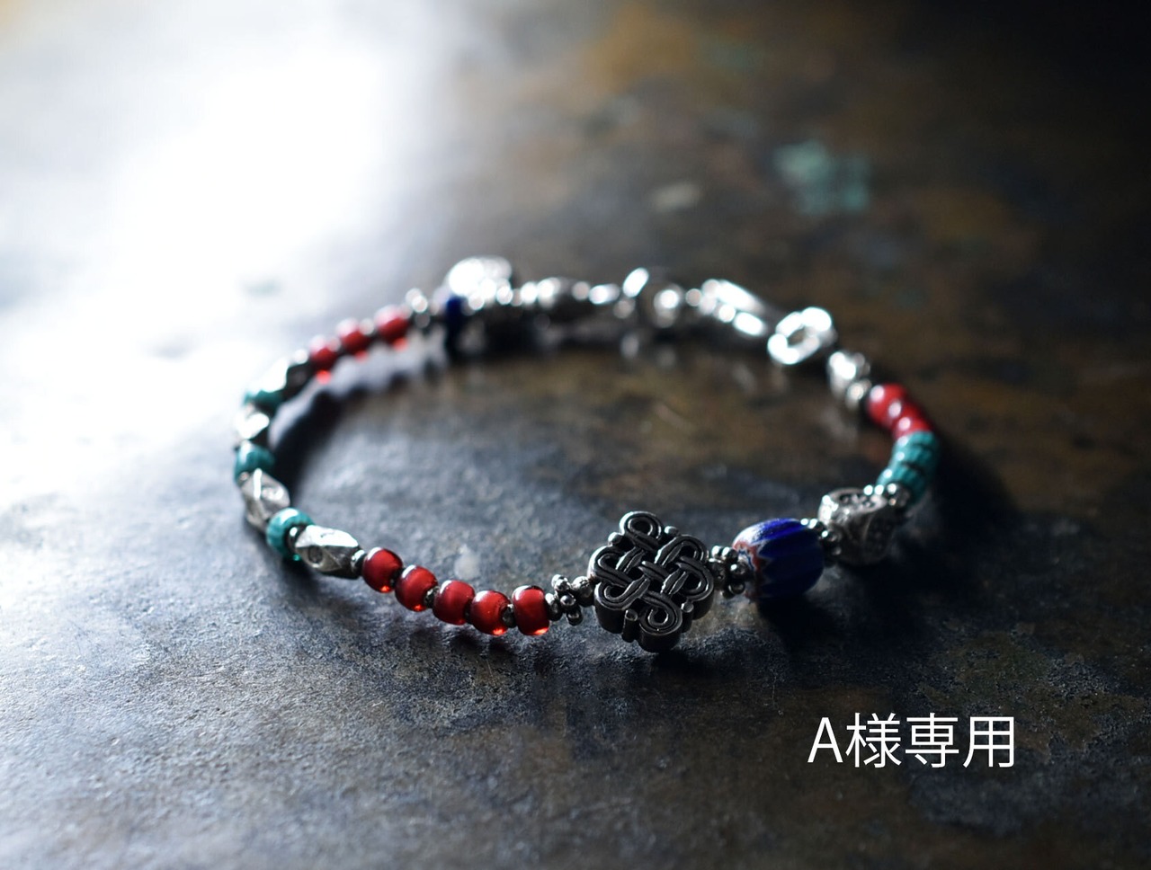 ブルーシェブロンとエンドレスノット、カレンシルバー、金赤ホワイトハーツ、ターコイズグリーンシェブロンを繋いだブレスです。